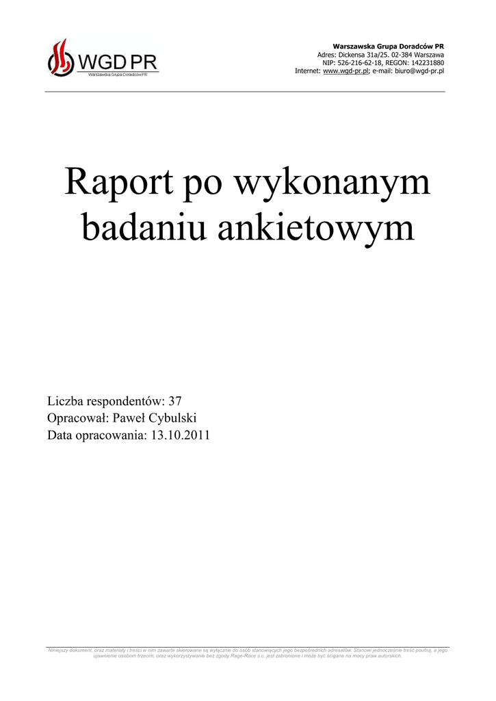 Warszawska Grupa Doradców PR Adres: Dickensa 31a/25. 02-384 Warszawa NIP: 526-216-62-18, REGON: 142231880 Internet: www.wgd-pr.pl; e-mail: [email protected] Raport po wykonanym badaniu ankietowym Liczba respondentów: 37 Opracował: Paweł Cybulski Data opracowania: 13.10.2011 Niniejszy dokument, oraz materiały i treści w nim zawarte skierowane są wyłącznie do osób stanowiących jego bezpośrednich adresatów. Stanowi jednocześnie treść poufną, a jego ujawnienie osobom trzecim, oraz wykorzystywanie bez zgody Rage-Race s.c. jest zabronione i może być ścigane na mocy praw autorskich. Warszawska Grupa Doradców PR Adres: Dickensa 31a/25. 02-384 Warszawa NIP: 526-216-62-18, REGON: 142231880 Internet: www.wgd-pr.pl; e-mail: [email protected] Celem ankiety przeprowadzonej przez Warszawską Grupę Doradców Public Relations było zbadanie profilu rzecznika prasowego pracującego dla mazowieckich urzędów. Ważnym zadaniem badania było również ustalenie, z jakich mediów informacyjnych i branżowych korzystają rzecznicy, oraz jak oni sami oceniają udostępniane w ten sposób informacje. Ankietę przeprowadzono we wrześniu i w październiku 2011 roku. Formularz ankiety został opracowany przez Pawła Cybulskiego. Wzór ankiety znaleźć można w Załączniku nr 1. Ankiety rozsyłane były przez biuro Warszawskiej Grupy Doradców Public Relations do rzeczników prasowych urzędów, szpitali, komend policji czy domów kultury. Wart odnotowania jest fakt, że na blisko 400 wysłanych ankiet, do Warszawskiej Grupy Doradców Public Relations trafiło z powrotem zaledwie 37. Część podawanych na stronach urzędów adresów było albo nieczynnych, albo też skrzynki były przepełnione, co uniemożliwiało skuteczną komunikację. Ogółem, w badaniu udział wzięło: - 26 kobiet - 11 mężczyzn Na podstawie ankiet uzyskano następujące wyniki: Pytanie 1. Czy obecnie funkcjonujące w Internecie portale z branży PR i samorządowej spełniają oczekiwania rzeczników prasowych i ekspertów ds. promocji w mazowieckich urzędach samorządowych i rządowych? 60,00% 50,00% 40,00% 30,00% 20,00% 10,00% 0,00% Zdecydowanie tak Raczej Tak Trudno powiedziec Raczej Nie Zdecydowanie nie Na podstawie uzyskanych odpowiedzi można z pewnym przekonaniem stwierdzić, że rzecznicy biorący udział w badaniu mają na ogół pochlebne zdanie o funkcjonujących obecnie serwisach branżowych (łącznie ponad 50% wskazań odpowiedzi ‘Zdecydowanie Tak’ i ‘Raczej Tak’). Z drugiej strony, blisko 1/3 ankietowanych nie ma zdania na ten temat. Uwagę zwraca też fakt unikania zdecydowanych deklaracji, czy to pozytywnych, czy negatywnych. Niniejszy dokument, oraz materiały i treści w nim zawarte skierowane są wyłącznie do osób stanowiących jego bezpośrednich adresatów. Stanowi jednocześnie treść poufną, a jego ujawnienie osobom trzecim, oraz wykorzystywanie bez zgody Rage-Race s.c. jest zabronione i może być ścigane na mocy praw autorskich. Warszawska Grupa Doradców PR Adres: Dickensa 31a/25. 02-384 Warszawa NIP: 526-216-62-18, REGON: 142231880 Internet: www.wgd-pr.pl; e-mail: [email protected] Pytanie 2. Jakie media internetowe stanowią dla rzecznika i eksperta źródło informacji ogólnej? (można wybrać więcej niż jedną odpowiedź) 30% 25% 20% 15% 10% 5% 0% Analizując odpowiedzi na to pytanie, łatwo zauważyć, iż rzecznicy prasowi informacji szukają przede wszystkim na trzech portalach: www.tvn24.pl, www.pap.pl i www.wp.pl (na każdą z tych odpowiedzi wskazało ponad 20% ankietowanych). Zwraca uwagę mała popularność Onetu i Gazety.pl – portali uznawanych za powszechnie czytane przez Internautów. Na pytanie to, ze względu na jego charakter, 37 ankietowanych udzieliło 86 odpowiedzi. Niniejszy dokument, oraz materiały i treści w nim zawarte skierowane są wyłącznie do osób stanowiących jego bezpośrednich adresatów. Stanowi jednocześnie treść poufną, a jego ujawnienie osobom trzecim, oraz wykorzystywanie bez zgody Rage-Race s.c. jest zabronione i może być ścigane na mocy praw autorskich. Warszawska Grupa Doradców PR Adres: Dickensa 31a/25. 02-384 Warszawa NIP: 526-216-62-18, REGON: 142231880 Internet: www.wgd-pr.pl; e-mail: [email protected] Pytanie 3. Jakie branżowe media internetowe stanowią dla rzecznika i eksperta ds. PR źródło informacji? (można wybrać więcej niż jedną odpowiedź) 60,00% 50,00% 40,00% 30,00% 20,00% 10,00% 0,00% Wśród mediów branżowych, zdecydowanie największą popularnością wśród rzeczników prasowych cieszy się portal www.press.pl – ponad 50% wskazań. Stosunkowo często wskazywano też na www.marketing-news.pl, www.marketing.org.pl oraz www.proto.pl. W pytaniu tym oddano łącznie 53 głosy. Niniejszy dokument, oraz materiały i treści w nim zawarte skierowane są wyłącznie do osób stanowiących jego bezpośrednich adresatów. Stanowi jednocześnie treść poufną, a jego ujawnienie osobom trzecim, oraz wykorzystywanie bez zgody Rage-Race s.c. jest zabronione i może być ścigane na mocy praw autorskich. Warszawska Grupa Doradców PR Adres: Dickensa 31a/25. 02-384 Warszawa NIP: 526-216-62-18, REGON: 142231880 Internet: www.wgd-pr.pl; e-mail: [email protected] Pytanie 4. Jakie media samorządowe stanowią dla rzecznika i eksperta źródło informacji? (można zaznaczyć więcej niż jedną odpowiedź) 50,00% 45,00% 40,00% 35,00% 30,00% 25,00% 20,00% 15,00% 10,00% 5,00% 0,00% Zdecydowaną przewagę nad pozostałymi odpowiedziami uzyskały dwie: portale www.samorzad.pap.pl oraz www.mazowieckie.pl, które ewidentnie cieszą się największym zaufaniem rzeczników prasowych. Oddano na nie odpowiednio: 46 i 35 % głosów. Respondenci oddali łącznie w tym pytaniu 68 głosów. Pytanie 5. Płeć 80,00% 70,00% 60,00% 50,00% 40,00% 30,00% 20,00% 10,00% 0,00% Kobieta Mężczyzna Niniejszy dokument, oraz materiały i treści w nim zawarte skierowane są wyłącznie do osób stanowiących jego bezpośrednich ad