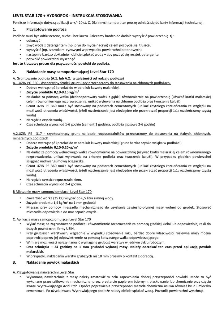 LEVEL STAR 170 + HYDROPOX - INSTRUKCJA STOSOWANIA Poniższe informacje dotyczą aplikacji w +/- 20 st. C. Dla innych temperatur proszę odnieść się do karty informacji technicznej. 1. Przygotowanie podłoża Podłoże musi być odtłuszczone, suche i bez kurzu. Zalecamy bardzo dokładnie wyczyścić powierzchnię tj.: • odkurzyć • zmyć wodą z detergentem (np. płyn do mycia naczyń) celem pozbycia się tłuszczu • wyczyścić (np. szczotkami ryżowymi w przypadku powierzchni betonowych) • następnie bardzo dokładnie i obficie spłukać wodą – aby pozbyć się resztek detergentu • pozwolić powierzchni wyschnąć Jest to kluczowy proces dla przyczepności powłoki do podłoża. 2. Nakładanie masy samopoziomującej Level Star 170 A. Gruntowanie podłoża (A.1. lub A.2. w zależności od rodzaju podłoża) A.1.UZIN PE 360 - dyspersyjny środek gruntujący przeznaczony do stosowania na chłonnych podłożach. • Dobrze wstrząsnąć i przelać do wiadra lub kuwety malarskiej. • Zużycie produktu 0,10-0,15 kg/m2 • Nakładać za pomocą wałka (drobnoporowaty wałek z gąbki) równomiernie na powierzchnię (używać kratki malarskiej celem równomiernego rozprowadzenia, unikać wylewania na chłonne podłoża oraz tworzenia kałuż!) • Grunt UZIN PE 360 może być stosowany na podłożach cementowych (unikać zbytniego rozcieńczania ze względu na możliwość utracenia właściwości, jeżeli rozcieńczanie jest niezbędne nie przekraczać proporcji 1:1; rozcieńczamy czystą wodą) • Narzędzia czyścić wodą. • Czas schnięcia wynosi od 1-6 godzin (cement 1 godzina, podłoża gipsowe 2-6 godzin) A.2.UZIN PE 317 - szybkoschnący grunt na bazie rozpuszczalników przeznaczony do stosowania na słabych, chłonnych, mineralnych podłożach • Dobrze wstrząsnąć i przelać do wiadra lub kuwety malarskiej (grunt bardzo szybko wsiąka w podłoże!) • Zużycie produktu 0,10-0,20kg/m2 • Nakładać za pomocą welurowego wałka równomiernie na powierzchnię (używać kratki malarskiej celem równomiernego rozprowadzenia, unikać wylewania na chłonne podłoża oraz tworzenia kałuż!). W przypadku gładkich powierzchni ściągnąć nadmiar gumową ściągaczką. • Grunt UZIN PE 360 może być stosowany na podłożach cementowych (unikać zbytniego rozcieńczania ze względu na możliwość utracenia właściwości, jeżeli rozcieńczanie jest niezbędne nie przekraczać proporcji 1:1; rozcieńczamy czystą wodą). • Narzędzia czyścić rozpuszczalnikiem. • Czas schnięcia wynosi od 2-4 godzin. B Mieszanie masy samopoziomującej Level Star 170 • • • Zawartość worka (25 kg) wsypać do 6,5 litra zimnej wody. Zużycie produktu 1,4 kg/m2 na 1 mm grubości Mieszać przy pomocy mieszadła mechanicznego do uzyskania zawiesito-płynnej masy wolnej od grudek. Stosować mieszadła odpowiednie do mas szpachlowych. C. Aplikacja masy samopoziomującej Level Star 170 • Wylać masę na zagruntowane podłoże i równomiernie rozprowadzić za pomocą gładkiej kielni lub odpowiedniej rakli do dużych powierzchni firmy UZIN. • Przy grubszych warstwach, względnie w wypadku stosowania rakli, bardzo dobre właściwości rozlewne masy można poprawić poprzez jej odpowietrzenie za pomocą kolczastego wałka odpowietrzającego. • W miarę możliwości należy nanosić wymaganą grubość warstwy w jednym cyklu roboczym. • Czas schnięcia – 24 godziny na 1 mm grubości wylanej masy. Należy odczekać ten czas przed aplikacją powłok malarskich. • W przypadku nakładania warstw grubszych niż 10 mm prosimy o kontakt z doradcą. 3. Nakładanie powłok malarskich A. Przygotowanie naiwerzchni Level Star • Wykonaną nawierzchnię z masy należy zmatowić w celu zapewnienia dobrej przyczepności powłoki. Może to być wykonane przez szlifowanie mechaniczne, przez przetarcie papierem ściernym, piaskowanie lub chemicznie przy użyciu Kwasu Wytrawiającego Acid Etch. Oprócz poprawienia przyczepności metoda chemiczna usuwa również brud i mleczko cementowe. Po użyciu Kwasu Wytrawiającego podłoże należy obficie spłukać wodą. Pozwolić powierzchni wyschnąć. B. Gruntowanie RO 3333. • Należy zastosować jedną warstwę RO 3333. Wydajność w przybliżeniu 35m 2/l • Należy wymieszać bazę z aktywatorem, w takim stosunku jak jest to przygotowane fabrycznie, mechanicznie (wiertarka) około 3-5 min. Bardzo ważne aby produkty były bardzo dokładnie wymieszane. • Stosunek mieszania: wagowo Baza 1,05kg – Utwardzacz 0,45kg; objętościowo Baza 0,72l – Utwardzacz 0,28l. • Następnie należy dodać 20% czystej wody i także wymieszać razem z RO 3333. • Czas stosowania: po wymieszaniu: 1,5-2 godziny. • Czas schnięcia minimum 16 godzin. C. Mieszanie produktu Hydropox Hydorpox to dwuskładnikowy, wodorozcieńczalny epoksyd. Słabe wymieszanie aktywatora z bazą może skutkować złą przyczepnością, matowym wykończeniem oraz powstawaniem pęcherzy powietrza dlatego... • Aktywator należy powoli dodać do bazy. Mieszać mechanicznie np. wiertarką wyposażoną w mieszadło do mieszania farb. Koniecznie proszę mieszać za pomocą mieszadła mechanicznego, aby składniki się dobrze połączyły. • Z powodu różnicy w lepkości obu składników, zalecane jest zeskrobanie bazy i utwardzacza z dna i ścianek puszki i dokładne wymieszanie ich. • Należy mieszać aż do uzyskania jednorodnej masy o jednolitym kolorze około 5 minut dla 15 kg opakowania. • Indukcja: po zmieszaniu należy odczekać około 5 minut w celu pozbycia się pęcherzy powietrza. • Czas stosowania: po wymieszaniu: 1,5-2 godziny. Po tym czasie od wymieszania Hydropox nie nadaje się do użycia!! Nawet jeżeli da się nim malować po 2 godzinach - to powłoka traci przyczepność, wytrzymałość oraz połysk. • Stosunek mieszania: 86% baza do 14% utwardzacz - wagowo (tak przygotowane są komplety 4 i 15kg). • Stosunek mieszania objętościowo: Baza 0,83l utwar