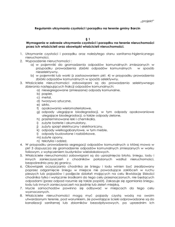 „projekt” Regulamin utrzymania czystości i porządku na terenie gminy Barcin §1 Wymagania w zakresie utrzymania czystości i porządku na terenie nieruchomości przez ich właścicieli oraz obowiązki właścicieli nieruchomości. 1. Utrzymanie czystości i porządku oraz należytego stanu sanitarno-higienicznego nieruchomości. 2. Wyposażenie nieruchomości : a) w pojemniki do gromadzenia odpadów komunalnych zmieszanych w przypadku prowadzenia zbiórki odpadów komunalnych w sposób nieselektywny. b) w pojemniki lub worki (z zastosowaniem pkt. 4) w przypadku prowadzenia zbiórki odpadów komunalnych w sposób selektywny. 3. Właściciele nieruchomości zobowiązani są do prowadzenia selektywnego zbierania następujących frakcji odpadów komunalnych: a) niesegregowane (zmieszane) odpady komunalne, b) papier, c) metal, d) tworzywo sztuczne, e) szkło, f) opakowania wielomateriałowe, g) odpady ulegające biodegradacji, w tym odpady opakowaniowe ulegające biodegradacji, a także odpady zielone, h) przeterminowane leki i chemikalia, i) zużyte baterie i akumulatory, j) zużyty sprzęt elektryczny i elektroniczny, k) odpady wielkogabarytowe, w tym meble, l) odpady budowlane i rozbiórkowe, m) zużyte opony, n) tekstylia i odzież. 4. W przypadku prowadzenia segregacji odpadów komunalnych o której mowa w pkt 3 dopuszcza się gromadzenie odpadów komunalnych zmieszanych w worku foliowym, z wyłączeniem budynków wielolokalowych. 5. Właściciele nieruchomości zobowiązani są do uprzątnięcia błota, śniegu, lodu i innych zanieczyszczeń z chodników położonych wzdłuż nieruchomości, bezpośrednio przy jej granicy. 6. Obowiązek oczyszczania chodnika ze śniegu i lodu winien być zrealizowany poprzez odgarnięcie śniegu w miejsce nie powodujące zakłóceń w ruchu pieszych lub pojazdów i podjęcie działań mających na celu likwidację śliskości chodnika tylko i wyłącznie środkami do tego celu przeznaczonych, nie będących odpadami (przez odpad rozumie się także popiół). Zakazuje się zgarniania śniegu, lodu lub innych zanieczyszczeń na jezdnię lub zieleń miejską. 7. Mycie samochodów powinno się odbywać w miejscach do tego celu wyznaczonych. 8. Właściciele nieruchomości mogą myć pojazdy czystą wodą na swoim utwardzonym terenie, pod warunkiem, że powstające ścieki odprowadzane są do kanalizacji sanitarnej lub zbiorników bezodpływowych, po uprzednim ich podczyszczeniu. Odprowadzenie ścieków bezpośrednio do gleby lub wód powierzchniowych jest zabronione. 9. Właściciel samochodu może dokonywać doraźnych napraw związanych z bieżącą eksploatacją pojazdu w obrębie nieruchomości pod warunkiem, że czynności te nie będą powodować zanieczyszczeń wód i gleby oraz uciążliwości dla sąsiadów, z wyłączeniem tych napraw, które powinny być przeprowadzane w specjalistycznych warsztatach, §2 Rodzaj i minimalne pojemności pojemników przeznaczonych do zbierania odpadów komunalnych na terenie nieruchomości oraz na drogach publicznych oraz warunki rozmieszczenia tych pojemników i ich utrzymania w odpowiednim stanie sanitarnym, porządkowym i technicznym. 1. Do gromadzenia odpadów komunalnych zmieszanych przeznacza się szczelne pojemniki metalowe lub z tworzyw sztucznych. 2. Dopuszcza się gromadzenie odpadów komunalnych zmieszanych w worku foliowym wyłącznie w przypadku prowadzenia obowiązkowej segregacji odpadów komunalnych określonej w § 1 pkt. 3 oraz w uwzględnieniem zapisu § 1 pkt. 4 niniejszego regulaminu. 3. Do gromadzenia odpadów komunalnych segregowanych: tworzywo sztuczne, papier, szkło, metal, opakowania wielomateriałowe i bioodpady, w tym odpady zielone przeznacza się szczelne pojemniki lub worki (z uwzględnieniem zapisu § 1 pkt. 4 niniejszego regulaminu). 4. Worki do gromadzenia odpadów segregowanych o których mowa w pkt 3 powinny być wykonane z materiału, którego struktura nie będzie powodowała ich rozdarcia lub przesiąkania w wyniku nagromadzenia odpadów. 5. Pojemność pojemników do zbierania i gromadzenia odpadów komunalnych ustala się: od 60 litrów do 10.000 litrów. 6. Minimalną pojemność worków do zbierania i gromadzenia odpadów komunalnych segregowanych ustala się na co najmniej 20 litrów. 7. Do gromadzenia odpadów na drogach publicznych służą kosze uliczne o pojemności od 5 do 35 litrów, 8. Właściciel nieruchomości zobowiązany jest zbierać niesegregowane (zmieszane) odpady komunalne w pojemnikach o minimalnej pojemności uwzględniającej tygodniowe wielkości wytwarzania odpadów: a) 30 l – na osobę w budynkach mieszkalnych jednorodzinnych i wielolokalowych, b) 3 l – na każdego pracownika i ucznia przebywającego na terenie szkoły wszelkiego typu, przedszkola, żłobka, c) 5 l – na jedno łóżko lub miejsce w szpitalach, hotelach, domach opieki i itp., d) 5 l – na jedno miejsce konsumpcyjne w lokalach gastronomicznych, e) 5 l – na 1 jednego pracownika w zakładach rzemieślniczych, usługowych, handlowych, produkcyjnych, magazynach, hurtowniach, placach budowy, biurach, urzędach, przychodniach, gabinetach lekarskich, lecznicach, aptekach, obiektach użyteczności publicznej w wyłączeniem obiektów wymienionych w ppkt b) – d), f) 5 l – na 1 pracownika w stacjonarnych punktach handlowych zlokalizowanych poza budynkami, typu kiosk, punkty szybkiej konsumpcji, kwiaciarnie, g) 10 l – na 1 działkę w ogródkach działkowych w okresie od dnia 1 marca do dnia 30 listopada każdego roku, a w przypadku przebywania osób poza tym okresem – 3 l , h) 2 l – na 1 miejsce pochówku, a w dniach przypadających na okres np.: Świąt Bożego Narodzenia, Wielkanocy, 1 i 2 listopada dodatkowe ustawienie pojemnika o minimalnej pojemności 1100 l. i) 2 l – na 1 garaż znajdujący się w zespole garaży. 9. Właściciel nieruchomości ma obowiązek utrzymania pojemników na odpady komunalne zmieszane we właściwym stanie sanitarnym, porządkowym i t
