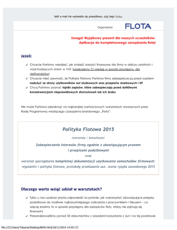 Chcą Państwo poznać tajniki zapisów, które zabezpieczają przed dotkliwymi konsekwencjami nieprawidłowych sformułowań lub ich braku? Jeśli e-mail nie wyświetla się prawidłowo, użyj tego linka. Organizator: Uwaga! Wyjątkowy prezent dla naszych uczestników. Aplikacja do kompleksowego zarządzania flotą! Jeżeli: Chcecie Państwo wiedzieć, jak znaleźć korzyści finansowe dla firmy w obliczu ostatnich i nadchodzących zmian w VAT (przekażemy Ci wiedzę w sposób przystępny, dla niefinansistów) Chcecie mieć pewność, że Polityka Flotowa Państwa firmy zabezpiecza ją przed ryzykiem nadużyć ze strony użytkowników aut służbowych oraz przepisów skarbowych i KP Chcą Państwo poznać tajniki zapisów, które zabezpieczają przed dotkliwymi konsekwencjami nieprawidłowych sformułowań lub ich braku Nie może Państwa zabraknąć na najbardziej wartościowych warsztatach stworzonych przez Radę Programową wiodącego czasopisma branżowego „Flota”: Polityka Flotowa 2015 (warsztaty + konsultacje) Zabezpieczenie interesów firmy zgodnie z obowiązującym prawem i przepisami podatkowymi oraz warsztat sporządzania kompletnej dokumentacji użytkowania samochodów firmowych: regulamin i polityka flotowa, protokoły przekazania aut, ocena ryzyka zawodowego 2015 Dlaczego warto wziąć udział w warsztatach? Tylko u nas uzyskasz prostą odpowiedź na pytanie, jak wykorzystać obowiązujące przepisy podatkowe do możliwie najkorzystniejszego rozliczenia z pracownikiem i fiskusem – co więcej zrobimy to w sposób przystępny dla zarządców floty, którzy nie zajmują się finansami Przeanalizowaliśmy ponad 50 dokumentów z zasadami korzystania z aut i na tej podstawie file:///C|/Users/Tatyana/Desktop/8645.html[18/11/2014 14:55:17] stworzyliśmy dokument wzorcowy, który zabezpiecza ponad 200 rodzajów nadużyć, wypadków i problemów w świetle obowiązującego prawa: podatkowego, Prawa Pracy i innych przepisów Wprowadzą Państwo dodatkowe zapisy do dokumentacji, które całkowicie zabezpieczą Państwa przed ryzykiem związanym z nadużyciami w trakcie korzystania z aut służbowych Na dokumenty spojrzymy z punktu widzenia interesów: Szefa firmy, księgowości, zarządcy floty i użytkownika – tylko u nas tak kompleksowe podejście W ciągu jednego dnia przekażemy Państwu wiedzę. Aby pozyskać te informacje musiałbyś konsultować się osobno z prawnikiem, Urzędem Skarbowym i Państwową Inspekcją Pracy. Z czym wrócisz do swojej firmy po warsztatach? Z gotowymi pomysłami na zapisy, które w pełni uchronią Ciebie oraz firmę przed odpowiedzialnością finansową Z poczuciem bezpieczeństwa, że przewidziałeś i zabezpieczyłeś osobiście możliwe roszczenia, sytuacje sporne i problemy z odzyskaniem ubezpieczeń i odszkodowań Z pewnością, że w trakcie kontroli Urzędu Kontroli Skarbowej lub Państwowej Inspekcji Pracy nie zostaną wykazane uchybienia, za które grożą wysokie mandaty karne Program warsztatów 1. Jak korzystanie rozliczać VAT od samochodów, paliwa i części eksploatacyjnych zabezpieczając jednocześnie własną odpowiedzialność karnoskarbową w okresie zmian podatkowych? a. Od których wydatków związanych z użytkowaniem samochodu służbowego można odliczać 50 % a od których 100 % VAT, np.: przejazd autostradą, oklejenie samochodu reklamą, usługi parkingowe, zakup GPS, wynajem samochodu pracownikowi. b. Przepisy przejściowe nowelizacji VAT – wpływ na umowy leasingu zawarte przed nowelizacją oraz wymogi formalne związane z wykorzystywaniem pojazdów wyłącznie dla celów działalności gospodarczej. c. Jak korzystnie rozliczyć wykorzystanie samochodów do celów prywatnych podatnika lub pracowników? d. Jak zabezpieczyć swoją odpowiedzialność karnoskarbową przy dopełnianiu obowiązków formalno-dokumentacyjnych dla pełnego odliczenia podatku VAT przy nabyciu pojazdu. file:///C|/Users/Tatyana/Desktop/8645.html[18/11/2014 14:55:17] e. Kiedy ma szansę wejść w życie ryczałtowe opodatkowanie użytkowania aut służbowych i jak w praktyce będzie działał ten system? 2. Teczka dokumentów w administrowaniu samochodami służbowymi 2015: a. Jakie dokumenty są niezbędne przy przekazaniu aut służbowych? b. Jak prawidłowo sporządzić ocenę ryzyka na stanowisku kierowcy wg przepisów Prawa Pracy 2014/2015? c. Protokoły przekazania aut służbowych – przykłady d. Wzory upoważnień do korzystania z aut służbowych e. Zarządzanie i przechowywanie kart eksploatacyjnych i drogowych – przykłady najskuteczniejszych rozwiązań 3. Zapobieganie nadużyciom kierowców w odniesieniu do kodeksu pracy 2014/2015 oraz konkretne narzędzia motywujące do odpowiedzialności za powierzone mienie: a. Jak w praktyce egzekwować odpowiedzialność materialną pracownika w przypadku wyrządzenia szkody z winy nieumyślnej i nieumyślnej oraz jakie są skuteczne środki zapobiegawcze? b. Jakie dokumenty powinieneś dać pracownikowi do podpisu, aby stworzyć skuteczną procedurę zapobiegania szkodom na mieniu pracodawcy – przykłady dokumentów c. Sposoby zabezpieczenia przyszłych roszczeń pracodawcy w świetle Kodeksu Pracy 2014/2015 d. Zarządzanie flotą samochodów służbowych – wdrażanie środków spoza prawa, wpływających na ograniczenie szkód na mieniu pracodawcy e. Użytkowanie samochodu w celach pozaregulaminowych – przypadki wraz ze wskazaniem konkretnego zapisu ubezpieczeniowego f. Wyłudzenia. Paliwo, akcesoria, zakupy – co robią kierowcy, kiedy ich nie widzisz g. Oszukiwanie urządzeń monitoringu – jakie zabezpieczenia wprowadzić do dokumentów firmowych h. Katalog wykroczeń kierowców, za które odpowiedzialność ponosi firma wraz ze wskazaniem najskuteczniejszego sposobu prewencji i. Wyłudzenia finansowe kierowców 4. Przemyślana polityka flotowa gwarantująca „spokojną głowę” w rzeczywistości flotowej 2015: a. Zasady udostępniania samochodów pracownikom b. Jak z