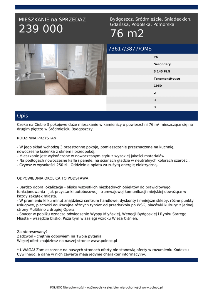 MIESZKANIE na SPRZEDAŻ 239 000 Bydgoszcz, Śródmieście, Śniadeckich, Gdańska, Podolska, Pomorska 76 m2 73617/3877/OMS 76 Secondary 3 145 PLN TenementHouse 1950 2 3 3 Opis Czeka na Ciebie 3 pokojowe duże mieszkanie w kamienicy o powierzchni 76 m² mieszczące się na drugim piętrze w Śródmieściu Bydgoszczy. RODZINNA PRZYSTAŃ - W jego skład wchodzą 3 przestronne pokoje, pomieszczenie przeznaczone na kuchnię, nowoczesne łazienka z oknem i przedpokój, - Mieszkanie jest wykończone w nowoczesnym stylu z wysokiej jakości materiałów. - Na podłogach nowoczesne kafle i panele, na ścianach gładzie w neutralnych kolorach szarości. - Czynsz w wysokości 250 zł . Oddzielnie opłata za zużytą energię elektryczną. ODPOWIEDNIA OKOLICA TO PODSTAWA - Bardzo dobra lokalizacja - blisko wszystkich niezbędnych obiektów do prawidłowego funkcjonowania - jak przystanki autobusowej i tramwajowej komunikacji miejskiej dowożące w każdy zakątek miasta. - W promieniu kilku minut znajdziesz centrum handlowe, dyskonty i mniejsze sklepy, różne punkty usługowe, placówki edukacyjne różnych typów: od przedszkola po WSG, placówki kultury: z jednej strony Multikino z drugiej Opera. - Spacer w pobliżu oznacza odwiedzenie Wyspy Młyńskiej, Wenecji Bydgoskiej i Rynku Starego Miasta – wszędzie blisko. Poza tym w zasięgi wzroku Wieża Ciśnień. Zainteresowany? Zadzwoń - chętnie odpowiem na Twoje pytania. Więcej ofert znajdziesz na naszej stronie www.polnoc.pl * UWAGA! Zamieszczone na naszych stronach oferty nie stanowią oferty w rozumieniu Kodeksu Cywilnego, a dane w nich zawarte mają jedynie charakter informacyjny. PÓŁNOC Nieruchomości - ogólnopolska sieć biur nieruchomości www.polnoc.pl Mateusz Zubik tel. 731-071-531 email: [email protected] PÓŁNOC Nieruchomości - ogólnopolska sieć biur nieruchomości www.polnoc.pl Powered by TCPDF (www.tcpdf.org)