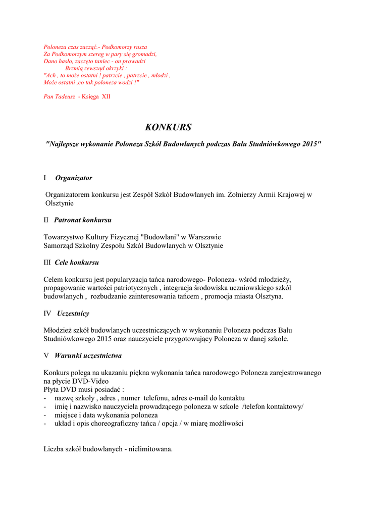 Poloneza czas zacząć.- Podkomorzy rusza Za Podkomorzym szereg w pary się gromadzi, Dano hasło, zaczęto taniec - on prowadzi Brzmią zewsząd okrzyki : "Ach , to może ostatni ! patrzcie , patrzcie , młodzi , Może ostatni ,co tak poloneza wodzi !" Pan Tadeusz - Księga XII KONKURS "Najlepsze wykonanie Poloneza Szkół Budowlanych podczas Balu Studniówkowego 2015" I Organizator Organizatorem konkursu jest Zespół Szkół Budowlanych im. Żołnierzy Armii Krajowej w Olsztynie II Patronat konkursu Towarzystwo Kultury Fizycznej "Budowlani" w Warszawie Samorząd Szkolny Zespołu Szkół Budowlanych w Olsztynie III Cele konkursu Celem konkursu jest popularyzacja tańca narodowego- Poloneza- wśród młodzieży, propagowanie wartości patriotycznych , integracja środowiska uczniowskiego szkół budowlanych , rozbudzanie zainteresowania tańcem , promocja miasta Olsztyna. IV Uczestnicy Młodzież szkół budowlanych uczestniczących w wykonaniu Poloneza podczas Balu Studniówkowego 2015 oraz nauczyciele przygotowujący Poloneza w danej szkole. V Warunki uczestnictwa Konkurs polega na ukazaniu piękna wykonania tańca narodowego Poloneza zarejestrowanego na płycie DVD-Video Płyta DVD musi posiadać : - nazwę szkoły , adres , numer telefonu, adres e-mail do kontaktu - imię i nazwisko nauczyciela prowadzącego poloneza w szkole /telefon kontaktowy/ - miejsce i data wykonania poloneza - układ i opis choreograficzny tańca / opcja / w miarę możliwości Liczba szkół budowlanych - nielimitowana. Płytę należy przesłać do sekretariatu szkoły ZSB Olsztyn do 20 marca 2015 z dopiskiem "Konkurs Poloneza" VI Kryteria oceniania i nagradzania prac Jury oceniające Poloneza weźmie pod uwagę : - oryginalność i perfekcję wykonania tańca - wykorzystanie ciekawego układu choreograficznego - odzwierciedlenie w układzie tanecznym poloneza założonych kryteriów choreograficznych /zgodność/ VII Ogłoszenie wyników Podsumowanie konkursu połączone z ogłoszeniem wyników odbędzie się do 31 marca 2015 Organizatorzy powiadomią nagrodzone szkoły odrębnym pismem. Miejsca od I do III będą nagrodzone pucharami. Każda szkoła uczestnicząca w konkursie otrzyma dyplom i podziękowanie. Nagrodzone Polonezy /filmy/ zostaną zaprezentowanie na facebook.com/ ZSB Olsztyn w celu szerszej popularyzacji. VII Postanowienia końcowe 1. Interpretacja konkursu oraz jego regulamin należy wyłącznie do komisji konkursowej 2. Nad prawidłowym przebiegiem konkursu czuwać będzie jury powołane prze z organizatorów 3. Jury zastrzega sobie prawo podziału nagród 4. Od postanowień jury nie przysługuje odwołanie 5. Dostarczone płyty nie podlegają zwrotowi 6. Informacje na temat konkursu udziela : Zespół Szkół Budowlanych im. Żołnierzy Armii Krajowej ul. Żołnierska 15 10-558 Olsztyn tel. 89/527-97-87 kom.603-59-62-59 -organizatorAndrzej Klich [email protected] Olsztyn .XII .2014 Wszystkich serdecznie zapraszamy i życzymy sukcesów