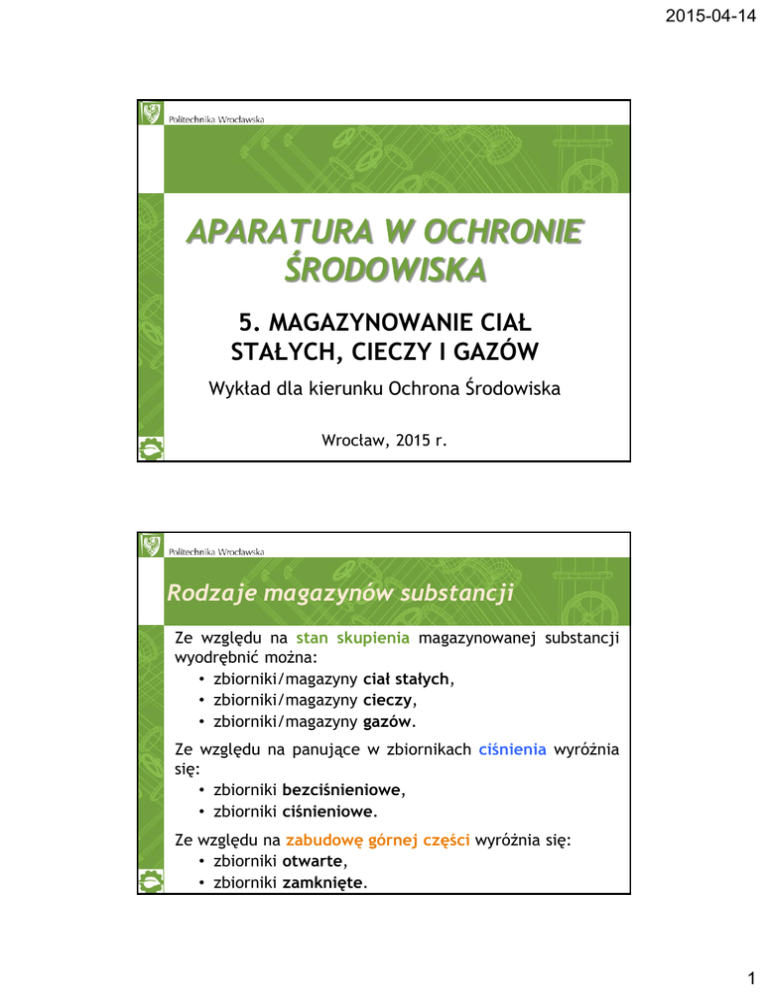 2015-04-14 APARATURA W OCHRONIE ŚRODOWISKA - 5. MAGAZYNOWANIE CIAŁ STAŁYCH, CIECZY I GAZÓW Wykład dla kierunku Ochrona Środowiska Wrocław, 2015 r. Rodzaje magazynów substancji Ze względu na stan skupienia magazynowanej substancji wyodrębnić można: • zbiorniki/magazyny ciał stałych, • zbiorniki/magazyny cieczy, • zbiorniki/magazyny gazów. Ze względu na panujące w zbiornikach ciśnienia wyróżnia się: • zbiorniki bezciśnieniowe, • zbiorniki ciśnieniowe. Ze względu na zabudowę górnej części wyróżnia się: • zbiorniki otwarte, • zbiorniki zamknięte. 1 2015-04-14 Rodzaje magazynów substancji Ze względu na rodzaj materiału użytego do konstrukcji można wyróżnić zbiorniki/magazyny: • metalowe, np.: – – – – • • • • • • ze stali węglowych; ze stali stopowych; aluminiowe; miedziane; murowane z cegły; betonowe; ceramiczne; z tworzyw sztucznych; z kompozytów; drewniane. Oznaczenia symboliczne BN-72/2200-01, ISO 10628 Do magazynowania wykorzystuje się: 1. zbiorniki (naczynia) otwarte: a) pionowe; b) poziome, 2. zbiorniki (naczynia) zamknięte bezciśnieniowe: a) pionowe; b) poziome, 3. zbiorniki zamknięte ciśnieniowe: a) pionowe; b) poziome; 2 2015-04-14 Oznaczenia symboliczne BN-72/2200-01, ISO 10628 4. powierzchnie magazynowe otwarte; 5. pomieszczenia zamknięte; 6. butle (cylindry); 7. worki; 8. beczki. Właściwości magazynowanych ciał stałych ― gęstość nasypowa ― przykłady Materiał Gęstość nasypowa, kg/m3 Materiał Gęstość nasypowa, kg/m3 piasek rzeczny 1700 ÷ 1800 węgiel kamienny orzech 750 ÷ 1000 piasek kopany 0 ÷ 2 mm 1700 węgiel kamienny drobny 800 ÷ 850 żwir ~1700 węgiel kamienny gruby 650 ÷ 780 cement 1000 ÷ 1600 wapno hydratyzowane 430 ÷ 540 chlorek sodu 1140 koks 460 ÷ 530 3 2015-04-14 Właściwości magazynowanych ciał stałych ― kąt naturalnego zsypu ― przykłady Materiał Średnia wartość kąta naturalnego zsypu koks 35 ÷ 50 węgiel kamienny gruby 45 węgiel kamienny orzech 45 węgiel kamienny drobny 30 ÷ 35 cement 30 ÷ 40 Magazynowanie ciał stałych ― magazyny otwarte Magazyn na wolnym powietrzu z dźwignicą mostową: 1 – szyna jezdna, 2 – pomost, 3 – wózek chwytaka, 4 – kabina maszynisty, 5 – magazyn otwarty, 6 – wagon, 7 – materiał magazynowany, 8 – chwytak (czerpak), 9 – słupy nośne Źródło: Koch R., Noworyta A., Procesy mechaniczne w inżynierii chemicznej. Wydawnictwa NaukowoTechniczne, Warszawa, 1998 4 2015-04-14 Magazynowanie ciał stałych ― pryzmy Przykryte Statycznie Napowietrzane Pryzmy w kompostowni Pryzmy sezonowanego urobku czerpalnego Źródło: wcinatcol.home.pl/?page_id=651 (przeznaczenie: kształtowanie krajobrazu, rekultywacja składowisk odpadów) Źródło: www.dredgdikes.eu/pl/what-are-dredgedmaterials-751 Magazynowanie ciał stałych ― magazyny półotwarte Wiata magazynowa Źródło: www.k3agro.pl/node/291 Hala łukowa Źródło:test.jacol.com.pl/index.php?page=nowosci&nowo sci=polyplus 5 2015-04-14 Magazynowanie ciał stałych ― magazyny zamknięte Źródło: protan-elmark.com.pl/hale-magazynowe/ Magazynowanie ciał stałych ― magazyny jednopiętrowe Zamknięta hala magazynowa dla materiałów sypkich: 1 – hala, 2, 3, 5, 6 – transportery taśmowe, 4 – urządzenia czerpakowe, 7 – materiał składowany Źródło: Koch R., Noworyta A., Procesy mechaniczne w inżynierii chemicznej. Wydawnictwa Naukowo-Techniczne, Warszawa, 1998 6 2015-04-14 Magazynowanie ciał stałych ― magazyny wielopiętrowe Magazyn wielopiętrowy: 1 – materiał drobnicowy, 2 – materiał sypki, 3 – wyciąg Źródło: Koch R., Noworyta A., Procesy mechaniczne w inżynierii chemicznej. Wydawnictwa Naukowo-Techniczne, Warszawa, 1998 Magazynowanie ciał stałych ― zasobniki a) b) c) d) e) Typy zasobników: a) o przekroju kwadratowym, b) o przekroju prostokątnym, c) o przekroju kwadratowym z czterema lejami wysypowymi, d) i e) o przekroju kołowym 7 2015-04-14 Magazynowanie ciał stałych ― silosy Silos betonowy do magazynowania materiałów sypkich: 1 – przenośniki taśmowe, 2 – przenośnik kubełkowy, 3 – zgarniaki (spychacze) Źródło: Koch R., Noworyta A., Procesy mechaniczne w inżynierii chemicznej. Wydawnictwa Naukowo-Techniczne, Warszawa, 1998 Zasobniki i silosy w ochronie środowiska ― przykłady • silosy kamienia odsiarczania; wapiennego ― instalacje Silos kamienia wapiennego nr 3 w Elektrowni Turów (Zmagazynowany kamień wapienny przy pomocy przenośnika dozowany jest do kruszarki, gdzie ma miejsce jego kruszenie) Źródło: www.elturow.pgegiek.pl/index.php/projekty-unije/odsiarczanierealizacja-projektu/ 8 2015-04-14 Zasobniki i silosy w ochronie środowiska ― przykłady • silosy mączki wapiennej ― instalacje odsiarczania; Silos mączki wapiennej nr 4 w Elektrowni Turów Źródło: www.elturow.pgegiek.pl/index.php/projekty-unije/odsiarczanierealizacja-projektu/ Zasobniki i silosy w ochronie środowiska ― przykłady • silosy wapna do higienizacji osadów ― oczyszczalnie ścieków; Silos z wapnem wysokoreaktywnym w stacji odwadniania i higienizacji osadów na oczyszczalni ścieków w Strzegomiu Źródło: www.wik.strzegom.pl/strony/obiekty_os_strzegom.htm 9 2015-04-14 Zasobniki i silosy w ochronie środowiska ― przykłady • silosy odpadów; • silosy popiołów. Silosy stalowe do magazynowania popiołów z kotłów elektrociepłowni w Zakładach Azotowych w Tarnowie-Mościcach (Popioły mogą być wykorzystane jako surowiec w wielu gałęziach przemysłu, np. w przemyśle betonowym, materiałów budowalnych, cementowym, górnictwie, w drogownictwie) Źródło: http://www.plastech.pl/wiadomosci/Azoty-Tarnow-maja-nowa-instalacje-odbioru-popiolow-6494 Magazynowanie ciał stałych ― wysyp materiałów sypkich a) b) c) Rodzaje wysypu materiału sypkiego: a) normalny, b) hydrauliczny, c) pośredni 10 2015-04-14 Magazynowanie ciał stałych ― sklepienia a) b) Sklepienie nad otworem wylot