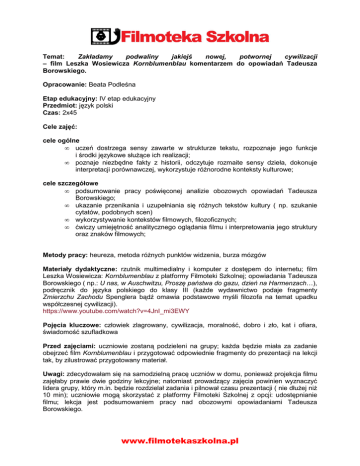 Temat: Zakładamy podwaliny jakiejś nowej, potwornej cywilizacji – film Leszka Wosiewicza Kornblumenblau komentarzem do opowiadań Tadeusza Borowskiego. Opracowanie: Beata Podleśna Etap edukacyjny: IV etap edukacyjny Przedmiot: język polski Czas: 2x45 Cele zajęć: cele ogólne • uczeń dostrzega sensy zawarte w strukturze tekstu, rozpoznaje jego funkcje i środki językowe służące ich realizacji; • poznaje niezbędne fakty z historii, odczytuje rozmaite sensy dzieła, dokonuje interpretacji porównawczej, wykorzystuje różnorodne konteksty kulturowe; cele szczegółowe • podsumowanie pracy poświęconej analizie obozowych opowiadań Tadeusza Borowskiego; • ukazanie przenikania i uzupełniania się różnych tekstów kultury ( np. szukanie cytatów, podobnych scen) • wykorzystywanie kontekstów filmowych, filozoficznych; • ćwiczy umiejętność analitycznego oglądania filmu i interpretowania jego struktury oraz znaków filmowych; Metody pracy: heureza, metoda różnych punktów widzenia, burza mózgów Materiały dydaktyczne: rzutnik multimedialny i komputer z dostępem do internetu; film Leszka Wosiewicza: Kornblumenblau z platformy Filmoteki Szkolnej; opowiadania Tadeusza Borowskiego ( np.: U nas, w Auschwitzu, Proszę państwa do gazu, dzień na Harmenzach…), podręcznik do języka polskiego do klasy III (każde wydawnictwo podaje fragmenty Zmierzchu Zachodu Spenglera bądź omawia podstawowe myśli filozofa na temat upadku współczesnej cywilizacji). https://www.youtube.com/watch?v=4JnI_mi3EWY Pojęcia kluczowe: człowiek zlagrowany, cywilizacja, moralność, dobro i zło, kat i ofiara, świadomość szufladkowa Przed zajęciami: uczniowie zostaną podzieleni na grupy; każda będzie miała za zadanie obejrzeć film Kornblumenblau i przygotować odpowiednie fragmenty do prezentacji na lekcji tak, by zilustrować przygotowany materiał. Uwagi: zdecydowałam się na samodzielną pracę uczniów w domu, ponieważ projekcja filmu zajęłaby prawie dwie godziny lekcyjne; natomiast prowadzący zajęcia powinien wyznaczyć lidera grupy, który m.in. będzie rozdzielał zadania i pilnował czasu prezentacji ( nie dłużej niż 10 min); uczniowie mogą skorzystać z platformy Filmoteki Szkolnej z opcji: udostępnianie filmu; lekcja jest podsumowaniem pracy nad obozowymi opowiadaniami Tadeusza Borowskiego. www.filmotekaszkolna.pl Przebieg zajęć: 1. Podział klasy na grupy; każda będzie oddzielnie przygotowywać materiał do prezentacji: ( heureza) I GRUPA (prostaczek w świecie obozów – grupa prezentuje bohatera od chwili, kiedy został aresztowany - uczniowie dzielą jego życie na okresy, np.: inicjacji w obozie, pobytu w szpitalu, pracy w komandzie, opieki kapo, pracy przy obieraniu ziemniaków, kelnerowania, pobytu w bunkrze, wyjścia) ukazuje zmiany zachodzące w jego zachowaniu ( uczniowie obserwują mimikę bohatera, zwracają uwagę na rolę zbliżeń – łzy, uśmiech, szeroko otwarte oczy), przykłady przystosowania się typowe dla człowieka zlagrowanego ( ja nikomu nie szkodzę); uczniowie podejmują do rozważenia kwestię, która pada w filmie: cwaniak czy kretyn; prostaczek? artysta?) II GRUPA (obraz więźniów - uczniowie szukają, na ile film jest wierny obrazowi obozów ukazanemu przez Tadeusza Borowskiego (cytat z Proszę państwa… - dopóki trwają transporty, niczego nam nie zabraknie, puff, sala koncertowa, pracownia malarska); ukazują codzienność więźniów ( zabijanie wszy, jedzenie, spanie, choroby, pracę, miłość, ciągłe zagrożenie biciem lub śmiercią…) i ich przystosowanie się oraz tworzenie nowej moralności(np. nie wolno grzebać w koszu na śmieci, zakład o to, ile wytrzyma żydowski skrzypek z Węgier; komentarz o rekordzie zagazowanych ludzi; gwałt na bohaterze, przyjaźń i jej cena); stosunek do innych więźniów, do Niemców – np. ocena więźnia, który na piersi nosił medalion z Hitlerem; zwrócenie uwagi na zacieranie się granicy między więźniem a oprawcą, między katem a ofiarą) III GRUPA ( obraz Niemca – różne funkcje, jakie pełnią w obozowej hierarchii – od więźnia po komendanta; świadomość szufladkowa; dobrze wykonywana praca polegająca na zabijaniu – np. scena w bunkrze z komendantem i jego żoną; kompleks pana życia i śmierci – kaprys komendanta, by więźniowi pokazać list z domu; pokaz wieszania więźniów przygotowany dla kobiet niemieckich, Wigilia dla dzieci- komentarz do słów, że wilk i zajączek pogodziły się na Boże Narodzenie; zabawy żołnierzy w jadalni; uczniowie mogą sięgnąć po zdjęcia z albumu nazistów: https://www.youtube.com/watch?v=4JnI_mi3EWY, ukazujące ich odpoczynek po pracy w obozie; uczniowie szukają podobnych kreacji w Proszę państwa… i w Dniu na Harmenzach T. Borowskiego) IV GRUPA ( bada kompozycję filmu, zastanawia się nad jej rolą ( np. zwraca uwagę na filmową klamrę – ekspozycję – narodziny bohatera, jego wychowanie ukazane poprzez cytaty ze starych, czarno-białych filmów; właściwą akcję, do której wklejane są czarno-białe filmy będące ucieczką bohatera od teraźniejszości, snem, po epilog (znów w formie starych klisz – zamknięcie kompozycyjnej klamry); nazywa i funkcjonalizuje znaki filmowe, takie jak: muzyka ( np. tytułowa melodia i Kalinka – grana na koniec żołnierzom sowieckim; za każdym razem muzyka pomaga bohaterowi, co nie znaczy, że sztuka łączy ludzi; raczej pokazuje, jak bohater potrafi wykorzystać sztukę, by przetrwać w każdych warunkach; ważna jest także muzyka klasyczna pojawiająca się w akcji właściwej, np. Polonez Chopina czy nawet bardziej Oda do radości Beethovena – uczniowie mogą zwrócić uwagę na rolę montażu równoległego: śmierć w komorze gazowej obok przedstawienia operowego, Marsylianka); www.filmotekaszkolna.pl światło ( najczęściej przytłumione, ciemne), plany ( dominują plany ukazujące całą sylwetkę: pełny, amerykański średni