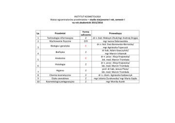 INSTYTUT KOSMETOLOGII Wykaz egzaminatorów przedmiotów – studia stacjonarne I rok, semestr I na rok akademicki 2015/2016 Lp. Przedmiot 1 2 Technologia informacyjna Wychowanie fizyczne 3 4 5 6 7 8 9 10 Biologia i genetyka Biofizyka Anatomia Histologia Higiena Chemia kosmetyczna Etyka zawodowa Kosmetologia pielęgnacyjna Forma Prowadzący zaliczenia Z dr n. biol. Maksym Zhuk/mgr Andrzej Drygas Z/O mgr Iwona Dobrowolska dr n. biol. Ewa Boniewska-Bernacka/ E mgr Agnieszka Fujarczuk dr hab. Adam Kawczyński/ Z mgr Marcin Urbaniak dr n. przyr. Alicja Krajewska/ E lek. med. Marcin Trombala dr n. przyr. Alicja Krajewska/ Z lek. med. Marcin Trombala prof. dr hab. Janusz Pluta/ Z lek. med. Marcin Trombala Z dr n. chem. Agnieszka Szebesczyk Z mgr Jolanta Żurakowska/ mgr Maria Gajda Z mgr Monika Kurek INSTYTUT KOSMETOLOGII Wykaz egzaminatorów przedmiotów – studia stacjonarne II rok, semestr III na rok akademicki 2015/2016 Lp. Przedmiot Forma zaliczenia 1 Pdw:Język angielski Z/O 2 Mikrobiologia i immunologia E mgr Hanna Kośmider-Matwiejczuk/ mgr Małgorzata Kochanowska mgr Monika Różycka 3 Doraźna pomoc przedmedyczna Z/O mgr Jolanta Żurakowska 4 5 6 7 Z Z Z/O Z mgr Monika Kurek dr n. med. Grażyna Szybejko- Machaj mgr Agnieszka Koznarska mgr Monika Kurek E prof. dr hab. Jerzy Rudnicki 9 Aparatura kosmetyczna Podstawy alergologii Historia kosmetologii Kosmetologia upiększająca Pdw:Podstawy chirurgii kosmetycznej/Podstawy chirurgii plastycznej Receptura kosmetyczna E prof. dr hab. Janusz Pluta 10 Pdw: Mykologia kosmetologiczna Z prof. dr hab. Ewa Moliszewska 8 Prowadzący-egzaminator INSTYTUT KOSMETOLOGII Wykaz egzaminatorów przedmiotów – studia stacjonarne III rok, semestr V na rok akademicki 2015/2016 Lp. Przedmiot Forma zaliczenia Prowadzący-egzaminator 1 Pdw:Język angielski Z/O mgr Hanna Kośmider-Matwiejczuk/ mgr Małgorzata Kochanowska 2 Ochrona własności intelektualnej Z/O mgr Jolanta Żurakowska 3 Toksykologia Z/O dr n. chem. Agnieszka Szebesczyk 4 Podstawy fizjoterapii i masażu E dr Antonina Kaczorowska 5 Odnowa biologiczna Z/O dr hab. Adam Kawczyński 6 Kosmetologia specjalistyczna E mgr Monika Kurek 7 Biotechnologia w kosmetyce Z/O prof. dr hab. Ewa Moliszewska 8 Pdw:Wpływ chorób zawodowych na skórę Z/O dr n. med. Grażyna Szybejko-Machaj 9 Metodologia badań naukowych Z/O dr Maksym Zhuk/ prof. Donata Kurpas 10 Seminarium licencjackie Z/O mgr Karolina Chilicka/mgr Monika Kurek/dr n. med. Iwona Dzieńdziora/prof. dr hab. Janusz Pluta/prof. dr hab. Olga Zhuk/prof. dr hab. Ewa Moliszewska/dr n. biol. Ewa Boniewska-Bernacka/dr n. chem. Teresa Farbiszewska/prof. dr hab. Joanna Maj/dr n. farm. Krystyna Małecka/dr n. med. Grażyna Szybejko-Machaj/prof. dr hab. Jerzy Rudnicki/ dr n. med. Magdalena Golachowska-Poleszczuk 11 Praktyki w zakresie kosmetologii specjalistycznej Z/O mgr Elżbieta Komuszyńska