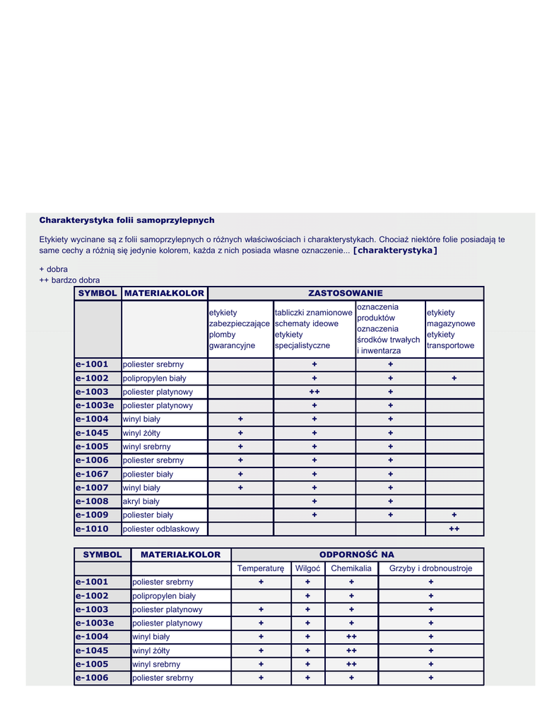 www.macmar.pl Etykiety zabezpieczające, plomby gwarancyjne Tabliczki znamionowe, schematy ideowe, etykiety specjalistyczne Oznaczenia produktów, oznaczenia środków trwałych i inwentarza Etykiety magazynowe, etykiety transportowe Charakterystyka folii samoprzylepnych Etykiety wycinane są z folii samoprzylepnych o różnych właściwościach i charakterystykach. Chociaż niektóre folie posiadają te same cechy a różnią się jedynie kolorem, każda z nich posiada własne oznaczenie... [charakterystyka] + dobra ++ bardzo dobra SYMBOL MATERIAŁKOLOR ZASTOSOWANIE etykiety zabezpieczające plomby gwarancyjne oznaczenia tabliczki znamionowe produktów schematy ideowe oznaczenia etykiety środków trwałych specjalistyczne i inwentarza e-1001 poliester srebrny + + e-1002 polipropylen biały + + e-1003 poliester platynowy ++ + e-1003e poliester platynowy + + e-1004 winyl biały + + + e-1045 winyl żółty + + + e-1005 winyl srebrny + + + e-1006 poliester srebrny + + + e-1067 poliester biały + + + e-1007 winyl biały + + + e-1008 akryl biały + + e-1009 poliester biały + + e-1010 poliester odblaskowy SYMBOL etykiety magazynowe etykiety transportowe + + ++ MATERIAŁKOLOR ODPORNOŚĆ NA Temperaturę Wilgoć Chemikalia Grzyby i drobnoustroje + + + + e-1001 poliester srebrny e-1002 polipropylen biały + + + e-1003 poliester platynowy + + + + e-1003e poliester platynowy + + + + e-1004 winyl biały + + ++ + e-1045 winyl żółty + + ++ + e-1005 winyl srebrny + + ++ + e-1006 poliester srebrny + + + + http://www.macmar.pl/foliowe.php[2009-08-12 17:40:37] www.macmar.pl e-1067 poliester biały + + + + e-1007 winyl biały + + + + e-1008 akryl biały ++ + + + e-1009 poliester biały + + + + e-1010 poliester odblaskowy + + do góry • ZASTOSOWANIA Etykiety zabezpieczające, plomby gwarancyjne Etykiety zabezpieczające mają za zadanie chronić produkty przed kradzieżą. Niektóre z nich z oryginalnym nadrukiem są potwierdzeniem autentyczności wyrobu. Etykiety zabezpieczające charakteryzują się bardzo silnym klejem, który uniemożliwia ich oderwanie. Plomby gwarancyjne zabezpieczają urządzenia przed niefachową naprawą lub domaganiem się gwarancji przez nieuczciwe osoby. Takie etykiety posiadają specjalną charakterystykę - pękają, rozwarstwiają się lub deformują podczas próby zerwania, uniemożliwiając przeklejenie etykiety na inny wyrób. Szczególnie polecane są folie: e-1006, e-1067, e-1007 a także e-1002, e-1004, e-1045, e-1005 Tabliczki znamionowe, schematy ideowe, etykiety specjalistyczne Do oznaczania wyrobów w przemyśle wymaga się stosowania etykiet wykonanych ze specjalistycznych materiałów. Konieczna jest odporność etykiet na ścieranie, ekstremalne temperatury, chemikalia, wilgoć i grzyby. Specjalne wymagania stawiane są etykietom w przemyśle elektronicznym, motoryzacyjnym i metalurgicznym. Szczególnie polecane są folie: e-1003, e-1003e, e-1008, e-1012 a także e-1004, e-1045, e-1005 Oznaczenia produktów, środków trwałych i inwentarza Etykiety samoprzylepne z nadrukiem termotransferowym stosowane są powszechnie do oznaczania wyrobów gotowych, środków trwałych i inwentarza. Etykiety takie charakteryzuje wieloletnia trwałość w zastosowaniach na zewnątrz, możliwość przyklejenia na chropowate i zakrzywione powierzchnie. Szczególnie polecane są folie: e-1001 , e-1002, e-1009 a także e-1006, e-1067, e-1007 Etykiety magazynowe, etykiety transportowe Systemy kodów kreskowych to najprostsza i najszybsza metoda identyfikacji produktów i materiałów. Dobra widoczność etykiet, rozpoznawalna na odległość przez ludzkie oko i czytnik kodów kreskowych, stanowi podstawę w magazynowaniu, transporcie i logistyce. Szczególnie polecane są folie: e-1010 Retro Reflective, a także e-1007, e-1008 do góry • e-1001 http://www.macmar.pl/foliowe.php[2009-08-12 17:40:37] www.macmar.pl SPECYFIKACJA TECHNICZNA Folia e-1001 folia kolor grubość klej podkład odporność na temperaturę poliestrowa matowa srebrna 80 ľm akrylowy 310 grubość 20 ľm biały papier grubość 77 ľm 149 o C (24 godz.) -40 o C (3 dni) - bez zmian - bez zmian - bez zmian odporność na wilgoć 38 o C (24 godz.) wilgotność względna 100% odporność na alkohol izopropylowy (4 godz.) - bez zmian chemikalia detergent (4 godz.) - bez zmian - bez zmian olej silnikowy 121 o C (4 godz.) woda (48 godz.) - bez zmian benzyna (4 godz.) - bez zmian olej napędowy (4 godz.) - bez zmian odporność na grzyby odporna na grzyby i ich rozwój zastosowanie Etykiety informacyjne, tabliczki znamionowe, oznaczenia własne,znakowanie środków trwałych. Mocny klej umożliwia przyklejanie etykiet do materiałów o wysokiej energii powierzchniowej. Posiada najmniejsze ryzyko wyciekania podczas przetwarzania i podczas druku. Folia jest odporna na działanie promieni UV. do góry • e-1002 SPECYFIKACJA TECHNICZNA Folia e-1002 folia kolor grubość polipropylenowa opalizująca biała 66 ľm http://www.macmar.pl/foliowe.php[2009-08-12 17:40:37] www.macmar.pl klej podkład odporność na temperaturę akrylowy AP-360 grubość 23 ľm biały papier grubość 80 ľm 88 o C (24 godz.) - bez zmian - bez zmian odporność na wilgoć 38 o C (24 godz.) wilgotność względna 100% odporność na alkohol izopropylowy (4 godz.) - bez zmian chemikalia detergent (4 godz.) - bez zmian - bez zmian olej silnikowy 121 o C (4 godz.) woda (48 godz.) - bez zmian odporność na grzyby odporna na grzyby i ich rozwój Etykiety informacyjne, tabliczki znamionowe, oznaczenia własne. Folia przeznaczona do klejenia na zastosowanie sztywnych i półsztywnych powierzchniach. Uniwersalny mocny klej akrylowy przylega do wszelkiego rodzaju materiałów. UWAGA: Siła kleju łączącego etykietę z podłożem jest większa od siły łączącej poszczególne warstwy wewnętrzne folii. Stąd też, przy próbie zerwania etykiety, może wystąpić zjawisko jej rozwarstwienia. do góry • e-1003 SPECYFIKACJA TECHNICZNA Folia e-1003 fo