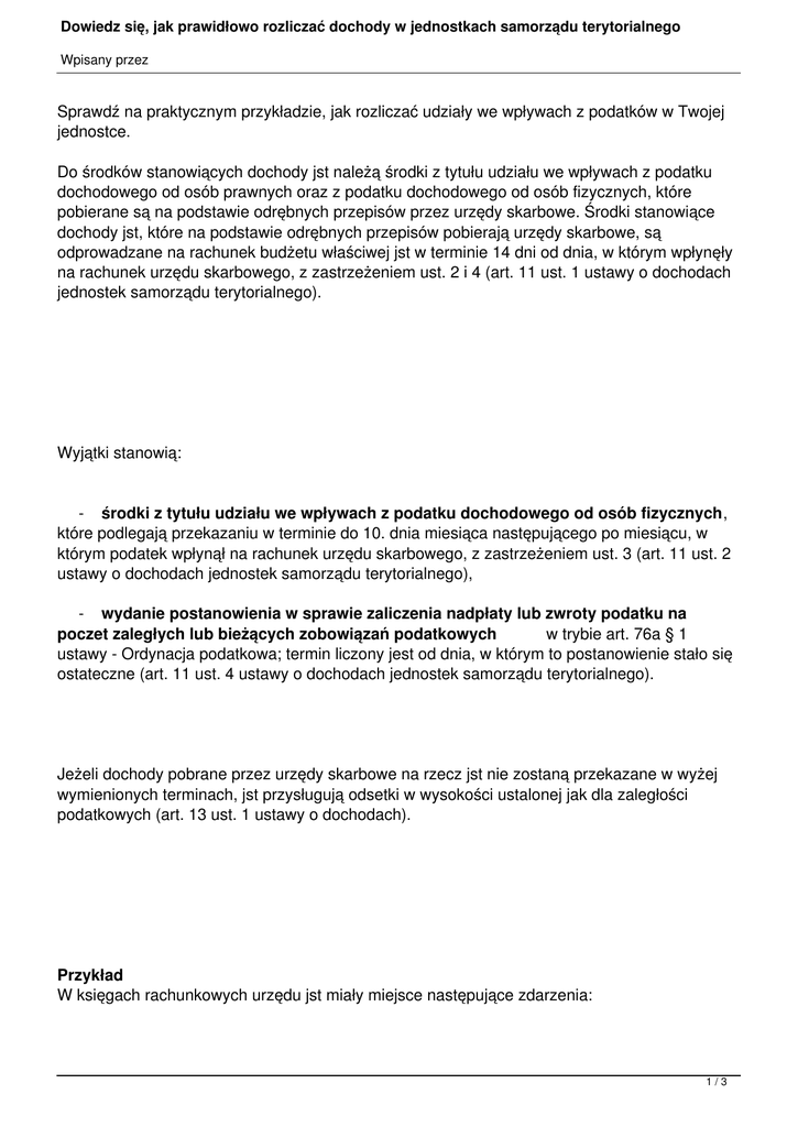 Dowiedz się, jak prawidłowo rozliczać dochody w jednostkach samorządu terytorialnego Wpisany przez Sprawdź na praktycznym przykładzie, jak rozliczać udziały we wpływach z podatków w Twojej jednostce. Do środków stanowiących dochody jst należą środki z tytułu udziału we wpływach z podatku dochodowego od osób prawnych oraz z podatku dochodowego od osób fizycznych, które pobierane są na podstawie odrębnych przepisów przez urzędy skarbowe. Środki stanowiące dochody jst, które na podstawie odrębnych przepisów pobierają urzędy skarbowe, są odprowadzane na rachunek budżetu właściwej jst w terminie 14 dni od dnia, w którym wpłynęły na rachunek urzędu skarbowego, z zastrzeżeniem ust. 2 i 4 (art. 11 ust. 1 ustawy o dochodach jednostek samorządu terytorialnego). Wyjątki stanowią: - środki z tytułu udziału we wpływach z podatku dochodowego od osób fizycznych, które podlegają przekazaniu w terminie do 10. dnia miesiąca następującego po miesiącu, w którym podatek wpłynął na rachunek urzędu skarbowego, z zastrzeżeniem ust. 3 (art. 11 ust. 2 ustawy o dochodach jednostek samorządu terytorialnego), - wydanie postanowienia w sprawie zaliczenia nadpłaty lub zwroty podatku na poczet zaległych lub bieżących zobowiązań podatkowych w trybie art. 76a § 1 ustawy - Ordynacja podatkowa; termin liczony jest od dnia, w którym to postanowienie stało się ostateczne (art. 11 ust. 4 ustawy o dochodach jednostek samorządu terytorialnego). Jeżeli dochody pobrane przez urzędy skarbowe na rzecz jst nie zostaną przekazane w wyżej wymienionych terminach, jst przysługują odsetki w wysokości ustalonej jak dla zaległości podatkowych (art. 13 ust. 1 ustawy o dochodach). Przykład W księgach rachunkowych urzędu jst miały miejsce następujące zdarzenia: 1/3 Dowiedz się, jak prawidłowo rozliczać dochody w jednostkach samorządu terytorialnego Wpisany przez 1. Na rachunek budżetu w 2007 r. wpłynęły dochody zrealizowane przez urząd skarbowy na rzecz jst - 195.000 zł Wn konto 133 „Rachunek budżetu" Ma konto 224 „Rozrachunki budżetu"; 2. Zaksięgowano sprawozdanie Rb-27 o dochodach zrealizowanych przez urząd skarbowy na rzecz jst - 205.000 zł Wn konto 224 „Rozrachunki budżetu" Ma konto 901 „Dochody budżetu"; 3. Przekazano w 2008 r. na rachunek budżetu dochody wykonane w poprzednim roku, ale nieprzekazane do końca 2006 r. - 10.000 zł Wn konto 133 „Rachunek budżetu" Ma konto 224 „Rozrachunki budżetu". 2/3 Dowiedz się, jak prawidłowo rozliczać dochody w jednostkach samorządu terytorialnego Wpisany przez Podstawa prawna: - Ustawa z 30 czerwca 2005 r. o finansach publicznych (Dz.U. nr 249, poz. 2104 i nr 169, poz. 1420 z późn. zm.). - Ustawa z 13 listopada 2003 r. o dochodach jednostek samorządu terytorialnego (Dz.U. nr 203, poz. 1966 z późn. zm.). - Rozporządzenie Ministra Finansów z 24 lipca 2006 r. w sprawie planów finansowych zadań z zakresu administracji rządowej oraz innych zadań zleconych jednostkom samorządu terytorialnego ustawami, przekazywania dotacji celowych i przekazywania pobranych dochodów związanych z realizacją tych zadań (Dz.U. nr 135, poz. 955). - Rozporządzenie Ministra Finansów z 28 lipca 2006 r. w sprawie szczególnych zasad rachunkowości oraz planów kont dla budżetu państwa, budżetów jednostek samorządu terytorialnego oraz niektórych jednostek sektora finansów publicznych (Dz.U. nr 142, poz. 1020). 3/3