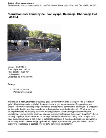 Broker - Real estate agency Obala hrvatskog narodnog preporoda 6/II, 21000 Split, Croatia, Phone: +385 21 541 000, Fax: +385 21 541 008 Nieruchomości komercyjne Hvar wyspa, Dalmacja, Chorwacja Ref : 669/14 Cena : 1 250 000 € Pow. użytkowa : 140 m² Pow. działki : 4300 m² Liczba pięter : 1 Odległość od morza : 50m Zalety : - Widok na morze Parkowanie / garaż Informacje o nieruchomości: tej stacji gazu 200 000 litrów oraz 5 czołgów (dla 5 rodzajów paliw), i będzie w stanie obsłużyć 6 samochodów w tym samym czasie. Budynek biurowy Środki 140 mkw i składa się sklep, kawiarnia, składowania, powierzchni biurowych i 5 urządzeń sanitarnych. Jest to możliwe, aby dodać kolejne piętro, które będą mierzyć 120 mkw. Jest to także pozwolenie na budowę obiektów towarzyszących, takich jak myjnia samochodowa, warsztat itp. Nieruchomość obejmuje również cumowania łodzi przybrzeżnych długości 110 m, i koncesji uzyskuje się na okres 12 lat. Istnieje możliwość budowania usług jacht na wybrzeżu zbyt. Budowie pomiaru 2 420 m kw. w odległości zaledwie 5 metrów od morza, ma pozwolenie na budowę motelu z restauracją, dyskoteka i 15 pięć apartamentów gwiazdy. Jest to bardzo atrakcyjna lokalizacja, a gęstość wynosi 50% całkowitej powierzchni. 1/2 Broker - Real estate agency Obala hrvatskog narodnog preporoda 6/II, 21000 Split, Croatia, Phone: +385 21 541 000, Fax: +385 21 541 008 Funkcje: widok na morze, plaża, miejsce parkingowe, pozwolenie na budowę, koncesji Działka *: 4 300 mkw, z koncesji na 3300 m 2/2