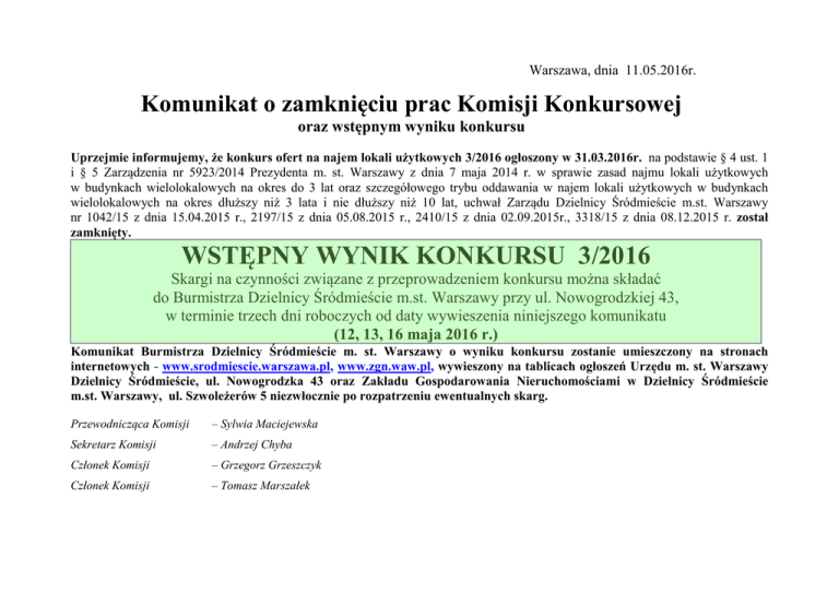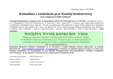 WSTĘPNY WYNIK KONKURSU 3/2016