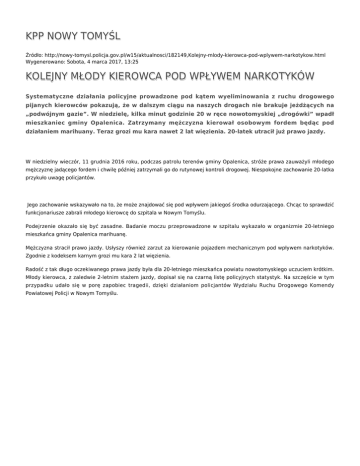 KPP NOWY TOMYŚL Źródło: http://nowy-tomysl.policja.gov.pl/w15/aktualnosci/182149,Kolejny-mlody-kierowca-pod-wplywem-narkotykow.html Wygenerowano: Sobota, 4 marca 2017, 13:25 KOLEJNY MŁODY KIEROWCA POD WPŁYWEM NARKOTYKÓW Systematyczne działania policyjne prowadzone pod kątem wyeliminowania z ruchu drogowego pijanych kierowców pokazują, że w dalszym ciągu na naszych drogach nie brakuje jeżdżących na „podwójnym gazie”. W niedzielę, kilka minut godzinie 20 w ręce nowotomyskiej „drogówki” wpadł mieszkaniec gminy Opalenica. Zatrzymany mężczyzna kierował osobowym fordem będąc pod działaniem marihuany. Teraz grozi mu kara nawet 2 lat więzienia. 20-latek utracił już prawo jazdy. W niedzielny wieczór, 11 grudnia 2016 roku, podczas patrolu terenów gminy Opalenica, stróże prawa zauważyli młodego mężczyznę jadącego fordem i chwilę później zatrzymali go do rutynowej kontroli drogowej. Niespokojne zachowanie 20-latka przykuło uwagę policjantów. Jego zachowanie wskazywało na to, że może znajdować się pod wpływem jakiegoś środka odurzającego. Chcąc to sprawdzić funkcjonariusze zabrali młodego kierowcę do szpitala w Nowym Tomyślu. Podejrzenie okazało się być zasadne. Badanie moczu przeprowadzone w szpitalu wykazało w organizmie 20-letniego mieszkańca gminy Opalenica marihuanę. Mężczyzna stracił prawo jazdy. Usłyszy również zarzut za kierowanie pojazdem mechanicznym pod wpływem narkotyków. Zgodnie z kodeksem karnym grozi mu kara 2 lat więzienia. Radość z tak długo oczekiwanego prawa jazdy była dla 20-letniego mieszkańca powiatu nowotomyskiego uczuciem krótkim. Młody kierowca, z zaledwie 2-letnim stażem jazdy, dopisał się na czarną listę policyjnych statystyk. Na szczęście w tym przypadku udało się w porę zapobiec tragedii, dzięki działaniom policjantów Wydziału Ruchu Drogowego Komendy Powiatowej Policji w Nowym Tomyślu. Ocena: 0/5 (0) Tweetnij