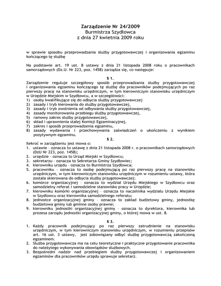 Zarządzenie Nr 24/2009 Burmistrza Szydłowca z dnia 27 kwietnia 2009 roku w sprawie sposobu przeprowadzania służby przygotowawczej i organizowania egzaminu kończącego tę służbę Na podstawie art. 19 ust. 8 ustawy z dnia 21 listopada 2008 roku o pracownikach samorządowych (Dz.U. Nr 223, poz. 1458) zarządza się, co następuje: § 1. Zarządzenie reguluje szczegółowy sposób przeprowadzania służby przygotowawczej i organizowania egzaminu kończącego tę służbę dla pracowników podejmujących po raz pierwszy pracę na stanowisku urzędniczym, w tym kierowniczym stanowisku urzędniczym w Urzędzie Miejskim w Szydłowcu, a w szczególności: 1) osoby kwalifikujące się do odbycia służby przygotowawczej 2) zasady i tryb kierowania do służby przygotowawczej, 3) zasady i tryb zwolnienia od odbywania służby przygotowawczej, 4) zasady monitorowania przebiegu służby przygotowawczej, 5) ramowy zakres służby przygotowawczej, 6) skład i uprawnienia stałej Komisji Egzaminacyjnej, 7) zakres i sposób przeprowadzenia egzaminu, 8) zasady wydawania i przechowywania zaświadczeń o ukończeniu z wynikiem pozytywnym egzaminu. § 2. Ilekroć w zarządzeniu jest mowa o: 1. ustawie – oznacza to ustawę z dnia 21 listopada 2008 r. o pracownikach samorządowych (DzU Nr 223, poz. 1458); 2. urzędzie – oznacza to Urząd Miejski w Szydłowcu; 3. sekretarzu – oznacza to Sekretarza Gminy Szydłowiec; 4. kierowniku urzędu – oznacza to Burmistrza Szydłowca; 5. pracowniku – oznacza to osobę podejmującą po raz pierwszy pracę na stanowisku urzędniczym, w tym kierowniczym stanowisku urzędniczym w rozumieniu ustawy, która została skierowana do odbycia służby przygotowawczej; 6. komórce organizacyjnej – oznacza to wydział Urzędu Miejskiego w Szydłowcu oraz samodzielny referat i samodzielne stanowisko pracy w Urzędzie; 7. kierowniku komórki organizacyjnej – oznacza to naczelnika wydziału Urzędu Miejskie w Szydłowcu oraz kierownika samodzielnego referatu; 8. jednostce organizacyjnej gminy – oznacza to zakład budżetowy gminy, jednostkę budżetowa gminy lub gminne osoby prawne; 9. kierowniku jednostki organizacyjnej gminy – oznacza to dyrektora, kierownika lub prezesa zarządu jednostki organizacyjnej gminy, o której mowa w ust. 8. § 3. 1. Każdy pracownik podejmujący po raz pierwszy zatrudnienie na stanowisku urzędniczym, w tym kierowniczym stanowisku urzędniczym, w rozumieniu przepisów art. 16 ust. 3 ustawy, jest zobowiązany odbyć służbę przygotowawczą zakończoną egzaminem. 2. Służba przygotowawcza ma na celu teoretyczne i praktyczne przygotowanie pracownika do należytego wykonywania obowiązków służbowych. 3. Bezpośredni nadzór nad przebiegiem służby przygotowawczej i organizowaniem egzaminów dla pracowników urzędu sprawuje sekretarz. 4. Wszyscy pracownicy urzędu, w szczególności kierownicy komórek organizacyjnych, są zobowiązani do współpracy w organizowaniu służby przygotowawczej i egzaminów. §4 1. Pracownika kieruje się do odbycia służby przygotowawczej nie później niż przed upływem dwóch miesięcy od zatrudnienia. 2. Służba przygotowawcza trwa od jednego miesiąca do trzech miesięcy i kończy się egzaminem. 3. Okres odbywania służby przygotowawczej i zakres tematyczny służby uzależnione są od wiedzy i kwalifikacji pracownika, zdolności do nabywania umiejętności niezbędnych na zajmowanym stanowisku urzędniczym i dotychczasowego przebiegu zatrudnienia w urzędzie. 4. O terminie skierowania pracownika do odbycia służby przygotowawczej oraz okresie trwania tej służby decyduje sekretarz w porozumieniu z kierownikiem właściwej komórki organizacyjnej. 5. Okres służby przygotowawczej może zostać przedłużony, nie dłużej jednak niż do trzech miesięcy łącznie. 6. Okres służby przygotowawczej ulega przedłużeniu o czas nieobecności pracownika w pracy. Czasu takiej nieobecności nie zalicza się do okresu służby przygotowawczej. § 5. 1. Kierownik komórki organizacyjnej, w której pracownik jest zatrudniony może złożyć do kierownika urzędu, za pośrednictwem sekretarza, umotywowany wniosek o zwolnienie pracownika z odbywania służby przygotowawczej w trybie art. 19 ust. 5 ustawy. 2. Pracownik zwolniony z odbywania służby przygotowawczej przystępuje do egzaminu na zasadach określonych w § 9 -10. § 6. 1. Kierownik komórki organizacyjnej, w której pracownik odbywa służbę przygotowawczą monitoruje jej przebieg. 2. W przypadku stwierdzenia nie spełniania oczekiwań przez pracownika odbywającego służbę przygotowawczą w czasie jej trwania, kierownik komórki organizacyjnej, niezwłocznie wnioskuje do kierownika urzędu, za pośrednictwem sekretarza, o rozwiązanie z pracownikiem umowy o pracę. 3. Po upływie terminu, do którego miała trwać służba przygotowawcza kierownik komórki organizacyjnej wnioskuje do kierownika urzędu, za pośrednictwem sekretarza, o rozwiązanie z pracownikiem umowy o pracę albo o skierowanie go na egzamin końcowy. § 7. 1. W czasie odbywania służby pracownik jest zobowiązany m.in. do: 1) zaznajomienia się z przepisami regulującymi ustrój samorządu gminnego, 2) zaznajomienia się z przepisami określającymi status prawny pracowników samorządowych, 3) zaznajomienia się z przepisami określającymi zasady i tryb wykonywania czynności kancelaryjnych oraz ze sposobem obiegu i rejestracji dokumentów, 4) zapoznania się ze strukturą organizacyjną urzędu, rodzajem spraw załatwianych w poszczególnych komórkach organizacyjnych urzędu i na stanowiskach pracy, 5) zaznajomienia się z zasadami profesjonalnej i kulturalnej obsługi interesantów, 6) zaznajomienia się z obowiązującymi w urzędzie zasadami ochrony informacji niejawnych, ochrony danych osobowych, trybem postępowania na wypadek zagrożenia, 7) zaznajomienia się z zasadami gospodarki finansowej, w tym angażowania środków finansowych i opisywania dokum