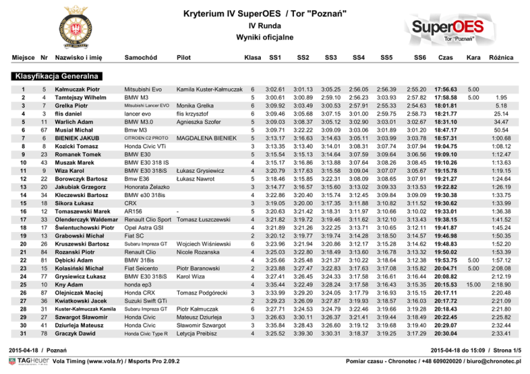 Kryterium IV SuperOES / Tor "Poznań" IV Runda Wyniki oficjalne Miejsce Nr Nazwisko i imię Samochód Pilot Kałmuczak Piotr Tamtejszy Wilhelm Grelka Piotr flis daniel Warlich Adam Musiał Michał BIENIEK JAKUB Kozicki Tomasz Romanek Tomek Muszak Marek Wiza Karol Borowczyk Bartosz Jakubiak Grzegorz Kleczewski Bartosz Sikora Łukasz Tomaszewski Marek Olenderczyk Waldemar Świentuchowski Piotr Grabowski Michał Kruszewski Bartosz Rozanski Piotr Dębicki Adam Kolasiński Michał Grysiewicz Łukasz Kny Adam Olejniczak Maciej Kwiatkowski Jacek Mitsubishi Evo BMW M3 Kamila Kuster-Kałmuczak Mitsubishi Lancer EVO Monika Grelka flis krzysztof Agnieszka Szofer Kuster-Kałmuczak Kamila Subaru Impreza GT Szwargot Sławomir Dziurleja Mateusz Graczyk Dawid Honda Civic Honda Civic Klasa SS1 SS2 SS3 SS4 SS5 6 5 6 6 5 5 5 3 5 4 4 5 3 4 3 5 4 4 2 6 4 4 2 4 4 3 2 6 3 3 4 3:02.61 3:00.61 3:09.92 3:09.46 3:09.03 3:09.71 3:13.17 3:13.35 3:15.54 3:15.17 3:20.79 3:18.46 3:14.77 3:22.86 3:19.05 3:20.63 3:21.82 3:21.89 3:20.12 3:23.96 3:25.03 3:25.66 3:23.88 3:27.41 3:35.44 3:33.99 3:29.23 3:27.71 3:26.63 3:35.84 3:25.52 3:01.13 3:00.89 3:03.49 3:05.68 3:08.37 3:22.22 3:16.63 3:13.40 3:15.13 3:16.86 3:17.63 3:15.85 3:16.57 3:20.40 3:20.00 3:21.42 3:19.72 3:21.26 3:19.77 3:21.94 3:22.80 3:25.48 3:27.47 3:26.45 3:22.49 3:29.20 3:26.09 3:24.53 3:30.11 3:28.43 3:39.30 3:05.25 2:59.10 3:00.53 3:07.15 3:05.12 3:09.09 3:14.63 3:14.01 3:14.64 3:13.88 3:15.58 3:22.31 3:15.60 3:15.74 3:17.35 3:18.31 3:19.46 3:22.25 3:19.74 3:20.86 3:18.49 3:21.37 3:22.83 3:24.33 3:28.24 3:24.05 3:27.87 3:24.79 3:26.37 3:26.60 3:30.31 2:56.05 2:56.23 2:57.91 3:01.00 3:02.90 3:03.06 3:05.11 3:08.31 3:07.59 3:07.64 3:09.04 3:08.09 3:13.02 3:12.45 3:11.88 3:11.97 3:11.62 3:13.71 3:14.28 3:12.17 3:13.60 3:10.22 3:17.63 3:17.58 3:17.58 3:17.79 3:19.93 3:22.46 3:21.41 3:19.12 3:18.37 2:56.39 3:03.93 2:55.33 2:59.75 3:03.01 3:01.89 3:03.99 3:07.74 3:09.64 3:08.26 3:07.07 3:08.65 3:09.33 3:09.84 3:10.82 3:10.66 3:12.10 3:10.65 3:18.50 3:15.28 3:16.78 3:18.64 3:17.08 3:16.61 3:16.43 3:16.93 3:18.57 3:19.66 3:19.44 3:19.68 3:19.25 SS6 Czas Kara 17:56.63 17:58.58 18:01.81 18:21.77 18:31.10 18:47.17 18:57.31 19:04.75 19:09.10 19:10.26 19:15.78 19:21.27 19:22.82 19:30.38 19:30.62 19:33.01 19:38.15 19:41.87 19:46.98 19:48.83 19:50.02 19:53.75 20:04.71 20:08.82 20:15.53 20:17.11 20:17.72 20:18.43 20:22.45 20:29.07 20:30.04 5.00 5.00 Różnica Klasyfikacja Generalna 1 2 3 4 5 6 7 8 9 10 11 12 13 14 15 16 17 18 19 20 21 22 23 24 25 26 27 28 29 30 31 5 4 7 3 11 67 6 8 23 43 9 22 20 34 18 12 33 17 13 26 84 81 15 77 10 87 36 31 27 41 78 lancer evo BMW M3.0 Bmw M3 CITROEN C2 PROTO Honda Civic VTi BMW E30 BMW E30 318 IS BMW E30 318iS Bmw E36 Honorata Żelazko BMW e30 318is CRX AR156 Renault Clio Sport Opel Astra GSI Fiat SC Subaru Impreza GT Renault Clio BMW 318is Fiat Seicento BMW E30 318iS honda ep3 Honda CRX Suzuki Swift GTi Honda Civic Type R MAGDALENA BIENIEK Łukasz Grysiewicz Łukasz Nawrot Tomasz Łuszczewski Wojciech Wiśniewski Nicole Rozanska Piotr Baranowski Karol Wiza Tomasz Podgórecki Piotr Kałmuczak Mateusz Dziurleja Sławomir Szwargot Letycja Preibisz 2015-04-18 / Poznań Vola Timing (www.vola.fr) / Msports Pro 2.09.2 2:55.20 2:57.82 2:54.63 2:58.73 3:02.67 3:01.20 3:03.78 3:07.94 3:06.56 3:08.45 3:05.67 3:07.91 3:13.53 3:09.09 3:11.52 3:10.02 3:13.43 3:12.11 3:14.57 3:14.62 3:13.32 3:12.38 3:15.82 3:16.44 3:15.35 3:15.15 3:16.03 3:19.28 3:18.49 3:19.40 3:17.29 5.00 5.00 15.00 1.95 5.18 25.14 34.47 50.54 1:00.68 1:08.12 1:12.47 1:13.63 1:19.15 1:24.64 1:26.19 1:33.75 1:33.99 1:36.38 1:41.52 1:45.24 1:50.35 1:52.20 1:53.39 1:57.12 2:08.08 2:12.19 2:18.90 2:20.48 2:21.09 2:21.80 2:25.82 2:32.44 2:33.41 2015-04-18 do 15:09 / Strona 1/5 Pomiar czasu - Chronotec / +48 609020020 / VolaSoftControlPdf [email protected] Kryterium IV SuperOES / Tor "Poznań" IV Runda Wyniki oficjalne Miejsce Nr 32 33 34 35 36 37 38 39 40 41 42 43 44 45 46 47 48 49 50 51 52 53 54 55 56 57 58 59 60 61 62 63 64 65 69 32 40 93 35 25 46 94 89 29 68 85 75 79 45 51 74 91 52 70 53 49 61 95 58 88 38 50 63 59 57 60 64 65 Nazwisko i imię Samochód Kaczmarek Bartosz Wójtowicz Jarek Wojciechowski Tomasz Krzyś Grzegorz Nykowski Maciej Naspiński Krystian Gradys Agata Kaczmarek Łukasz Grzelka Bartosz Wojtas Sergiusz Gorlak Jacek Borzyński Damian Rozanska Nicole Hańćkowiak Maciej Chojnacki Jakub Śmiglak Marek kulikowski roman Kędzierawski Remigiusz Schedler Tomasz Plenzler Grzegorz Mróz Mikołaj Kęsy Kamil Czajka Jakub Matys Bartosz Żukow Lucjan Radziemski Maciej Nowicki Darek Grześkowiak Łukasz Sosnowski Michał Bocheński Krzysztof Szumiłowski Sebastian Hornung Piotr Szkarapata Wiktor Nowak Damian Subaru Impreza WRX Bartosz Jerzy BMW e36 Fiat SC Suzuki Swift Fiat Seicento BMW e36 BMW e36 Honda Civic Honda CRX Opel Astra GSI Subaru Impreza Suzuki Swift Renault Clio Honda CRX Fiat SC Fiat SC honda type r Fiat Seicento Fiat UNO Alfa Romeo 147 Fiat Uno Pilot Magdalena Gradys Andrzej Borowski Damian Borzyński Łukasz Karło Magdalena Gradys Maciej Hańćkowiak Bartosz Kaczmarek Piotr Rozanski Bartek Grzelka Anna Śmiglak Bartłomiej Łuczak Michał Sosnowski Karol Karwacki Łukasz Grześkowiak Opel Corsa Traktorek Michał Rogaczewski Fiat SC Mateusz Łuczak Kia Picanto Darek Nowicki BMW E36 318is Adam Piechociński Mitsubishi Colt Michał Wajer Kia Picanto Bartek Matys Fiat Seicento Mikołaj Mróz Fiat UNO Tomasz Schedler Ford KA Piotr Wawrzyniak Lexus IS200 Paulina Rękoś Peugeot 205 Junior Kinga Lihs Suzuki Swift Oskar Sadowski Bmw 320i Maciej Szkudlarek 2015-04-18 / Poznań Vola Timing (www.vola.fr) / Msports Pro 2.09.2 Klasa SS1 SS2 SS3 SS4 SS5 6 5 2 2 2 5 5 3 3 4 6 2 4 3 2 2 4 2 3 5 3 5 2 1 4 3 1 2 3 2 4 1 1 4 3:34.40 3:27.70 3:32.88 3:32.06 3:35.15 3:31.39 3:35.09 3:53.16 3:40.68 3:38.50 3:42.75 3:52.45 3:45.36 3:48.78 3:26.87 3:44.10 3:54.72 3:44.69 3:46.16 3:46.10 3:52.46 4:02.39 3:47.26 3:55.42 3:42.21 3:55.46 3:58.85 3:54.60 3:52.19 3:51.10 3:49.24 3:54.85 3:56.