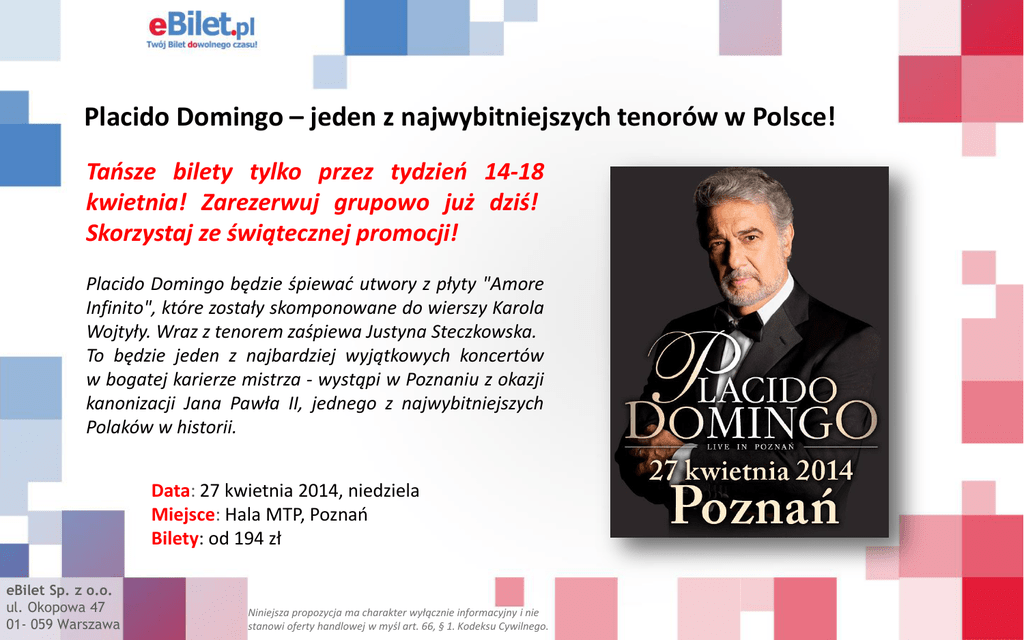 Placido Domingo – jeden z najwybitniejszych tenorów w Polsce! Tańsze bilety tylko przez tydzień 14-18 kwietnia! Zarezerwuj grupowo już dziś! Skorzystaj ze świątecznej promocji! Placido Domingo będzie śpiewać utwory z płyty "Amore Infinito", które zostały skomponowane do wierszy Karola Wojtyły. Wraz z tenorem zaśpiewa Justyna Steczkowska. To będzie jeden z najbardziej wyjątkowych koncertów w bogatej karierze mistrza - wystąpi w Poznaniu z okazji kanonizacji Jana Pawła II, jednego z najwybitniejszych Polaków w historii. Data: 27 kwietnia 2014, niedziela Miejsce: Hala MTP, Poznań Bilety: od 194 zł eBilet Sp. z o.o. ul. Okopowa 47 01- 059 Warszawa Niniejsza propozycja ma charakter wyłącznie informacyjny i nie stanowi oferty handlowej w myśl art. 66, § 1. Kodeksu Cywilnego. Specjalne ceny biletów ATRAKCYJNE RABATY PRZY ZAMÓWIENIACH GRUPOWYCH: 5% - przy zakupie co najmniej 20 biletów 7% - 50 biletów i więcej 10% - 100 biletów i więcej Zamówienia prosimy składać mailowo: [email protected] lub telefonicznie: 662-163-332, 793-177-197. Zniżki obowiązują tylko do 18 kwietnia! eBilet Sp. z o.o. ul. Okopowa 47 01- 059 Warszawa facebook.com/ebilet