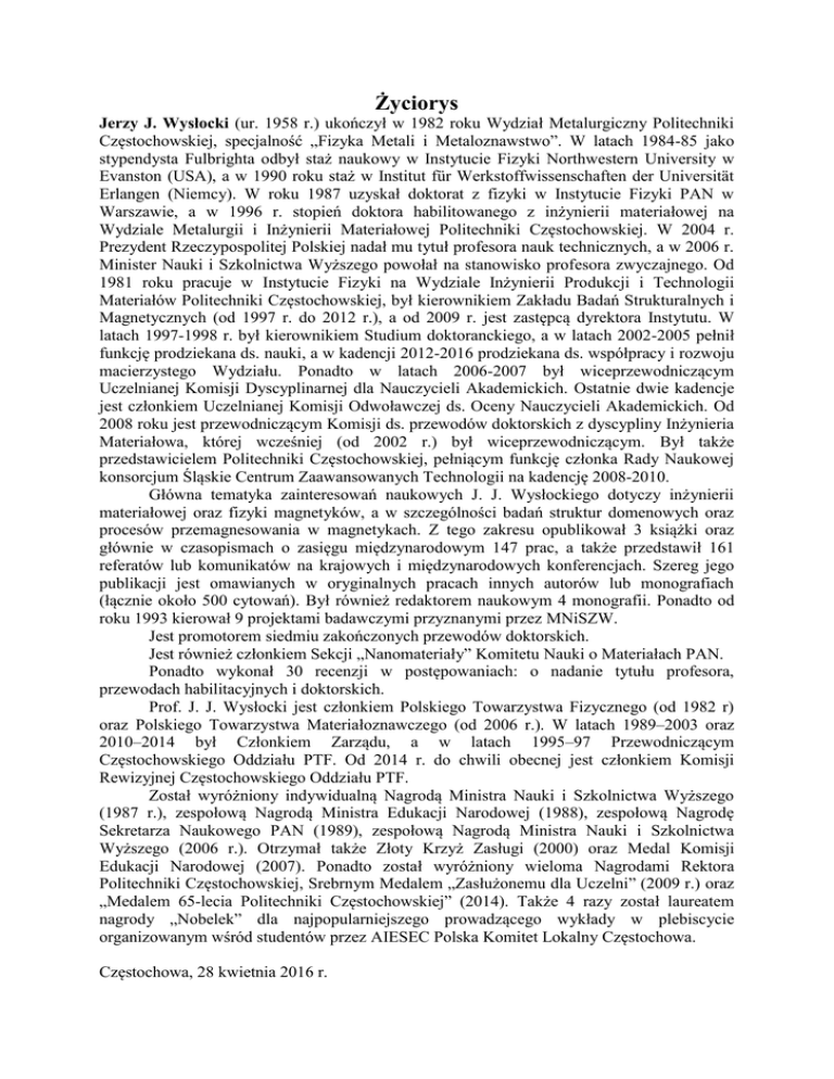 Życiorys Jerzy J. Wysłocki (ur. 1958 r.) ukończył w 1982 roku Wydział Metalurgiczny Politechniki Częstochowskiej, specjalność „Fizyka Metali i Metaloznawstwo”. W latach 1984-85 jako stypendysta Fulbrighta odbył staż naukowy w Instytucie Fizyki Northwestern University w Evanston (USA), a w 1990 roku staż w Institut für Werkstoffwissenschaften der Universität Erlangen (Niemcy). W roku 1987 uzyskał doktorat z fizyki w Instytucie Fizyki PAN w Warszawie, a w 1996 r. stopień doktora habilitowanego z inżynierii materiałowej na Wydziale Metalurgii i Inżynierii Materiałowej Politechniki Częstochowskiej. W 2004 r. Prezydent Rzeczypospolitej Polskiej nadał mu tytuł profesora nauk technicznych, a w 2006 r. Minister Nauki i Szkolnictwa Wyższego powołał na stanowisko profesora zwyczajnego. Od 1981 roku pracuje w Instytucie Fizyki na Wydziale Inżynierii Produkcji i Technologii Materiałów Politechniki Częstochowskiej, był kierownikiem Zakładu Badań Strukturalnych i Magnetycznych (od 1997 r. do 2012 r.), a od 2009 r. jest zastępcą dyrektora Instytutu. W latach 1997-1998 r. był kierownikiem Studium doktoranckiego, a w latach 2002-2005 pełnił funkcję prodziekana ds. nauki, a w kadencji 2012-2016 prodziekana ds. współpracy i rozwoju macierzystego Wydziału. Ponadto w latach 2006-2007 był wiceprzewodniczącym Uczelnianej Komisji Dyscyplinarnej dla Nauczycieli Akademickich. Ostatnie dwie kadencje jest członkiem Uczelnianej Komisji Odwoławczej ds. Oceny Nauczycieli Akademickich. Od 2008 roku jest przewodniczącym Komisji ds. przewodów doktorskich z dyscypliny Inżynieria Materiałowa, której wcześniej (od 2002 r.) był wiceprzewodniczącym. Był także przedstawicielem Politechniki Częstochowskiej, pełniącym funkcję członka Rady Naukowej konsorcjum Śląskie Centrum Zaawansowanych Technologii na kadencję 2008-2010. Główna tematyka zainteresowań naukowych J. J. Wysłockiego dotyczy inżynierii materiałowej oraz fizyki magnetyków, a w szczególności badań struktur domenowych oraz procesów przemagnesowania w magnetykach. Z tego zakresu opublikował 3 książki oraz głównie w czasopismach o zasięgu międzynarodowym 147 prac, a także przedstawił 161 referatów lub komunikatów na krajowych i międzynarodowych konferencjach. Szereg jego publikacji jest omawianych w oryginalnych pracach innych autorów lub monografiach (łącznie około 500 cytowań). Był również redaktorem naukowym 4 monografii. Ponadto od roku 1993 kierował 9 projektami badawczymi przyznanymi przez MNiSZW. Jest promotorem siedmiu zakończonych przewodów doktorskich. Jest również członkiem Sekcji „Nanomateriały” Komitetu Nauki o Materiałach PAN. Ponadto wykonał 30 recenzji w postępowaniach: o nadanie tytułu profesora, przewodach habilitacyjnych i doktorskich. Prof. J. J. Wysłocki jest członkiem Polskiego Towarzystwa Fizycznego (od 1982 r) oraz Polskiego Towarzystwa Materiałoznawczego (od 2006 r.). W latach 1989–2003 oraz 2010–2014 był Członkiem Zarządu, a w latach 1995–97 Przewodniczącym Częstochowskiego Oddziału PTF. Od 2014 r. do chwili obecnej jest członkiem Komisji Rewizyjnej Częstochowskiego Oddziału PTF. Został wyróżniony indywidualną Nagrodą Ministra Nauki i Szkolnictwa Wyższego (1987 r.), zespołową Nagrodą Ministra Edukacji Narodowej (1988), zespołową Nagrodę Sekretarza Naukowego PAN (1989), zespołową Nagrodą Ministra Nauki i Szkolnictwa Wyższego (2006 r.). Otrzymał także Złoty Krzyż Zasługi (2000) oraz Medal Komisji Edukacji Narodowej (2007). Ponadto został wyróżniony wieloma Nagrodami Rektora Politechniki Częstochowskiej, Srebrnym Medalem „Zasłużonemu dla Uczelni” (2009 r.) oraz „Medalem 65-lecia Politechniki Częstochowskiej” (2014). Także 4 razy został laureatem nagrody „Nobelek” dla najpopularniejszego prowadzącego wykłady w plebiscycie organizowanym wśród studentów przez AIESEC Polska Komitet Lokalny Częstochowa. Częstochowa, 28 kwietnia 2016 r.