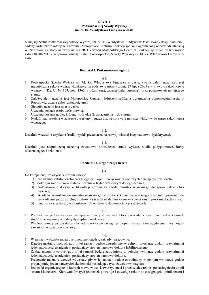 STATUT Podkarpackiej Szkoły Wyższej im. bł. ks. Władysława Findysza w Jaśle Niniejszy Statut Podkarpackiej Szkoły Wyższej im. bł. ks. Władysława Findysza w Jaśle, zwany dalej „statutem”, nadany został przez założyciela uczelni - Małopolskie Centrum Edukacji spółka z ograniczoną odpowiedzialnością w Rzeszowie na mocy uchwały nr 1/X/2011 Zarządu Małopolskiego Centrum Edukacji sp. z o.o. w Rzeszowie z dnia 01-10-2011 r. w sprawie zmiany Statutu Podkarpackiej Szkoły Wyższej im. bł. ks. Władysława Findysza w Jaśle. Rozdział I. Postanowienia ogólne 1. 2. 3. 4. 5. 6. § 1. Podkarpacka Szkoła Wyższa im. bł. ks. Władysława Findysza w Jaśle, zwana dalej „uczelnią”, jest niepubliczną szkołą wyższą, działającą na podstawie ustawy z dnia 27 lipca 2005 r. - Prawo o szkolnictwie wyższym (Dz. U. Nr 163, poz. 1365, z późn. zm.), zwanej dalej „ustawą”, oraz postanowień niniejszego statutu. Założycielem uczelni jest Małopolskie Centrum Edukacji spółka z ograniczoną odpowiedzialnością w Rzeszowie, zwana dalej „założycielem”. Siedzibą uczelni jest miasto Jasło. Uczelnia posiada osobowość prawną. Uczelnia posiada godło, którego wzór określa załącznik nr 1 do statutu. Nadzór nad uczelnią w zakresie określonym przez ustawę sprawuje minister właściwy do spraw szkolnictwa wyższego. § 2. Uczelnia wszystkie uzyskane środki (zyski) przeznacza na rozwój własnej bazy naukowo-dydaktycznej. § 3. Uczelnia jest niepubliczną uczelnią zawodową prowadzącą studia wyższe, studia podyplomowe, kursy dokształcające i szkolenia. Rozdział II. Organizacja uczelni § 4. Do kompetencji założyciela uczelni należy: 1) nadawanie statutu uczelni po zasięgnięciu opinii związków zawodowych działających w uczelni, 2) dokonywanie zmian w statucie uczelni w trybie właściwym do jego nadania, 3) podejmowanie decyzji o likwidacji uczelni za zgodą ministra właściwego do spraw szkolnictwa wyższego, 4) składanie wniosków do ministra właściwego do spraw szkolnictwa wyższego o nadanie uprawnień do prowadzenia przez uczelnię studiów wyższych na danym kierunku i określonym poziomie kształcenia, 5) inne sprawy zastrzeżone w ustawie lub w statucie do kompetencji założyciela. § 5. 1. Podstawową jednostką organizacyjną uczelni jest wydział, który prowadzi co najmniej jeden kierunek studiów co najmniej w jednej dyscyplinie naukowej. 2. Wydział tworzy, przekształca i likwiduje rektor po zasięgnięciu opinii senatu, z uwzględnieniem wymogów zawartych w przepisach ustawy. § 6. 1. W ramach wydziału mogą być tworzone katedry, zakłady i pracownie. 2. Katedrę można utworzyć, gdy w jej ramach będzie zatrudniony w pełnym wymiarze godzin przynajmniej jeden nauczyciel akademicki posiadający stopień naukowy doktora habilitowanego. 3. Zakład można utworzyć, gdy w jej ramach będzie zatrudniony w pełnym wymiarze godzin przynajmniej jeden nauczyciel akademicki posiadający stopień naukowy doktora. 4. Pracownię można utworzyć wówczas, gdy w jej ramach będzie zatrudniony w pełnym wymiarze godzin przynajmniej jeden nauczyciel akademicki posiadający tytuł zawodowy magistra. 5. Jednostki organizacyjne, o których mowa w ust. 1, tworzy, znosi i przekształca rektor, po zasięgnięciu opinii senatu i kanclerza. Kierowników tych jednostek powołuje i odwołuje rektor po zasięgnięciu opinii senatu i kanclerza. § 7. 1. W uczelni działa system biblioteczno-informacyjny, którego podstawę stanowi biblioteka. 2. Biblioteka jest ogólnouczelnianą jednostką organizacyjną o zadaniach naukowych, dydaktycznych i usługowych. 3. Biblioteka gromadzi zbiory biblioteczne w celu udostępniania ich pracownikom i studentom uczelni na zewnątrz lub na miejscu w ramach czytelni. 4. Szczegółowe zasady organizacji i funkcjonowania systemu biblioteczno-informacyjnego, w tym zasady udostępniania zbiorów bibliotecznych, określa regulamin biblioteki ustalany przez rektora po zasięgnięciu opinii dyrektora biblioteki. 5. Uczelnia w związku z funkcjonowaniem systemu biblioteczno-informacyjnego przetwarza dane osobowe osób korzystających z tego systemu obejmujące ich imię i nazwisko, miejsce zamieszkania, datę i miejsce urodzenia, miejsce odbywania nauki lub miejsce zatrudnienia. 6. Biblioteką kieruje dyrektor biblioteki, którego zatrudnia rektor po zasięgnięciu opinii senatu. 7. W uczelni działa rada biblioteczna jako organ opiniodawczy rektora. Do zadań rady bibliotecznej należy zgłaszanie wniosków w zakresie uzupełniania zbiorów bibliotecznych oraz opiniowanie planów dotyczących zakupu zbiorów bibliotecznych. 8. W skład rady bibliotecznej wchodzi dyrektor biblioteki oraz dwóch nauczycieli akademickich zatrudnionych w uczelni, powoływanych i odwoływanych przez rektora na okres czterech lat. 9. Szczegółowe kompetencje i tryb działania rady bibliotecznej określa jej regulamin nadawany przez rektora. 10. Uczelnia prowadzi archiwum na zasadach określonych w odrębnych przepisach. Rozdział III. Organy uczelni 1. 2. Organami kolegialnymi uczelni są: 1) senat, 2) rada wydziału. Organami jednoosobowymi uczelni są: 1) rektor, 2) kanclerz, 3) dziekan. § 8. § 9. Kadencja jednoosobowych i kolegialnych organów uczelni trwa cztery lata i rozpoczyna się w dniu l września w roku wyborów, a kończy się 31 sierpnia w roku, w którym upływa kadencja. § 10. Do kompetencji senatu należy: 1) ocena działalności dydaktycznej, 2) ocena działalności uczelni, 3) wybór uczelnianych komisji dyscyplinarnych na wniosek rektora, 4) podejmowanie uchwał o utworzeniu związku uczelni niepublicznych, 5) uchwalanie regulaminu studiów w trybie przewidzianym w ustawie, 6) zatwierdzanie wzorów uczelnianych dyplomów ukończenia studiów, 7) zatwierdzanie sprawozdania finansowego uczelni zgodnie z przepisami o rachunkowości, 8) uchwalanie regulaminu zarządzania prawami autorskimi i prawami pokrewnymi oraz p