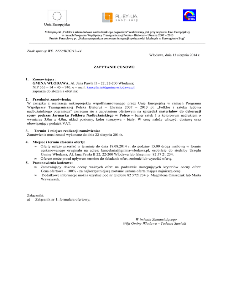 Unia Europejska Mikroprojekt „Folklor i sztuka ludowa nadbużańskiego pogranicza” realizowany jest przy wsparciu Unii Europejskiej w ramach Programu Współpracy Transgranicznej Polska - Białoruś – Ukraina 2007 – 2013 Projekt Parasolowy pt. „Kultura pogranicza pomostem integracji społeczności lokalnych w Euroregionie Bug” ____________________________________________________________________________________________ Znak sprawy WE. 2222/BUG/13-14 Włodawa, dnia 13 sierpnia 2014 r. ZAPYTANIE CENOWE 1. Zamawiający: GMINA WŁODAWA, Al. Jana Pawła II – 22; 22-200 Włodawa; NIP 565 – 14 – 45 – 740; e – mail: [email protected] zaprasza do złożenia ofert na: 2. Przedmiot zamówienia: W związku z realizacją mikroprojektu współfinansowanego przez Unię Europejską w ramach Programu Współpracy Transgranicznej Polska Białoruś – Ukraina 2007 – 2013 pt. „Folklor i sztuka ludowa nadbużańskiego pogranicza” zwracam się z zapytaniem ofertowym na sprzedaż materiałów do dekoracji sceny podczas Jarmarku Folkloru Nadbużańskiego w Polsce – baner sztuk 1 z kolorowym nadrukiem o wymiarze 3,0m x 4,0m, układ poziomy, kolor tworzywa - biały. W cenę należy wliczyć: dostawę oraz obowiązujący podatek VAT. 3. Termin i miejsce realizacji zamówienia: Zamówienie musi zostać wykonane do dnia 22 sierpnia 2014r. 4. 5. Miejsce i termin złożenia oferty: • Ofertę należy przesłać w terminie do dnia 18.08.2014 r. do godziny 15.00 drogą mailową w formie zeskanowanego oryginału na adres: [email protected], osobiście do siedziby Urzędu Gminy Włodawa, Al. Jana Pawła II 22, 22-200 Włodawa lub faksem nr 82 57 21 234. • Oferent może przed upływem terminu do składania ofert, zmienić lub wycofać ofertę. Postanowienia końcowe: • Zamawiający dokona oceny ważnych ofert na podstawie następujących kryteriów oceny ofert: Cena ofertowa – 100% - za najkorzystniejszą zostanie uznana oferta mająca najniższą cenę. • Dodatkowe informacje można uzyskać pod nr telefonu 82 5721234 p. Magdalena Oniszczuk lub Marta Wawryszuk. Załączniki: a) Załącznik nr 1: formularz ofertowy; W imieniu Zamawiającego Wójt Gminy Włodawa – Tadeusz Sawicki Unia Europejska Mikroprojekt „Folklor i sztuka ludowa nadbużańskiego pogranicza” realizowany jest przy wsparciu Unii Europejskiej w ramach Programu Współpracy Transgranicznej Polska - Białoruś – Ukraina 2007 – 2013 Projekt Parasolowy pt. „Kultura pogranicza pomostem integracji społeczności lokalnych w Euroregionie Bug” ____________________________________________________________________________________________ Załącznik nr 1 do Zapytania ofertowego Znak sprawy WE. 2222/BUG/13-14 Oferta Wykonawcy Nazwa: ……………………………………………………………………………………………………………… Adres: ……………………………………………………………………………………………….……………… Numer NIP: ………………………………………………………………………………………………………… Numer REGON:………………………………………………………………………………….………………… Osoba upoważniona do kontaktów z Zamawiającym (imię, nazwisko, zajmowane stanowisko, nr telefonu, e-mail): …..………………………………………………………………………………………….……………… ___________________________________________________________________________ Skierowana do: Gmina Włodawa Al. Jana Pawła II – 22 22 – 200 Włodawa Nawiązując do zaproszenia do składania ofert Nr Znak sprawy WE. 2222/BUG/13-14 - sprzedaż materiałów do dekoracji sceny podczas Jarmarku Folkloru Nadbużańskiego w Polsce – baner sztuk 1, z kolorowym nadrukiem, o wymiarze 3,0m x 4,0m, układ poziomy, kolor tworzywa - biały. Oferuję wykonanie zamówienia za kwotę: Kwota brutto Kwota netto Podatek VAT Słownie brutto: …………………………………………………………………………………….……………………………..……….….. Oferent zaświadcza, że: Nie znajduje się w stanie upadłości lub likwidacji, jego działalność nie podlega nadzorowi sądowemu, nie zawarł ugody z wierzycielami, nie zawiesił działalności, nie toczy się wobec niego postępowanie w wyżej wymienionych sprawach lub nie znajduje się w podobnej sytuacji wynikającej z podobnych procedur zgodnie z przepisami i uregulowaniami krajowymi; Nie został skazany za przestępstwo związane z prowadzeniem działalności prawomocną decyzją właściwej instancji (od decyzji, której nie ma odwołania); Nie został uznany winnym poważnego naruszenia zasad prowadzenia działalności; Wypełnił swoje zobowiązania związane z opłatą składek na ubezpieczenie społeczne lub podatki zgodnie z przepisami państwa, gdzie ma być realizowany kontrakt; Nie została wobec niego wydana prawomocna decyzja w sprawie oszustwa, korupcji, udziału w organizacji przestępczej lub innej działalności niezgodnej z prawem na szkodę interesom finansowym Wspólnoty; Nie podlega obecnie karze administracyjnej zgodnie z pkt. 2.3.5 PRAG Ponadto oświadczam, że: 1) Wykonam zlecenie w wyznaczonym terminie. 2) Zapoznałem się ze szczegółami zamówienia, nie wnoszę żadnych zastrzeżeń oraz uzyskałem niezbędne informacje do przygotowania oferty. 3) W cenie oferty uwzględnione zostały wszystkie koszty wykonania zlecenia. 4) Posiadam odpowiednie doświadczenie pozwalające zrealizować przedmiotowe zamówienie w sposób należyty. 5) Wszystkie dane zawarte w ofercie są zgodne z prawdą. ……………………dnia ……………..2014 r. …………………………………………. Podpis osoby upoważnionej