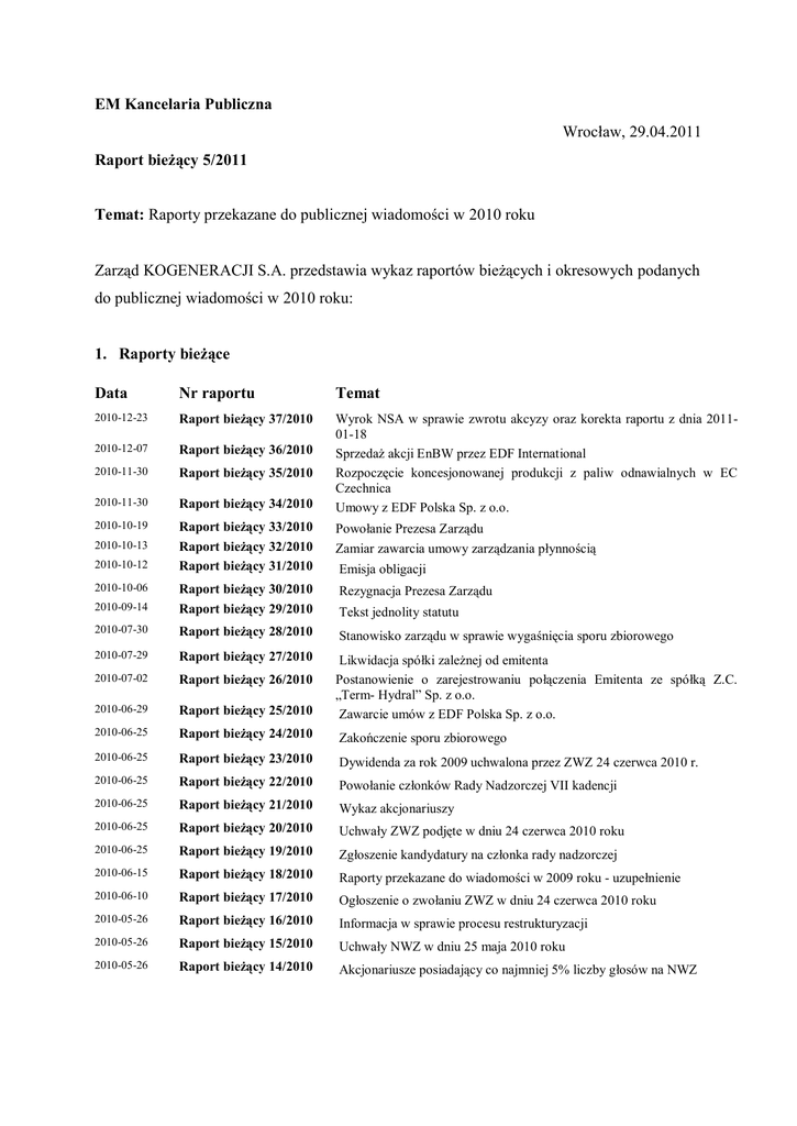 EM Kancelaria Publiczna Wrocław, 29.04.2011 Raport bieżący 5/2011 Temat: Raporty przekazane do publicznej wiadomości w 2010 roku Zarząd KOGENERACJI S.A. przedstawia wykaz raportów bieżących i okresowych podanych do publicznej wiadomości w 2010 roku: 1. Raporty bieżące Data Nr raportu Temat 2010-12-23 Raport bieżący 37/2010 2010-12-07 Raport bieżący 36/2010 2010-11-30 Raport bieżący 35/2010 2010-11-30 Raport bieżący 34/2010 Wyrok NSA w sprawie zwrotu akcyzy oraz korekta raportu z dnia 201101-18 Sprzedaż akcji EnBW przez EDF International Rozpoczęcie koncesjonowanej produkcji z paliw odnawialnych w EC Czechnica Umowy z EDF Polska Sp. z o.o. 2010-10-19 Raport bieżący 33/2010 Raport bieżący 32/2010 Raport bieżący 31/2010 Powołanie Prezesa Zarządu Zamiar zawarcia umowy zarządzania płynnością Rezygnacja Prezesa Zarządu 2010-09-14 Raport bieżący 30/2010 Raport bieżący 29/2010 2010-07-30 Raport bieżący 28/2010 Stanowisko zarządu w sprawie wygaśnięcia sporu zbiorowego 2010-07-29 Raport bieżący 27/2010 2010-07-02 Raport bieżący 26/2010 2010-06-29 Raport bieżący 25/2010 Likwidacja spółki zależnej od emitenta Postanowienie o zarejestrowaniu połączenia Emitenta ze spółką Z.C. „Term- Hydral” Sp. z o.o. Zawarcie umów z EDF Polska Sp. z o.o. 2010-06-25 Raport bieżący 24/2010 Zakończenie sporu zbiorowego 2010-06-25 Raport bieżący 23/2010 Dywidenda za rok 2009 uchwalona przez ZWZ 24 czerwca 2010 r. 2010-06-25 Raport bieżący 22/2010 Powołanie członków Rady Nadzorczej VII kadencji 2010-06-25 Raport bieżący 21/2010 Wykaz akcjonariuszy 2010-06-25 Raport bieżący 20/2010 Uchwały ZWZ podjęte w dniu 24 czerwca 2010 roku 2010-06-25 Raport bieżący 19/2010 Zgłoszenie kandydatury na członka rady nadzorczej 2010-06-15 Raport bieżący 18/2010 Raporty przekazane do wiadomości w 2009 roku - uzupełnienie 2010-06-10 Raport bieżący 17/2010 Ogłoszenie o zwołaniu ZWZ w dniu 24 czerwca 2010 roku 2010-05-26 Raport bieżący 16/2010 Informacja w sprawie procesu restrukturyzacji 2010-05-26 Raport bieżący 15/2010 Uchwały NWZ w dniu 25 maja 2010 roku 2010-05-26 Raport bieżący 14/2010 Akcjonariusze posiadający co najmniej 5% liczby głosów na NWZ 2010-10-13 2010-10-12 2010-10-06 Emisja obligacji Tekst jednolity statutu 2010-05-17 Raport bieżący 13/2010 Wybór członków rady nadzorczej z ramienia pracowników 2010-05-07 Raport bieżący 12/2010 Zmiana terminu publikacji raportu za I kwartał 2010 r. 2010-05-06 Raport bieżący 11/2010 Drugie zawiadomienie akcjonariuszy o zamiarze połączenia 2010-04-28 Raport bieżący 10/2010 Stanowisko zarządu odnośnie połączenia ze spółką ZC„Term-Hydral” 2010-04-28 Raport bieżący 9/2010 Ogłoszenie o zwołaniu NWZ 25 maja 2010 r. 2010-04-20 Raport bieżący 8/2010 Pierwsze zawiadomienie Akcjonariuszy o zamiarze połączenia 2010-04-13 Raport bieżący 7/2010 Ustanowienie hipoteki na aktywach o znacznej wartości 2010-04-07 Raport bieżący 6/2010 Przekazanie planu połączenia 2010-04-07 Raport bieżący 5/2010 Decyzja o zamiarze połączenia ze spółką zależną 2010-03-17 Raport bieżący 4/2010 Rozpoczęcie sporu zbiorowego (2) 2010-03-16 Raport bieżący 3/2010 Informacja zarządu w sprawie rozpoczęcia sporu zbiorowego 2010-01-27 Raport bieżący 2/2010 Harmonogram przekazywania raportów okresowych 2010-01-05 Raport bieżący 1/2010 Ustanowienie zastawu rejestrowego 2. Raporty okresowe Raport skonsolidowany kwartalny dotyczący 2010 roku: IV kwartał 26.02.2010 r. Raporty skonsolidowane kwartalne w 2010 roku: I kwartał 11.05.2010 r. III kwartał 10.11.2010 r. Raport półroczny w 2010 roku: I półrocze 31.08.2010 r. Raport roczny za 2010 rok : Jednostkowy Skonsolidowany 30.04.2010 r. 30.04.2010 r. Wszystkie raporty podane do publicznej wiadomości w roku 2010 znajdują się na stronie internetowej KOGENERACJI S.A. http://www.kogeneracja.com.pl/. Podstawa prawna: Art. 65 ust 1 Ustawy o ofercie-wykaz informacji przekazanych do publicznej wiadomości.