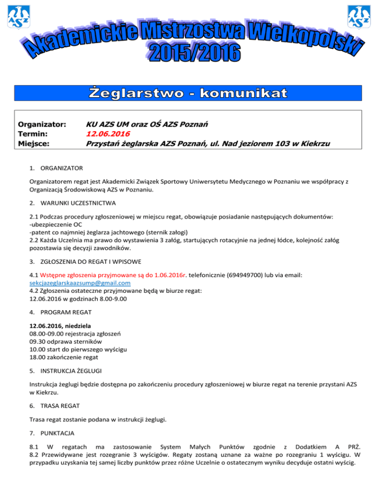 Organizator: Termin: Miejsce: KU AZS UM oraz OŚ AZS Poznań 12.06.2016 Przystań żeglarska AZS Poznań, ul. Nad jeziorem 103 w Kiekrzu 1. ORGANIZATOR Organizatorem regat jest Akademicki Związek Sportowy Uniwersytetu Medycznego w Poznaniu we współpracy z Organizacją Środowiskową AZS w Poznaniu. 2. WARUNKI UCZESTNICTWA 2.1 Podczas procedury zgłoszeniowej w miejscu regat, obowiązuje posiadanie następujących dokumentów: -ubezpieczenie OC -patent co najmniej żeglarza jachtowego (sternik załogi) 2.2 Każda Uczelnia ma prawo do wystawienia 3 załóg, startujących rotacyjnie na jednej łódce, kolejnośd załóg pozostawia się decyzji zawodników. 3. ZGŁOSZENIA DO REGAT I WPISOWE 4.1 Wstępne zgłoszenia przyjmowane są do 1.06.2016r. telefonicznie (694949700) lub via email: [email protected] 4.2 Zgłoszenia ostateczne przyjmowane będą w biurze regat: 12.06.2016 w godzinach 8.00-9.00 4. PROGRAM REGAT 12.06.2016, niedziela 08.00-09.00 rejestracja zgłoszeo 09.30 odprawa sterników 10.00 start do pierwszego wyścigu 18.00 zakooczenie regat 5. INSTRUKCJA ŻEGLUGI Instrukcja żeglugi będzie dostępna po zakooczeniu procedury zgłoszeniowej w biurze regat na terenie przystani AZS w Kiekrzu. 6. TRASA REGAT Trasa regat zostanie podana w instrukcji żeglugi. 7. PUNKTACJA 8.1 W regatach ma zastosowanie System Małych Punktów zgodnie z Dodatkiem A PRŻ. 8.2 Przewidywane jest rozegranie 3 wyścigów. Regaty zostaną uznane za ważne po rozegraniu 1 wyścigu. W przypadku uzyskania tej samej liczby punktów przez różne Uczelnie o ostatecznym wyniku decyduje ostatni wyścig. 8. POSTÓJ SPRZĘTU Wszystkie łodzie i sprzęt mają obowiązek stacjonowad w miejscach określonych przez Organizatorów. 9. NAGRODY I PUCHARY Dla zwycięzców przewidziane są nagrody rzeczowe ufundowane przez Dom Wydawniczy REBIS oraz w miarę możliwości organizatora medale i puchary. 10. ZASTRZEŻENIE ODPOWIEDZIALNOŚCI Wszyscy uczestnicy biorą udział w regatach na własną odpowiedzialnośd. Żadna z czynności wykonana lub niewykonana przez organizatorów nie zwalnia uczestników regat od ponoszenia odpowiedzialności za jakąkolwiek szkodę spowodowaną przez zawodnika lub jego jacht, wynikającą z udziału w regatach. 11. PRAWA DO WIZERUNKU 11.1 Zgłaszając się do regat zawodnik wyraża zgodę na bezpłatne wykorzystanie swego wizerunku przez Organizatorów i sponsorów podczas zdjęd, filmów i innych reprodukcji w czasie trwania regat oraz we wszystkich materiałach dotyczących regat. 11.2 Zawodnicy mogą mied obowiązek udzielania wywiadów podczas regat. 12. ŁODZIE Organizator nie zapewnia łodzi. Każda z Uczelni zobowiązana jest posiadad 1 łódź klasy Omega Standard. Istnieje możliwośd czarteru łodzi na jeziorze Kierskim. Uczelnie nie posiadające łodzi proszone są o kontakt z Organizacją Środowiskową AZS w Poznaniu. 13. INFORMACJ DODATKOWE I OSOBY KONTAKTOWE: Dodatkowe informacje można znaleźd na stronach: FB: Akademickie Mistrzostwa Wielkopolski www. poznanazs.pl osoby kontaktowe: Bartek Czachowski, tel. 694949700, email [email protected]