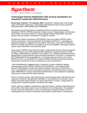 K O M U N I K A T P R A S O W DO NATYCHMIASTOWEGO OGŁOSZENIA Technologia Extreme HyDefinition (XD) od teraz standardem we wszystkich systemach HyPerformance Roosendaal, Holandia—10 Listopada, 2009—Hypertherm, światowy lider w technologii cięcia metali łukiem plazmowym, ogłosił dzisiaj wprowadzenie dwóch nowych systemów HyPerformance®—HPR130XD® oraz HPR260XD®. Wprowadzenie technologii Extreme HyDefinition® (XD) do systemów cięcia plazmą Hypertherm HPR130 i HPR260 przyniosło mnóstwo korzyści. NajwaŜniejsza z nich jest taka, Ŝe obrabiarki i formowarki metali są w stanie osiągnąć bardziej spójną jakość cięć przez dłuŜszy czas przy kosztach operacyjnych mniejszych o połowę. Podobnie jak ostatnio wprowadzony HPR400XD®, dwa nowe systemy HPRXD zostały ròwnieŜ wyposaŜone w chronioną patentem technologię PowerPierce™, pozwalającą na wykrawanie otworów o najlepszej na rynku jakości. Porównując z poprzednimi systemami HPR130 i HPR260, PowerPierce tnie metale aŜ do 25 procent głębiej, zachowując szybkość i jakość cięcia HyDefinition oraz Ŝywotność części. Nowe systemy HPRXD mogą równieŜ korzystać z ulepszonego procesu znaczenia argonem, nowego 80 amp procesu cięcia skośnego stali miękkiej oraz czujnika wysokości kontaktu omowego, zintegrowanego z palnikiem. Inne korzyści to np. moŜliwość wykrawania otworów lepszej jakości z wykorzystaniem nowej technologii Hypertherm True Hole™. W połączeniu z MTC ProNest® 2010 oraz kompatybilnymi z True Hole systemami kontroli ruchu, jak np. EDGE® Pro CNC czy ArcGlide® THC, systemy HPRXD automatycznie generują znacznie lepszą jakość wykrawania niŜ było to moŜliwe przy uŜyciu samej plazmy. - Setki przedsiębiorstw osiągają korzyści z wiodących na rynku moŜliwości naszego innowacyjnego systemu HPRXD: HyPerformance HPR400XD - mówi Kat McQuade, Kierownik Marketingowy Produktu dla rodziny produktów Hypertherm HyPerformance. Wraz z wprowadzaniem dwóch wspomnianych systemów, wprowadzamy takŜe wszystkie zalety HPR400XD do naszej linii produktów HyPerformance w celu zwiększenia wydajności oraz poziomu rentowności dla naszych klientów. Klienci na rynkach robotyki, stali konstrukcyjnej i cięcia skośnego będą mogli dostrzec nowe ulepszenia produktów, zaprojektowane specjalnie w celu spełnienia ich oczekiwań. Nowy zestaw przewodów oferuje dziesięć razy lepszą odporność na zuŜycie, a tuleja palnika ze zintegrowanym łoŜyskiem pozwala na nieskończoną rotację. Kolejny uŜyteczny dodatek to zintegrowany wskaźnik laserowy. Zamiast umiejscawiania go z boku palnika, dokonaliśmy starań, by był on faktycznie z nim zintegrowany. Ta opcjonalna korzyść przyda się uŜytkownikom, którzy chcą precyzyjnie dopasować palnik do osi linii cięcia/spawania lub wizualnie kontrolować wyrównywanie programowane i automatyczne. Y Firma Hypertherm projektuje i produkuje najbardziej zaawansowane systemy cięcia plazmą na świecie, wykorzystywane w wielu branŜach takich jak produkcja, przemysł stoczniowy czy naprawa samochodów. Linia produktów obejmuje ręczne i zmechanizowane systemy cięcia plazmą, materiały eksploatacyjne, jak równieŜ systemy sterowania CNC oraz kontroli wysokości. Dziesiątki tysięcy firm pokłada zaufanie w niezawodności i wydajności systemów Hypertherm, owocującej zwiększoną produktywnością i opłacalnością. Reputacja firmy odnośnie innowacji na polu cięcia plazmą sięga ponad 40 lat wstecz, do roku 1968, do wynalazku cięcia plazmą z wtryskiem wody. Firma ma ponad 1000 filii i partnerów reprezentujących ją na całym świecie. KONIEC Kontakt: Yvette Leeflang pod nr +31 (0) 165 596932 lub [email protected]