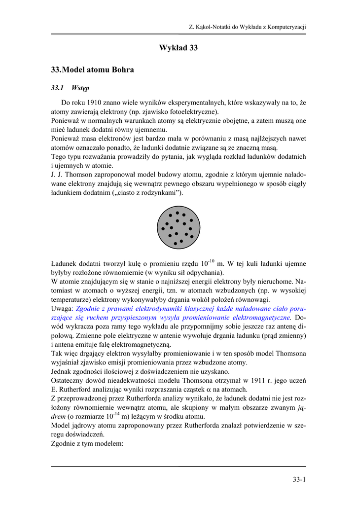 Z. Kąkol-Notatki do Wykładu z Komputeryzacji Wykład 33 33. Model atomu Bohra 33.1 Wstęp Do roku 1910 znano wiele wyników eksperymentalnych, które wskazywały na to, że atomy zawierają elektrony (np. zjawisko fotoelektryczne). Ponieważ w normalnych warunkach atomy są elektrycznie obojętne, a zatem muszą one mieć ładunek dodatni równy ujemnemu. Ponieważ masa elektronów jest bardzo mała w porównaniu z masą najlżejszych nawet atomów oznaczało ponadto, że ładunki dodatnie związane są ze znaczną masą. Tego typu rozważania prowadziły do pytania, jak wygląda rozkład ładunków dodatnich i ujemnych w atomie. J. J. Thomson zaproponował model budowy atomu, zgodnie z którym ujemnie naładowane elektrony znajdują się wewnątrz pewnego obszaru wypełnionego w sposób ciągły ładunkiem dodatnim („ciasto z rodzynkami”). Ładunek dodatni tworzył kulę o promieniu rzędu 10-10 m. W tej kuli ładunki ujemne byłyby rozłożone równomiernie (w wyniku sił odpychania). W atomie znajdującym się w stanie o najniższej energii elektrony były nieruchome. Natomiast w atomach o wyższej energii, tzn. w atomach wzbudzonych (np. w wysokiej temperaturze) elektrony wykonywałyby drgania wokół położeń równowagi. Uwaga: Zgodnie z prawami elektrodynamiki klasycznej każde naładowane ciało poruszające się ruchem przyspieszonym wysyła promieniowanie elektromagnetyczne. Dowód wykracza poza ramy tego wykładu ale przypomnijmy sobie jeszcze raz antenę dipolową. Zmienne pole elektryczne w antenie wywołuje drgania ładunku (prąd zmienny) i antena emituje falę elektromagnetyczną. Tak więc drgający elektron wysyłałby promieniowanie i w ten sposób model Thomsona wyjaśniał zjawisko emisji promieniowania przez wzbudzone atomy. Jednak zgodności ilościowej z doświadczeniem nie uzyskano. Ostateczny dowód nieadekwatności modelu Thomsona otrzymał w 1911 r. jego uczeń E. Rutherford analizując wyniki rozpraszania cząstek α na atomach. Z przeprowadzonej przez Rutherforda analizy wynikało, że ładunek dodatni nie jest rozłożony równomiernie wewnątrz atomu, ale skupiony w małym obszarze zwanym jądrem (o rozmiarze 10-14 m) leżącym w środku atomu. Model jądrowy atomu zaproponowany przez Rutherforda znalazł potwierdzenie w szeregu doświadczeń. Zgodnie z tym modelem: 33-1 Z. Kąkol-Notatki do Wykładu z Komputeryzacji • • • W środku atomu znajduje się jądro o masie w przybliżeniu równej masie całego atomu, Ładunek jądra jest równy iloczynowi liczby atomowej Z i ładunku e, Wokół jądra znajduje się Z elektronów, tak że cały atom jest obojętny. Ważnym problemem pozostaje wyjaśnienie zagadnienia stabilności takiego atomu. Elektrony nie mogą być nieruchome bo w wyniku przyciągania z dodatnim jądrem zostałyby do niego przyciągnięte i wtedy „wrócilibyśmy” do modelu Thomsona. Jeżeli dopuścimy ruch elektronów wokół jądra (tak jak planety wokół Słońca w układzie słonecznym) to też natrafiamy na trudność interpretacyjną. Krążący elektron doznaje stale przyspieszenia (dośrodkowego) i zgodnie z elektrodynamiką klasyczną wysyła energię kosztem swojej energii mechanicznej. Oznaczałoby to, że poruszałby się po spirali ostatecznie spadając na jądro (model Thomsona). Problem stabilności atomów doprowadził do powstania nowego modelu zaproponowanego przez N. Bohra. Podstawową cechą tego modelu było to, że umożliwiał przewidywanie widm promieniowania wysyłanego przez atomy. Najpierw omówimy więc podstawowe cechy tych widm. 33.2 Widma atomowe Na rysunku przedstawiony jest typowy układ do pomiaru widm atomowych. Źródłem promieniowania jest jednoatomowy gaz pobudzony do świecenia metodą wyładowania elektrycznego. Promieniowanie przechodzi przez szczelinę kolimującą, a następnie pada na pryzmat (lub siatkę dyfrakcyjną), który rozkłada promieniowanie na składowe o różnych długościach fal. Na kliszy fotograficznej uwidacznia się cecha szczególna obserwowanych widm. W przeciwieństwie do widma ciągłego emitowanego np. przez powierzchnie ciał ogrzanych do wysokich temperatur, promieniowanie wysyłane przez swobodne atomy zawiera tylko pewną liczbę długości fal. Każda z takich składowych długości fal nazywana jest linią (bo taki jest obraz szczeliny). Na rysunku na następnej stronie pokazana jest widzialna część widma atomu wodoru. 33-2 Z. Kąkol-Notatki do Wykładu z Komputeryzacji 360 400 440 480 520 560 600 640 680 λ (nm) To właśnie badanie widma wodoru doprowadziło Bohra do sformułowania nowego modelu atomu. Model ten chociaż posiada pewne braki to ilustruje idę kwantowania w sposób prosty matematycznie. 33.3 Model Bohra atomu wodoru Jak już mówiliśmy fizyka klasyczna przewidywała, że atom krążący po orbicie będzie wypromieniowywał energię, tak że częstość elektronu a za tym także częstość wysyłanego promieniowania będzie się zmieniać w sposób ciągły. Tymczasem obserwujemy bardzo ostre linie widmowe o ściśle określonej częstotliwości (długości fali). Bohr uniknął tej trudności zakładając, że podobnie jak oscylatory Plancka, tak samo atom wodoru może znajdować się w ściśle określonych stanach energetycznych, w których nie wypromieniowuje energii. Emisja następuje tylko wtedy gdy atom przechodzi z jednego stanu o energii Ek do stanu o niższej energii Ej. Ujmując to w postaci równania Ek – Ej = hv (33.1) gdzie hv oznacza kwant energii niesionej przez foton, który zostaje w trakcie przejścia wypromieniowany przez atom. Teraz konieczna jest znajomość energii stanów stacjonarnych i wtedy obliczając możliwe różnice energii będziemy mogli przewidzieć wygląd widma promieniowania emitowanego przez atom. Założenia: • elektron porusza się po orbitach kołowych o promieniu r ze środkiem w miejscu jądra, • jądro (pojedynczy proton) jest tak ciężkie, że środek masy pokrywa się ze środki