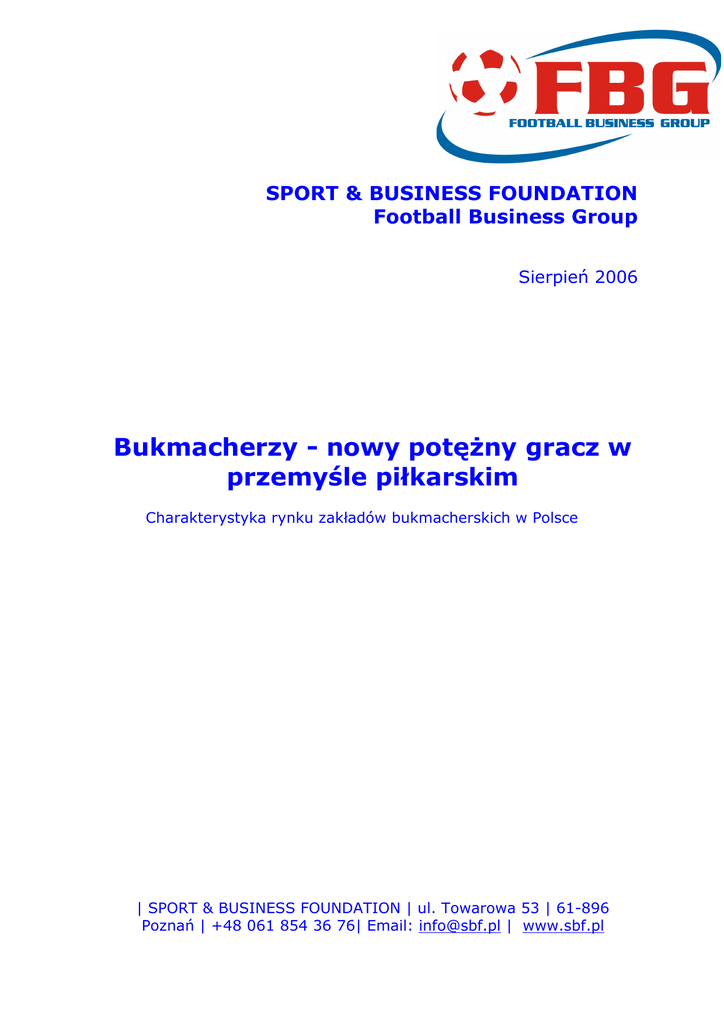 SPORT & BUSINESS FOUNDATION Football Business Group Sierpień 2006 Bukmacherzy - nowy potężny gracz w przemyśle piłkarskim Charakterystyka rynku zakładów bukmacherskich w Polsce | SPORT & BUSINESS FOUNDATION | ul. Towarowa 53 | 61-896 Poznań | +48 061 854 36 76| Email: [email protected] | www.sbf.pl Football Business Group Zamieszczony poniżej materiał jest jedynie zarysem oraz wprowadzeniem do pełnej wersji publikacji. Jeśli są Państwo zainteresowani pełną wersją, prosimy o wypełnienie formularza umieszczonego pod adresem: http://sbf.pl/fbg/index.php?action=formularz 2 Football Business Group 1. Spis treści 1. Historia piłkarskich zakładów bukmacherskich 2. Naziemne zakłady bukmacherskie w Polsce 2.1. Ustawodawstwo 2.2. Charakterystyka spółek organizujących na rynku polskim wzajemne zakłady bukmacherskie 3. Zakłady bukmacherskie w Internecie 3.1. Ustawodawstwo 3.2. Charakterystyka firm oferujących zakłady w Internecie 4. E-bukmacherzy versus bukmacherzy naziemni 4.1. Regulacje prawne 4.2. Wady i zalety ofert 4.3. Bukmacherzy w liczbach 5. Bukmacherzy a rynek ubezpieczeń w sporcie 6. Bukmacherzy liderami na rynku sponsorów sportu 7. Podsumowanie 3 Football Business Group 1. Wstęp Zakłady bukmacherskie są jedną z najdynamiczniej rozwijających się branży w polskim biznesie. W trakcie ostatnich Mistrzostw Świata w piłce nożnej polscy internauci zdecydowanie chętniej niż kilka miesięcy wcześniej odwiedzali strony z zakładami sportowymi. Jak pokazują dane Interaktywnego Instytutu Badań Rynkowych (IIBR), na konta operatorów internetowych serwisów bukmacherskich mogło w tym czasie wpłynąć ponad 10 mln złotych. Firmy, pozwalające graczom zakładać się o wynik sportowego zdarzenia coraz częściej pojawiają się w mediach i na stadionach jako reklamodawcy. Organizatorzy e-hazardu przystąpili w ostatnich latach do intensywnej marketingowej ofensywy. Nazwy firm zajmujących się zakładami internetowymi widnieją na koszulkach najlepszych zespołów świata w piłce nożnej (np. AC Milan i Werder Brema – bwin, Sewilla FC – 888.com). Raport World Sponsorship Monitor mówi, że w pierwszym półroczu 2006 roku firmy e-hazardowe podpisały umowy sponsorskie wartości 300 mln funtów i stały się tym samym liderami na rynku sponsorów sportu. W klubach polskiej ekstraklasy coraz więcej zespołów ma podpisane umowy sponsorskie z firmami oferującymi zakłady online. Bwin sponsoruje Widzew Łódź i Legię Warszawa, natomiast Gamebookers Koronę Kielce. Podczas Mistrzostw Świata w Niemczech Tomasz Frankowski (Sportingbet) oraz Maciej Żurawski (Bet24) puszczali do nas oczko z polskich billboardów zachęcając do obstawiania. Natomiast firma Expekt poszła jeszcze dalej i została oficjalnym sponsorem Reprezentacji Polski w piłce nożnej. Powstaje więc pytanie jak będzie kształtował bukmacherskich w najbliższej przyszłości? się rynek usług Odpowiedź w postaci kompleksowej analizy branży znajdą Państwo w pełnej wersji raportu. 4 Football Business Group Autorzy: Roman Zaczkiewicz Mateusz Cholewa Sebastian Miroński Redakcja: Football Business Group Sebastian Mironski mobile: + 48 508 362 414 e-mail: [email protected] www.footballbusiness.pl © Sport & Business Foundation 2006. All rights reserved. 5