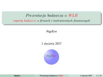 Prezentacja badawcza o WLH raporty badawcze o firmach i instrumentach finansowych AlgoExe 1 stycznia 2017 AlgoExe AlgoExe Prezentacja badawcza o WLH 1 stycznia 2017 1 / 11 Prezentujemy badania o WLH. Prezentacja zawiera prognozy dla WLH. Słowa kluczowe: raporty badawcze, firmy, akcje, forex, analityka predykcyjna, uczenie maszynowe, eksploracja danych, big data. AlgoExe AlgoExe Prezentacja badawcza o WLH 1 stycznia 2017 2 / 11 1 Wstęp 2 Predykcja Dniowa Miesina Roczna AlgoExe AlgoExe Prezentacja badawcza o WLH 1 stycznia 2017 3 / 11 Wstęp symbol: WLH nazwa: WILLIAM LYON HOMESCL A giełda: US ostatnia cena (2016–12–27): 19.97 cena minimalna z ostatnich 5 dni: 19.92 cena maksymalna z ostatnich 5 dni: 20.25 AlgoExe AlgoExe Prezentacja badawcza o WLH 1 stycznia 2017 4 / 11 Ceny akcji Przewidywana cena akcji dla 2016–12–27: 20.44. y 21 16 2016/08 x 2016/12 Rysunek 1 : Dniowe ceny akcji dla WLH jako przewidywana funkcja czasu. Punkty reprezentują historyczne dniowe ceny akcji. AlgoExe AlgoExe Prezentacja badawcza o WLH 1 stycznia 2017 5 / 11 Ceny akcji Przewidywana cena akcji dla 2017–01: 20.56. y 29 10 2013/07 x 2016/12 Rysunek 2 : Miesine ceny akcji dla WLH jako przewidywana funkcja czasu. Punkty reprezentują historyczne miesine ceny akcji. AlgoExe AlgoExe Prezentacja badawcza o WLH 1 stycznia 2017 6 / 11 Rozkład wolumenu po cenie 10-kwantyle: 1 to 15.77, 2 to 16.06, 8 to 17.58, 9 to 20.10. 0.9 y y 2.0 0.0 0.0 16 x 21 (a) 16 x 21 (b) Rysunek 3 : Przewidywany miesiny rozkład prawdopodobieństwa dniowego wolumenu po cenie dla WLH. (a) Przewidywana dystrybuanta oraz punkty reprezentujące dane. (b) Przewidywana funkcja gęstości prawdopodobieństwa AlgoExe Prezentacja badawcza o WLH 1 stycznia 2017 AlgoExe 7 / 11 Rozkład zmiany ceny 10-kwantyle: 8 to 3.10%, 9 to 5.33%. 0.9 y y 3.0 0.0 0.0 0 x 12 (a) 0 12 x (b) Rysunek 4 : Przewidywany miesiny rozkład prawdopodobieństwa dniowych zmian cen dla WLH. (a) Przewidywana dystrybuanta oraz punkty reprezentujące dane. (b) Przewidywana funkcja gęstości prawdopodobieństwa AlgoExe Prezentacja badawcza o WLH 1 stycznia 2017 AlgoExe 8 / 11 Ceny akcji Przewidywana cena akcji dla 2017: 14.20. y 25 15 2014 x 2016 Rysunek 5 : Roczne ceny akcji dla WLH jako przewidywana funkcja czasu. Punkty reprezentują historyczne roczne ceny akcji. AlgoExe AlgoExe Prezentacja badawcza o WLH 1 stycznia 2017 9 / 11 Rozkład wolumenu po cenie 10-kwantyle: 1 to 10.34, 2 to 12.34, 8 to 21.74, 9 to 23.82. y y 0.9 1.0 0.0 8 x 25 (a) 8 x 25 (b) Rysunek 6 : Przewidywany roczny rozkład prawdopodobieństwa dniowego wolumenu po cenie dla WLH. (a) Przewidywana dystrybuanta oraz punkty reprezentujące dane. (b) Przewidywana funkcja gęstości prawdopodobieństwa AlgoExe Prezentacja badawcza o WLH 1 stycznia 2017 AlgoExe 10 / 11 Rozkład zmiany ceny 10-kwantyle: 8 to 3.92%, 9 to 5.39%. 0.9 y y 3.0 0.0 0.0 0 x 17 (a) 0 17 x (b) Rysunek 7 : Przewidywany roczny rozkład prawdopodobieństwa dniowych zmian cen dla WLH. (a) Przewidywana dystrybuanta oraz punkty reprezentujące dane. (b) Przewidywana funkcja gęstości prawdopodobieństwa AlgoExe Prezentacja badawcza o WLH 1 stycznia 2017 AlgoExe 11 / 11