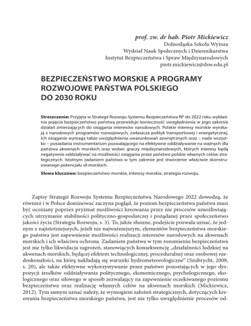 prof. zw. dr hab. Piotr Mickiewicz Dolnośląska Szkoła Wyższa Wydział Nauk Społecznych i Dziennikarstwa Instytut Bezpieczeństwa i Spraw Międzynarodowych [email protected] BEZPIECZEŃSTWO MORSKIE A PROGRAMY ROZWOJOWE PAŃSTWA POLSKIEGO DO 2030 ROKU Streszczenie: Przyjęta w Strategii Rozwoju Systemu Bezpieczeństwa RP do 2022 roku wykładnia pojęcia bezpieczeństwo państwa przewiduje konieczność uwzględnienia w jego zakresie działań zmierzających do osiągania interesów narodowych. Polskie interesy morskie wynikają z narodowych programów rozwojowych, zwłaszcza polityk transportowej i energetycznej. Ich osiąganie wymaga także uwzględnienia uwarunkowań zewnętrznych oraz – nade wszystko – posiadania instrumentarium pozwalającego na efektywne oddziaływanie na ważnych dla państwa akwenach morskich oraz wobec graczy międzynarodowych, których interesy będą negatywnie oddziaływać na możliwości osiągania przez państwo polskie własnych celów strategicznych. Istotnym zadaniem państwa w tym zakresie jest stworzenie właściwie skonstruowanego potencjału sił morskich. Słowa kluczowe: bezpieczeństwo morskie, interesy morskie, strategia rozwoju. Zapisy Strategii Rozwoju Systemu Bezpieczeństwa Narodowego 2022 dowodzą, że również i w Polsce dominować zaczyna pogląd, że poziom bezpieczeństwa państwa musi być oceniany poprzez pryzmat możliwości kreowania przez nie procesów umożliwiających utrzymanie stabilności polityczno-gospodarczej i pożądanej przez społeczeństwo jakości życia (Strategia Rozwoju, s. 3). To, jakże słuszne, podejście pozwala uznać, że jednym z najistotniejszych, jeżeli nie najważniejszym, elementów bezpieczeństwa morskiego państwa jest zapewnienie możliwości realizacji interesów narodowych na akwenach morskich i ich właściwa ochrona. Zadaniem państwa w tym rozumieniu bezpieczeństwa jest nie tylko likwidacja zagrożeń, stanowiących konsekwencję „działalności ludzkiej na akwenach morskich, będącej efektem technologicznej, proceduralnej oraz osobowej niedoskonałości, na którą nakładają się warunki hydrometeorologiczne” (Szubrycht, 2008, s. 20), ale także efektywne wykorzystywanie przez państwo pozostających w jego dyspozycji środków oddziaływania politycznego, ekonomicznego, psychologicznego, ekologicznego oraz siłowego w sposób zezwalający na zapewnienie oczekiwanego poziomu bezpieczeństwa oraz realizację własnych celów na akwenach morskich (Mickiewicz, 2012). Tym samym uznać należy, że wymogiem założeń strategicznych, dotyczących kreowania bezpieczeństwa morskiego państwa, jest nie tylko uwzględnienie procesów od- 78 Rocznik Bezpieczeństwa Międzynarodowego 2014, vol. 8, nr 2 działujących na poziom bezpieczeństwa militarnego oraz zapewnienia bezpieczeństwa żeglugi i życia na morzu, ale także zwalczanie zjawisk prowadzenia działalności przestępczej na morzu oraz prowadzenia przedsięwzięć zmierzających do zapewnienia realizacji narodowych interesów na wybranych akwenach morskich. Interesy morskie w polskich programach rozwojowych i generowane przez nie wyzwania dla bezpieczeństwa państwa Polska, jako państwo nieposiadające potencjału i zdolności do samodzielnego oddziaływania na globalne procesy polityczno-gospodarcze, swoje interesy narodowe koncentruje w wybranych regionach oraz konkretnych obszarach życia politycznego i gospodarczego. W odniesieniu do akwenów morskich, także ze względu zakres współpracy politycznej w Europie i zlewisku Morza Bałtyckiego, polskie interesy narodowe są wręcz utożsamiane z kwestiami gospodarczymi. Ale nie można ich postrzegać wyłącznie w kategorii tak zwanej gospodarki morskiej1, gdyż nie stanowi ona istotnego segmentu polskiej gospodarki. Zalicza się do niej zaledwie 0,3% polskich podmiotów gospodarczych, zatrudniających 0,6% ogółu pracowników najemnych, wytwarzających 0,9% całości przychodów państwa. Tabela 1. Potencjał polskiej gospodarki morskiej na tle gospodarki narodowej w województwach nadmorskich. Województwo pomorskie zachodniopomorskie warmińsko -mazurskie Liczba podmiotów gospodarki morskiej 5807 2783 230 Podmioty gospodarki morskiej w województwie (w %) 2,3% 1,3%, 0,2% Pracujący w gospodarce morskiej (w %) 5,2% 4,4% 0,4% Źródło: Rocznik Statystyczny Gospodarki Morskiej 2012, Główny Urząd Statystyczny i Urząd Statystyczny w Szczecinie, Szczecin 2012, s. 24-25. Jednak w połączeniu z gospodarczymi i politycznymi konsekwencjami form i skali, prowadzonej drogą morską, wymiany handlowej, gospodarka morska, pośrednio, determinuje interesy Rzeczypospolitej i decyduje jej pozycji międzynarodowej oraz poziomie bezpieczeństwa. Dodatkowo, na interesy te oddziałuje charakter układu przestrzennego bałtyckich linii transportowych i przewozów towarowych. Ten natomiast należy rozpatrywać także w połączeniu z charakterystyką fizyczno-hydrologiczną akwenu, co ma istotne znaczenie właśnie w kontekście polskim2. Istotną rolę odgrywają także inne 1 Gospodarka morska, wg Polskiej Klasyfikacji Działalności ,to „system działalności gospodarczej i jej skutków związany ze środowiskiem morza i jego zlewisk, polegający na produkcji i przetwórstwie, podziale oraz konsumpcji dóbr i usług oraz morskim planowaniu przestrzennym” (PKD, 2007). 2 Dotyczy to zwłaszcza trasy tak zwanego bałtyckiego toru głębokowodnego, który wykorzystują do żeglugi największe jednostki, w tym zbiornikowce, oraz dominujących kierunków prądów wiatrowych, spychających na polskie wybrzeże wszelkie zanieczyszczenia. Artykuły 79 procesy, toczące się w otoczeniu Polski i na akwenie Morza Bałtyckiego, które można definiować także jako potencjalne wyzwania dla bezpieczeństwa morskiego Polski. Wśród nich wyróżnić należy: –– zmianę charakteru powiązań gospodarczych państw regionu, prowadzących do przeobrażeń w regionalnym układzie sił oraz fu
