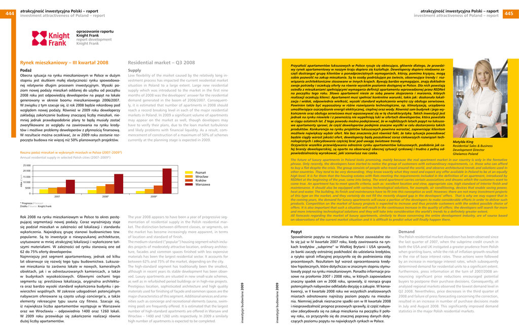 atrakcyjność inwestycyjna Polski – raport xxxxxxxx xxxxxxxxx attractiveness of Poland – report investment atrakcyjność inwestycyjna Polskixxxxxxxx – raport investment attractiveness of Poland – report xxxx 445 opracowanie raportu Knight Frank report development Knight Frank Rynek mieszkaniowy – III kwartał 2008 Residential market – Q3 2008 Podaż Supply Obecna sytuacja na rynku mieszkaniowym w Polsce w dużym stopniu jest skutkiem małej elastyczności rynku spowodowanej relatywnie długim procesem inwestycyjnym. Wysoki poziom nowej podaży mieszkań oddanej do użytku od początku 2008 roku jest odpowiedzią deweloperów na popyt na lokale generowany w okresie boomu mieszkaniowego 2006/2007. W związku z tym szacuje się, iż rok 2008 będzie rekordowy pod względem nowej podaży. Również w 2009 roku deweloperzy zakładają zakończenie budowy znaczącej liczby mieszkań, niemniej jednak prawdopodobnie plany te będą musiały zostać zweryfikowane ze względu na zawirowania na rynku kredytów i możliwe problemy deweloperów z płynnością finansową. W rezultacie można oczekiwać, że w 2009 roku zostanie rozpoczęta budowa nie więcej niż 50% planowanych projektów. Low flexibility of the market caused by the relatively long investment process has impacted the current residential market situation in Poland to a large extent. Large new residential supply which was introduced to the market in the first nine months of 2008 was the developers’ answer for the residential demand generated in the boom of 2006/2007. Consequently, it is estimated that number of apartments in 2008 should reach a record breaking level in each of the major residential markets in Poland. In 2009 a significant volume of apartments may appear on the market as well, though developers may have to verify their plans, due to the loan market turbulence and likely problems with financial liquidity. As a result, commencement of construction of a maximum of 50% of schemes currently at the planning stage is expected in 2009. Przyszłość apartamentów luksusowych w Polsce rysuje się obiecująco, głównie dlatego, że prawdziwy rynek apartamentowy w naszym kraju dopiero się kształtuje. Deweloperzy dopiero niedawno zaczęli dostrzegać grupę klientów o ponadprzeciętnych wymaganiach, którzy, pomimo kryzysu, mogą sobie pozwolić na zakup mieszkania. Są to osoby podróżujące po świecie, obserwujące trendy i rozwiązania architektoniczne stosowane w innych krajach. Bywają bardzo wymagające, znają dokładnie swoje potrzeby i oczekują oferty na równie wysokim poziomie dostępnej w Polsce. Dla nich powstają osiedla z mieszkaniami spełniającymi wymagania definicji apartamentu wprowadzonej przez REDNet na początku tego roku. Słowo apartament niesie ze sobą pewne skojarzenia i marzenia, których realizacji oczekują klienci. Apartament musi spełniać konkretne warunki, takie jak: doskonała lokalizacja i widok, odpowiednia wielkość, wysoki standard wykończenia wnętrz czy obsługa serwisowa. Powinien także być wyposażony w różne rozwiązania technologiczne, np. klimatyzację, urządzenia umożliwiające oszczędzanie energii elektrycznej, cieplnej oraz wody. Również sam budynek i jego wykończenie oraz obsługa serwisowa musi wpasowywać się w tę charakterystykę. Takich inwestycji jest jednak na rynku niewiele i z pewnością nie wypełniają luki w ofertach deweloperów, która powstała w ciągu ostatnich lat. Z tego powodu można podejrzewać, że w najbliższych latach popyt na luksusowe apartamenty sprawi, że część deweloperów podejmie znaczne wysiłki w celu dostarczenia takich produktów. Konkurencja na rynku projektów luksusowych powinna wzrastać, zapewniając klientom możliwie największy wybór ofert. Nie bez znaczenia jest również fakt, że taka sytuacja powodować będzie ciągły wzrost jakości ofert, deweloperzy będą poszukiwać coraz ciekawszych rozwiązań technologicznych i zdecydowanie częściej brać pod uwagę światowe trendy. Oczywiście wszelkie przewidywania odnośnie rynku apartamentów luksusowych, podobnie jak całej branży deweloperskiej, są oparte na obserwacji obecnej sytuacji rynkowej i trudno z pełną odpowiedzialnością wyrokować, jaki scenariusz nas czeka. Roczna podaż mieszkań w wybranych miastach w Polsce (2007–2009*) Annual residential supply in selected Polish cities (2007–2009*) 20 000 Poznań Wrocław Kraków Warszawa 15 000 10 000 5000 0 2007 2008* 2009* inwestycje budowlane 2009 The year 2008 appears to have been a year of progressive segmentation of residential supply in the Polish residential market. The distinction between different classes, or segments, on the market has become increasingly more apparent, in terms of location and standard of finish. The medium-standard (“popular”) housing segment which includes projects of moderately attractive location, ordinary architecture, facades and common spaces finished with less expensive materials has been the largest residential sector. It accounts for between 62% and 75% of the market, depending on the city. The high-standard segment has traditionally been the smallest, although in recent years its stable development has been observed. Luxury apartments are situated in new small-scale schemes, as well as in refurbished period buildings or in high-rise projects. Prestigious location, sophisticated architecture and high quality materials used for finishing of façade and common spaces are the major characteristics of this segment. Additional services and amenities such as concierge and recreational elements (sauna, swimming pool) are frequently offered. It is estimated that the largest number of high-standard apartments are offered in Warsaw and Wrocław – 1400 and 1260 units respectively. In 2009 a similarly high number of apartments is expected to be completed. inwestycje budowlane 2009 * Prognoza / Forecast Źródło / Source: Knight Frank Rok 2008 na