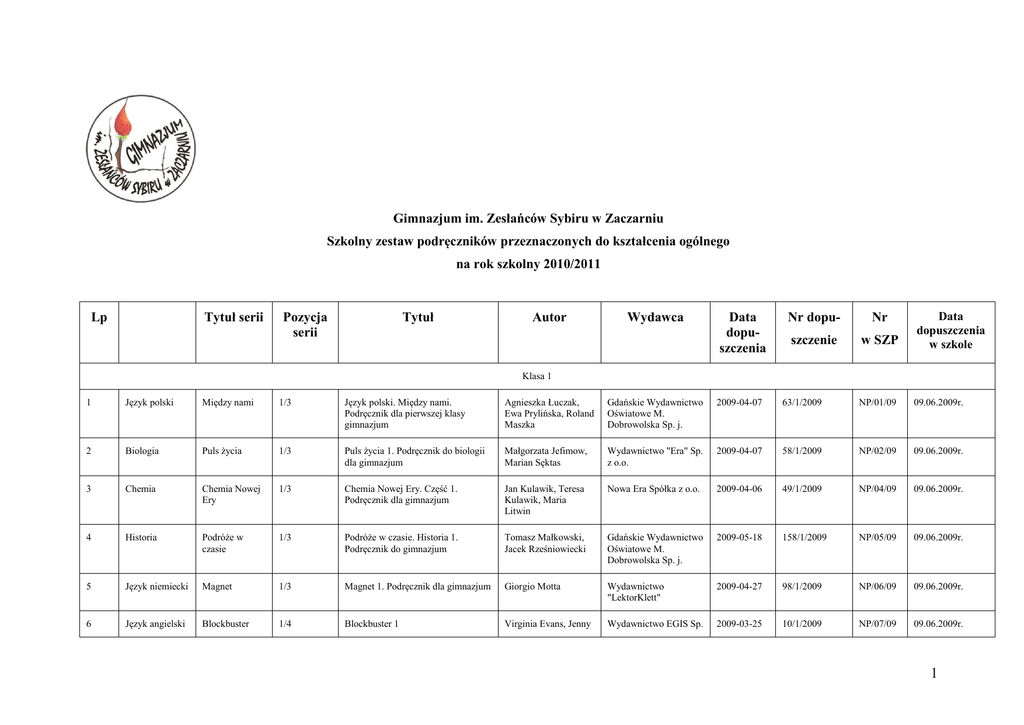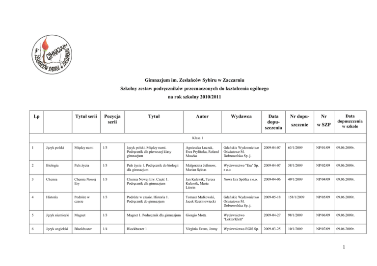 Gimnazjum im. Zesłańców Sybiru w Zaczarniu Szkolny zestaw podręczników przeznaczonych do kształcenia ogólnego na rok szkolny 2010/2011 Tytuł serii Lp Tytuł Pozycja serii Autor Wydawca Data dopuszczenia Nr dopu- Nr szczenie w SZP Data dopuszczenia w szkole Klasa 1 1 Język polski Między nami 1/3 Język polski. Między nami. Podręcznik dla pierwszej klasy gimnazjum Agnieszka Łuczak, Ewa Prylińska, Roland Maszka Gdańskie Wydawnictwo Oświatowe M. Dobrowolska Sp. j. 2009-04-07 63/1/2009 NP/01/09 09.06.2009r. 2 Biologia Puls życia 1/3 Puls życia 1. Podręcznik do biologii dla gimnazjum Małgorzata Jefimow, Marian Sęktas Wydawnictwo "Era" Sp. z o.o. 2009-04-07 58/1/2009 NP/02/09 09.06.2009r. 3 Chemia Chemia Nowej Ery 1/3 Chemia Nowej Ery. Część 1. Podręcznik dla gimnazjum Jan Kulawik, Teresa Kulawik, Maria Litwin Nowa Era Spółka z o.o. 2009-04-06 49/1/2009 NP/04/09 09.06.2009r. 4 Historia Podróże w czasie 1/3 Podróże w czasie. Historia 1. Podręcznik do gimnazjum Tomasz Małkowski, Jacek Rześniowiecki Gdańskie Wydawnictwo Oświatowe M. Dobrowolska Sp. j. 2009-05-18 158/1/2009 NP/05/09 09.06.2009r. 5 Język niemiecki Magnet 1/3 Magnet 1. Podręcznik dla gimnazjum Giorgio Motta Wydawnictwo "LektorKlett" 2009-04-27 98/1/2009 NP/06/09 09.06.2009r. 6 Język angielski Blockbuster 1/4 Blockbuster 1 Virginia Evans, Jenny Wydawnictwo EGIS Sp. 2009-03-25 10/1/2009 NP/07/09 09.06.2009r. 1 Dooley z o.o. Blockbuster 2 Virginia Evans, Jenny Dooley Wydawnictwo EGIS Sp. z o.o. 2009-03-25 10/2/2009 NP/08/09 09.06.2009r. Muzyczny świat Teresa Wójcik Grupa Edukacyjna S.A. (brand MAC Edukacja) 2009-05-13 138/2009 NP/09/09 09.06.2009r. Gdańskie Wydawnictwo Oświatowe M. Dobrowolska Sp. j. 2009-05-26 168/1/2009 NP/10/09 09.06.2009r. NP/11/09 09.06.2009r. 2009-05-05 120/1/2009 2009-06-03 185/2009 NP/12/09 09.06.2009r. AZ-3-01/1 NP/13/09 09.06.2009r. 7 Język angielski 8 Muzyka 9 Matematyka Matematyka z plusem 1/3 Matematyka 1. Podręcznik dla klasy pierwszej gimnazjum Zofia Bolałek, Małgorzata Dobrowolska, Marta Jucewicz, Marcin Karpinski, Jacek Lech, Adam Mysior, Krystyna Zarzycka 10 Geografia Geografia bez tajemnic 1/3 Geografia bez tajemnic. Podręcznik dla klasy pierwszej gimnazjum Edward Dudek Sztuka w zasięgu ręki Dariusz Stępień, Wojciech Sygut Grupa Edukacyjna S.A. (brand MAC Edukacja) Blockbuster 2/4 Wydawnictwo Edukacyjne WIKING II Juszczak i Szwancar Spółka Jawna 11 Plastyka 12 Religia Odsłonić twarz Chrystusowi 1/3 Szukam Was. Podręcznik do religii dla I klasy gimnazjum Red. Władysław Kubik SJ Wydawnictwo WAM 14 Fizyka Świat fizyki 1/3 Świat fizyki. Podręcznik dla uczniów gimnazjum. Część 1 Barbara Sagnowska, Maria Rozenbajgier, Ryszard Rozenbajgier, Danuta Szot-Gawlik, Małgorzata Godlewska Wydawnictwo "ZamKor" P. Sagnowski i Wspólnicy Sp. j. 2009-03-25 11/1/2009 NP/14/09 09.06.2009r. 15 Informatyka 1/1 Informatyka Europejczyka. Podręcznik dla gimnazjum. Edycja: Windows Vista, Linux Ubuntu, MS Office 2007, OpenOffice.org. Wydanie II Jolanta Pańczyk Grupa Wydawnicza "Helion" S.A. 2009-04-17 75/2009 NP/15/09 09.06.2009r. Klasa 2 1 Język polski Między nami 2/3 Między nami. Podręcznik do języka polskiego dla klasy drugiej gimnazjum Agnieszka Łuczak, Ewa Prylińska Gdańskie Wydawnictwo Oświatowe M. Dobrowolska Sp. j. 2010-06-04 63/2/2010 NP/01/10 14.06.2010r. 2 Biologia Puls życia 2/3 Puls życia 2. Podręcznik do biologii Małgorzata Jefimow Wydawnictwo "Era" Sp. 2009-04-07 58/2/2009 NP/02/10 14.06.2010r. 2 dla gimnazjum z o.o. 3 Chemia Chemia Nowej Ery 2/3 Chemia Nowej Ery. Część 2. Podręcznik dla gimnazjum Jan Kulawik, Teresa Kulawik, Maria Litwin 4 Historia Podróże w czasie 2/3 Podróże w czasie. Historia II. Podręcznik do gimnazjum Tomasz Małkowski, Jacek Rześniowiecki 5 Język niemiecki Magnet 2/3 Magnet 2. Język niemiecki dla gimnazjum Giorgio Motta 6 Język angielski Blockbuster 3/4 Blockbuster 3 Virginia Evans, Jenny Dooley 7 Język angielski Blockbuster 4/4 Blockbuster 4 8 Matematyka Matematyka z plusem 2/3 Virginia Evans,Jenny Dooley Zofia Bolałek, Małgorzata Dobrowolska, Marta Jucewicz, Marcin Karpiński, Jacek Lech, Adam Mysior, Krystyna Zarzycka 9 Geografia 10 Religia 11 Fizyka 12 13 15 Geografia bez tajemnic Matematyka 2. Podręcznik dla klasy drugiej gimnazjum 2009-12-03 49/2/2009 NP/03/10 14.06.2010r. 2010-06-09 158/2/2010 NP/04/10 14.06.2010r. 2010-06-04 98/2/2010 NP/05/10 14.06.2010r. Wydawnictwo EGIS Sp. z o.o. 2009-03-25 10/3/2009 NP/06/10 14.06.2010r. Wydawnictwo EGIS Sp. z o.o. 2009-03-25 10/4/2009 NP/07/10 14.06.2010r. NP/08/10 14.06.2010r. Nowa Era Spółka z o.o. Gdańskie Wydawnictwo Oświatowe M. Dobrowolska Sp. j. Wydawnictwo "LektorKlett" Gdańskie Wydawnictwo Oświatowe M. Dobrowolska Sp. j. 2010-01-18 168/2/2010 2010-06-04 120/2/2010 NP/09/10 14.06.2010r. AZ-3-01/2 NP/10/10 14.06.2010r. NP/11/10 14.06.2010r. NP/12/10 14.06.2010r. NP/13/10 14.06.2010r. NP/14/10 14.06.2010r. 2/3 Geografia bez tajemnic. Podręcznik dla klasy drugiej gimnazjum Edward Dudek, Jan Wójcik Wydawnictwo Edukacyjne WIKING II Sp. J. 2/3 Jestem z Wami Podręcznik do religii dla klasy II gimnazjum Red. Władysław Kubik SJ Wydawnictwo WAM Świat fizyki. Podręcznik dla uczniów gimnazjum. Część 2 Barbara Sagnowska Maria Rozenbajgier Ryszard Rozenbajgier Danuta Szot-Gawlik Małgorzata Godlewska Barbara Sagnowska, Maria Rozenbajgier, Ryszard Rozenbajgier, Danuta Szot-Gawlik, Małgorzata Godlewska Wydawnictwo "ZamKor" P. Sagnowski i Wspólnicy Sp. j. 2010-01-11 11/2/2010 Iwona Janicka. Aleksandra Kucia, Tomasz Maćkowski Nowa Era Sp. z o.o., Wydawnictwo Era Sp. z o.o. 2009-04-17 77/1/2009 Iwona Janicka, Arkadiusz Janicki, Aleksandra Kucia, Tomasz Maćkowski Nowa Era Sp. z o.o., Wydawnictwo Era Sp. z o.o. 2010-01-07 77/2/2010 Waldemar Czyżewski Nowa Era Spółka z o.o. 2009-06-09 196/1/2009 Świat fizyki 2/3 Wiedza o społeczeństwie Dziś i jutro 1/2 Wiedza o społeczeństwie Dziś i jutro Zajęcia techniczne Technika w praktyce 2