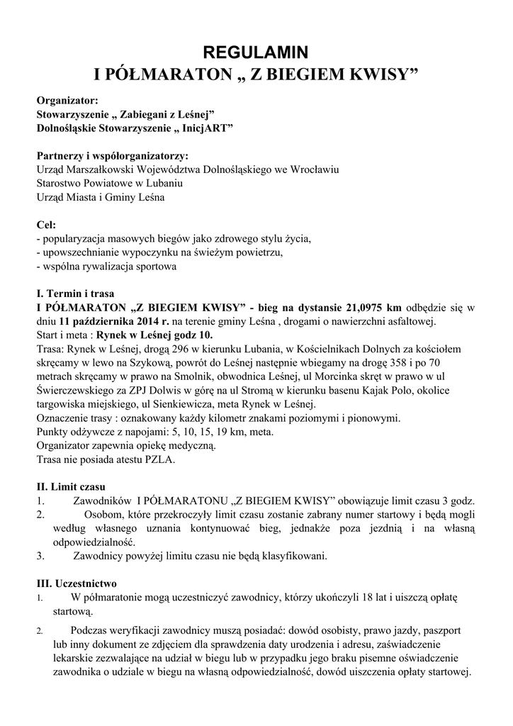 REGULAMIN I PÓŁMARATON „ Z BIEGIEM KWISY” Organizator: Stowarzyszenie „ Zabiegani z Leśnej” Dolnośląskie Stowarzyszenie „ InicjART” Partnerzy i współorganizatorzy: Urząd Marszałkowski Województwa Dolnośląskiego we Wrocławiu Starostwo Powiatowe w Lubaniu Urząd Miasta i Gminy Leśna Cel: popularyzacja masowych biegów jako zdrowego stylu życia, upowszechnianie wypoczynku na świeżym powietrzu, wspólna rywalizacja sportowa I. Termin i trasa I PÓŁMARATON „Z BIEGIEM KWISY” bieg na dystansie 21,0975 km odbędzie się w dniu 11 października 2014 r. na terenie gminy Leśna , drogami o nawierzchni asfaltowej. Start i meta : Rynek w Leśnej godz 10. Trasa: Rynek w Leśnej, drogą 296 w kierunku Lubania, w Kościelnikach Dolnych za kościołem skręcamy w lewo na Szykową, powrót do Leśnej następnie wbiegamy na drogę 358 i po 70 metrach skręcamy w prawo na Smolnik, obwodnica Leśnej, ul Morcinka skręt w prawo w ul Świerczewskiego za ZPJ Dolwis w górę na ul Stromą w kierunku basenu Kajak Polo, okolice targowiska miejskiego, ul Sienkiewicza, meta Rynek w Leśnej. Oznaczenie trasy : oznakowany każdy kilometr znakami poziomymi i pionowymi. Punkty odżywcze z napojami: 5, 10, 15, 19 km, meta. Organizator zapewnia opiekę medyczną. Trasa nie posiada atestu PZLA. II. Limit czasu 1. Zawodników I PÓŁMARATONU „Z BIEGIEM KWISY” obowiązuje limit czasu 3 godz. 2. Osobom, które przekroczyły limit czasu zostanie zabrany numer startowy i będą mogli według własnego uznania kontynuować bieg, jednakże poza jezdnią i na własną odpowiedzialność. 3. Zawodnicy powyżej limitu czasu nie będą klasyfikowani. III. Uczestnictwo 1. W półmaratonie mogą uczestniczyć zawodnicy, którzy ukończyli 18 lat i uiszczą opłatę startową. 2. Podczas weryfikacji zawodnicy muszą posiadać: dowód osobisty, prawo jazdy, paszport lub inny dokument ze zdjęciem dla sprawdzenia daty urodzenia i adresu, zaświadczenie lekarskie zezwalające na udział w biegu lub w przypadku jego braku pisemne oświadczenie zawodnika o udziale w biegu na własną odpowiedzialność, dowód uiszczenia opłaty startowej. 3. Wszyscy zawodnicy muszą zostać zweryfikowani w Biurze Zawodów w dniu 11.10.2014 r. w godzinach 6:30 – 9:30. 4. Warunkiem dopuszczenia zawodnika do biegu będzie własnoręczne podpisanie formularza zgłoszeniowego. IV. Klasyfikacja 1. Generalna kobiet. 2. 2. Generalna mężczyzn. 3. Najlepszy z Gminy 4. Najlepszy z Powiatu 5. W kategoriach wiekowych: Mężczyźni M18 (1829 lat), M30 (3039 lat), M40 (4049 lat), M50 (5059 lat), M60 (6069 lat), M70 (70 lat i więcej) Kobiety K18 (1829 lat), K30 (3039 lat), K40 (4049 lat), K50 (5059 lat), K60 (6069 lat), K70 (70 lat i więcej) Do zakwalifikowania do odpowiedniej klasyfikacji wiekowej organizatorzy stosują rok urodzenia. V. Zgłoszenia 1. Zgłoszenia do udziału w półmaratonie można dokonywać: poprzez formularz zgłoszeniowy dostępny na stronie internetowej http://zapisy.ultimasport.pl/22 do dnia 10.10.2014 r. osobiście w dniu biegu tj. 11.10.2014 r. w Biurze Zawodów w Hali sportowej przy Szkole Podstawowej w Smolniku, w godzinach od 6:30 do 9:30. 2. Osoby zgłoszone przez internet muszą przed startem podpisać formularz zgłoszeniowy. 3. Za zgłoszenie uważa się wypełnienie formularza zgłoszeniowego i uiszczenie opłaty startowej. 4. Limit zawodników na trasie I PÓŁMARATONU „Z BIEGIEM KWISY” wynosi 200 osób (decyduje kolejność zgłoszenia oraz uiszczenia opłaty startowej). VI. Opłata startowa 1. Opłata startowa za udział w półmaratonie wynosi: 20 zł, jeżeli jest dokonana do dnia 10.10.2014 r. włącznie, 40 zł, jeżeli jest dokonana w dniu zawodów 11.10.2014 r. UWAGA: nr rachunku: 92 8392 0004 4204 2505 2000 0010 dane posiadacz rachunku: Stowarzyszenie „Zabiegani z Leśnej” ul. Baworowo 76/2 59820 Leśna Tytułem: Imię Nazwisko, I Półmaraton „Z BIEGIEM KWISY” 2. O wysokości opłaty startowej decyduje dzień, w którym dokonywana jest transakcja, a nie dzień zgłoszenia się do biegu. 3. Zwolnieni z opłaty startowej są uczestnicy, którzy mają 70 lat i więcej, (tj. osoby urodzone w roku 1944 i starsze). 4. Opłatę startową należy wnosić poprzez system płatności udostępniony podczas rejestracji 5. Organizator nie odpowiada za zaginięcie zgłoszenia oraz przekazu pocztowego lub przelewu bankowego z winy poczty lub banku. 6. Każdy uczestnik jest zobowiązany do wniesienia opłaty startowej w ciągu 7 dni od momentu dokonania zgłoszenia do biegu. W przeciwnym wypadku jego zgłoszenie zostanie anulowane. 7. W dniu zawodów, tj. 11.10.2014 r. opłatę startową będzie można uiścić płacąc gotówką w Biurze Zawodów , w godzinach od 6:30 do 9:30. 8. Opłata raz uiszczona nie podlega zwrotowi. 9. Nie ma możliwości przeniesienia raz wniesionej opłaty na innego uczestnika. 10. Rachunki i faktury wystawiane są tylko podczas rejestracji internetowej i gotowe do odbioru w dniu zawodów. VII. Nagrody 1. Zdobywcy miejsc IIII w klasyfikacji generalnej kobiet i mężczyzn otrzymają puchary oraz nagrody rzczowe. 2. Zdobywcy miejsc IIII w kategoriach wiekowych kobiet i mężczyzn otrzymają puchary oraz nagrody rzeczowe. 3. Zdobywcy miejsc IIII w klasyfikacji generalnej kobiet i mężczyzn otrzymają puchary w swoich kategoriach wiekowych. 4. W ramach wpisowego uczestnik półmaratonu otrzymuje: koszulkę z nadrukiem, napój oraz numer startowy z agrafkami, a po biegu okolicznościowy medal, posiłek regeneracyjny. 5. Koronacja zwycięzców i losowanie nagród o godz 13.30 na Rynku w Leśnej. VIII. Bezpieczeństwo uczestników biegu 1. Biegi odbędą się przy częściowo ograniczonym ruchu kołowym. 2. Uczestnicy biegu zobowiązani są do zachowania szczególnej ostrożności na całej trasie biegu. 3. Zawodnicy winni stosować się do poleceń pracowników obsługi biegu, Straży Pożarnej i Policji. 4. Organizator nie bierze odpowiedzialności za bezpieczeństwo