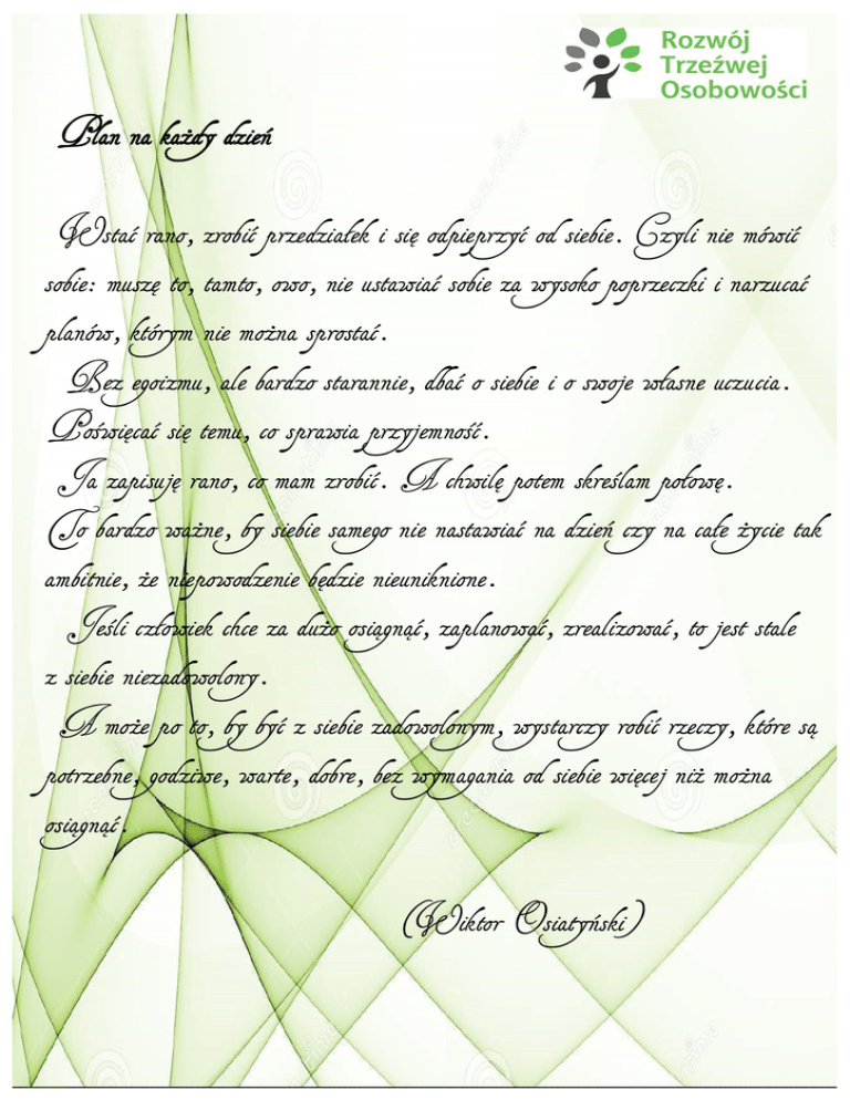 Plan na każdy dzień Wstać rano, zrobić przedziałek i się odpieprzyć od siebie. Czyli nie mówić sobie: muszę to, tamto, owo, nie ustawiać sobie za wysoko poprzeczki i narzucać planów, którym nie można sprostać. Bez egoizmu, ale bardzo starannie, dbać o siebie i o swoje własne uczucia. Poświęcać się temu, co sprawia przyjemność. Ja zapisuję rano, co mam zrobić. A chwilę potem skreślam połowę. To bardzo ważne, by siebie samego nie nastawiać na dzień czy na całe życie tak ambitnie, że niepowodzenie będzie nieuniknione. Jeśli człowiek chce za dużo osiągnąć, zaplanować, zrealizować, to jest stale z siebie niezadowolony. A może po to, by być z siebie zadowolonym, wystarczy robić rzeczy, które są potrzebne, godziwe, warte, dobre, bez wymagania od siebie więcej niż można osiągnąć. (Wiktor Osiatyński)