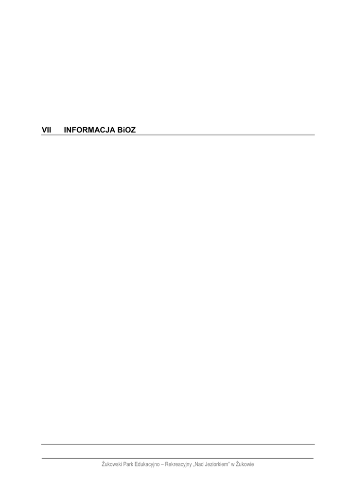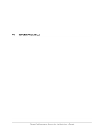 VII INFORMACJA BiOZ Żukowski Park Edukacyjno – Rekreacyjny „Nad Jeziorkiem” w Żukowie INFORMACJA BEZPIECZEŃSTWA I OCHRONY ZDROWIA TEMAT PROJEKT ŻUKOWSKIEGO PARKU EDUKACYJNO – REKREACYJNEGO „NAD JEZIORKIEM” W ŻUKOWIE ARDES INWESTYCJI ul. Książąt Pomorskich, 83-330 Żukowo, dz. nr 1006/4 INWESTOR Gmina Żukowo ul. Gdańska 52, 83-330 Żukowo FAZA Projekt Wykonawczy GŁÓWNY PROJEKTANT mgr inż. arch. Mirosław Macioszek nr upr. MPOIA/090/2010 Kraków, lipiec 2013 Żukowski Park Edukacyjno – Rekreacyjny „Nad Jeziorkiem” w Żukowie Podstawy opracowania Rozporządzenie Ministra infrastruktury z dn. 23.06.2003 w sprawie informacji dotyczącej bezpieczeństwa i ochrony zdrowia oraz planu bezpieczeństwa i ochrony zdrowia. Rozporządzenie Ministra infrastruktury z dn. 06.02.2003 w sprawie bezpieczeństwa i higieny pracy podczas wykonywania robót budowlanych 1. Zakres robót dla całego zamierzenia budowlanego z uwzględnieniem kolejności ich prowadzenia. Przedmiotowy budowlanych: zakres będzie realizowany wg następujących prac 1. Splantowanie i oczyszczenie istniejącego terenu, przygotowanie go pod wykonanie projektowanych nawierzchni i urządzeń 2. Wytyczenie projektowanego terenu skateparku, stref edukacyjnych, chodników z kostki betonowej oraz zjazdu 3. Wytyczenie elementów infrastruktury technicznej – trasa kablowe, latarnie 4. Roboty ziemne – ściągniecie warstwy humusu, częściowa wymiana gruntu wraz z jego nadsypaniem i zagęszczeniem mechaniczny warstwami do uzyskania wymaganej nośności podłoża 40 MPa – wg proj. drogowego 5. Wyprofilowanie podłoża wraz ze skarpowaniem, wykonanie warstw podbudowy pod projektowane nawierzchnie wraz z ich zagęszczeniem do uzyskania wymagana nośność 60 MPa – wg proj. drogowego 6. Wykonanie projektowanego przyłącza kablowego wraz z instalacją oświetlenia i montażem słupów oświetleniowych 7. Osadzenie obrzeży betonowych na ławach betonowych dla proj. zjazdu i chodników 8. Wykonanie płyty żelbetowej skateparku 9. Ułożenie kostki betonowej na podsypce cementowo – piaskowej na projektowanych chodnikach oraz wykonanie nawierzchni żwirowej 10. Ułożenie kostki granitowej na ścieżkach w strefach edukacyjnych 11. Montaż projektowanego ogrodzenia panelowego wys. 2,0 m wraz z furtką i bramą dwuskrzydłową 12. Montaż tablic informacyjnych na ścieżce edukacyjnej „Oś czasu” 13. Montaż elementów małej architektury. 14. Humusowanie i obsianie trawą strefy bezpieczeństwa, proj. trawników oraz terenu przyległego w niezbędnym zakresie. 15. Uporządkowanie terenu. 2. Wykaz istniejących obiektów budowlanych. Na działce nr 1006/4 przeznaczonej pod planowaną inwestycję brak jakichkolwiek obiektów budowlanych. Wzdłuż granicy południowo – wschodniej przebiega napowietrzna linia energetyczna oraz podziemna sieć wodociągowa i gazowa. Żukowski Park Edukacyjno – Rekreacyjny „Nad Jeziorkiem” w Żukowie 3. Wskazanie elementów zagospodarowania działki lub terenu, które mogą stwarzać zagrożenie bezpieczeństwa i zdrowia ludzi. • • • • Roboty ziemne oraz wykonanie nawierzchni – potrącenie przez maszynę, przysypanie Montaż urządzeń edukacyjnych i skateparku – potrącenie przez maszynę, niewłaściwy sposób montażu mogący spowodować przygniecenie przez montowany element Założenie zieleni – niewłaściwe stosowanie nawozów oraz sprzętu przeznaczonego do pielęgnacji zieleni Niestosowanie się do przepisów BHP oraz planu BiOZ. 4. Wskazanie dotyczące przewidywanych zagrożeń występujących podczas realizacji robót budowlanych, określające skalę i rodzaje zagrożeń oraz miejsce i czas ich występowania. 4.1. Zagospodarowanie placu budowy • • • Zagospodarowanie placu budowy powinno być zgodne z przepisami BHP oraz p.poż. Teren należy ogrodzić, a w razie potrzeby wygrodzić dodatkowo strefy niebezpieczne (np. związane z montażem elementów – urządzeń skateparku) Pracownikom należy zapewnić niezbędne urządzenia higieniczno – sanitarne oraz zaplecze socjalne. 4.2. Roboty ziemne • • • • • • Roboty ziemne należy przeprowadzić zgodnie ze sztuką budowlaną przy użyciu odpowiednich maszyn oraz odpowiednio przeszkolonego i poinstruowanego personelu. Przed przystąpieniem do robót ziemnych należy zapoznać się z istniejącym uzbrojeniem terenu i dokumentacją projektową. W trakcie prac należy zabezpieczyć teren przed osobami postronnymi. Prace wykonywać sprzętem do tego przeznaczonym, sprawnym techniczne. Pracownicy powinni być przeszkoleni w zakresie prowadzenia tego typu prac oraz poinstruowani przez kierownika robót o zakresie prac. Pracownicy powinni być wyposażeni w środki ochrony osobistej 4.3. Prace montażowe • • • Prace montażowe należy wykonywać zgodnie ze sztuką budowlaną, instrukcją producenta, przepisami BHP oraz sprzętem do tego przeznaczonym posiadającym właściwe atesty i sprawnym technicznie. Pracownicy wykonujący prace montażowe powinni być przeszkoleni, poinstruowani i wyposażeni w środki ochrony osobistej. Należy sporządzić wykaz prac, które powinny być wykonywane przez co najmniej dwie osoby oraz wymagające ochrony przed upadkiem z wysokości. Żukowski Park Edukacyjno – Rekreacyjny „Nad Jeziorkiem” w Żukowie 4.4. Założenie i pielęgnacja zielni • • • • Prace dotyczące wykonania i pielęgnacji zielnie powinni wykonywać przeszkoleni pracownicy. Należy przestrzegać przepisów BHP oraz instrukcji producenta Sprzęt stosowany do zakładania i pielęgnacji zieleni musi być sprawny technicznie i stosowany zgodnie z instrukcją przez przeszkolonych pracowników wyposażonych w środki ochrony osobistej. Nawożenie należy prowadzić zgodnie z instrukcją producenta, stosując środki ochrony osobistej. Nawozić należy w dni bezwietrzne. 4.5. Pozostałe wymagania Na podstawie informacji BiOZ oraz odpowiednich przepisów i instrukcji należy 