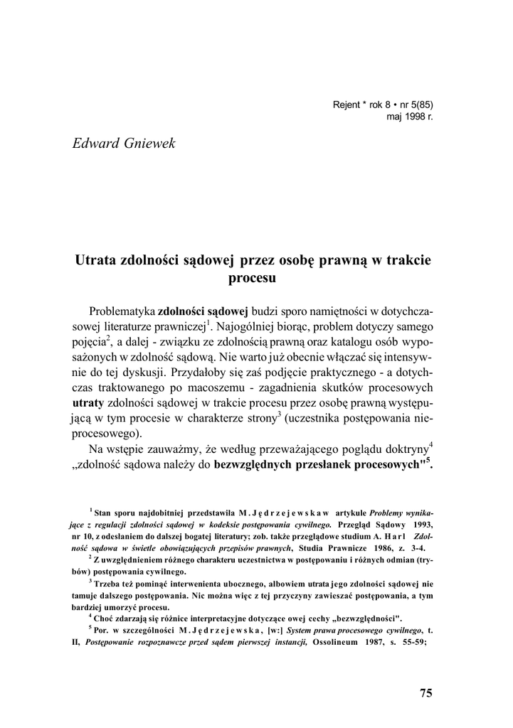 Rejent * rok 8 • nr 5(85) maj 1998 r. Edward Gniewek Utrata zdolności sądowej przez osobę prawną w trakcie procesu Problematyka zdolności sądowej budzi sporo namiętności w dotychczasowej literaturze prawniczej1. Najogólniej biorąc, problem dotyczy samego pojęcia2, a dalej - związku ze zdolnością prawną oraz katalogu osób wyposażonych w zdolność sądową. Nie warto już obecnie włączać się intensywnie do tej dyskusji. Przydałoby się zaś podjęcie praktycznego - a dotychczas traktowanego po macoszemu - zagadnienia skutków procesowych utraty zdolności sądowej w trakcie procesu przez osobę prawną występującą w tym procesie w charakterze strony3 (uczestnika postępowania nieprocesowego). Na wstępie zauważmy, że według przeważającego poglądu doktryny4 „zdolność sądowa należy do bezwzględnych przesłanek procesowych"5. 1 Stan sporu najdobitniej przedstawiła M . J ę d r z e j e w s k a w artykule Problemy wynikające z regulacji zdolności sądowej w kodeksie postępowania cywilnego. Przegląd Sądowy 1993, nr 10, z odesłaniem do dalszej bogatej literatury; zob. także przeglądowe studium A. H a r l Zdolność sądowa w świetle obowiązujących przepisów prawnych, Studia Prawnicze 1986, z. 3-4. 2 Z uwzględnieniem różnego charakteru uczestnictwa w postępowaniu i różnych odmian (trybów) postępowania cywilnego. 3 Trzeba też pominąć interwenienta ubocznego, albowiem utrata jego zdolności sądowej nie tamuje dalszego postępowania. Nic można więc z tej przyczyny zawieszać postępowania, a tym bardziej umorzyć procesu. 4 Choć zdarzają się różnice interpretacyjne dotyczące owej cechy „bezwzględności". 5 Por. w szczególności M . J ę d r z e j e w s k a , [w:] System prawa procesowego cywilnego, t. II, Postępowanie rozpoznawcze przed sądem pierwszej instancji, Ossolineum 1987, s. 55-59; 75 Edward Gniewek Sąd uwzględnia ją z urzędu (art. 202 zd. 2 k.p.c.) poprzez odrzucenie pozwu w razie pierwotnego braku zdolności sądowej oraz umorzenie postępowania w razie braku następczego6. W przeciwnym razie zachodzi nieważność postępowania (art. 379 pkt 2 k.p.c.)7. Generalnie zresztą „funkcja bezwzględnych przesłanek procesowych ma charakter konstruktywny. Przesłanki te umożliwiają prawidłowe przeprowadzenie procesu. Tam jednak, gdzie ich brak, tracą swój charakter konstruktywny i prowadzą do odrzucenia pozwu lub umorzenia postępowania, a więc zgaśnięcia procesu albo rozwiązania stosunku procesowego. W takich wypadkach przesłanka pozytywna zmienia się na przesłankę negatywną i odwrotnie (...). W tych sytuacjach przesłanki te uzyskują charakter przesłanek zgaśnięcia procesu albo rozwiązania stosunku procesowego"8. Można też przytoczyć pogląd, że „zdolność sądową należy traktować niejako przymiot, dzięki posiadaniu którego dana jednostka może być stroną w procesie, ale jako przymiot danej jednostki pozwalający na przeprowadzenie z jej udziałem jako strony procesowej ważnego postępowania"9. Jak już wspomniano, brak zdolności sądowej może mieć charakter pierwotny bądź następczy10. Pierwotny brak zdolności sądowej11 powoduje odrzucenie pozwu (art. 199 § 1 pkt 3 k.p.c.). Jeżeli jednak braki w zakresie zdolności sądowej dają się uzupełnić12, sąd wyznaczy w tym celu odpowiedni termin (art. 70 § 1 k.p.c.). Ponadto sąd może dopuścić tymczasowo do czynności stronę nie mającą zdolności sądowej, z zastrzeżeniem, że przed upływem wyznaczonego terminu brak ten będzie uzupełniony, a Z. Resich,[w:]J. J o d ł o w s k i , Z . R e s i c h , J . L a p i c r r c , T . M i s i u k - J o d ł o w s k a , P o stępowanie cywilne, Warszawa 1996, s. 53-57; W. S i e d I e c k i, Postępowanie cywilne, zarys wykładu, Warszawa 1977, s. 129. Odmiennie D. K r u p a, [w:] H. M ą d r z ą k,D. K r u p a , E . M a r s z a ł k o w s k a - K r z c ś , Postępowanie cywilne, Warszawa 1997. 6 O szczegółach niżej. 7 Pamiętamy oczywiście, że chodzi tu o nieważność względną, zależną od zaskarżenia wyroku. 8 Zob. Z. R e s i c h, op. cit., s. 58. Nowe Prawo 1966, nr 5, s. 575. 10 Zaakcentowano to w literaturze przedmiotu. Por. W. B r o n i c w i c z, op. cit., s. 579; także M. S y c h o w i c z , [w:] Kodeks postępowania cywilnego. Komentarz, t. 1, Warszawa 1966, s. 263. ną (art. 8 k.c.), a zatem również zdolność sądową (art. 64 § 1 k.p.c.) od chwili urodzenia; z dalszą korektą dotyczącą nasciturusa (zob. art. 927 § 2 i 972 k.c.). 12 Dla przykładu zarejestrowanie zawiązanej już spółki kapitałowej. 76 Utrata zdolności sądowej przez osobę prawną w trakcie procesu czynności zatwierdzone przez właściwą osobę (art. 70 § 2 k.p.c.). Jeżeli braku tego nie można uzupełnić albo nie został uzupełniony w wyznaczonym terminie, sąd zniesie postępowanie i wyda odpowiednie postanowienie13 (art. 71 k.p.c.). Generalnie zaś - jak również wspomniano - postępowanie przeprowadzone mimo braku zdolności sądowej którejkolwiek ze stron jest nieważne (art. 379 pkt 2 k.p.c.). W toku postępowania apelacyjnego zaskarżony wyrok podlega uchyleniu, a pozew odrzuca się (art. 386 § 2 k.p.c.). Również w postępowaniu kasacyjnym z urzędu uwzględnia się nieważność postępowania (art. 393" k.p.c.). Nieważność postępowania spowodowana brakiem zdolności sądowej strony stanowi również podstawę skargi o wznowienie postępowania (art. 401 pkt 2 k.p.c.). Szerszego rozważenia wymaga zaś problematyka następczej utraty zdolności sądowej w trakcie zawisłego sporu sądowego. Niewątpliwie podjęte zagadnienie ma spory walor praktyczny. Wiąże się zaś z nim szereg trudnych kwestii prawnych - z zakresu prawa procesowego i prawa materialnego - traktowanych marginalnie w dotychczasowej literaturze. Z perspektywy prawa materialnego należy oceniać przyczyny (źródła) utraty zdolności sądowej, wszak zdolność sądowa sprzęga się ze