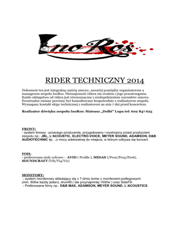 RIDER TECHNICZNY 2014 Dokument ten jest integralną częścią umowy, zawartej pomiędzy organizatorem a managerem zespołu InoRos. Nieznajomość ridera nie zwalnia z jego przestrzegania. Każde odstępstwo od ridera jest równoznaczne z niedopełnieniem warunków umowy. Ewentualne zmiany powinny być konsultowane bezpośrednio z realizatorem zespołu. Wymagany kontakt ekipy technicznej z realizatorem na min 7 dni przed koncertem. Realizator dźwięku zespołu InoRos: Mateusz „Dolbi” Lupa tel: 602 847 625 FRONT: - system liniowy uznanego producenta, przygotowany i wystrojony przed przybyciem zespołu np.: JBL, L’ACOUSTIC, ELECTRO-VOICE, MEYER SOUND, ADAMSON, D&B AUDIOTECHNIC itp…o mocy adekwatnej do miejsca, w którym odbywa się koncert. FOH: - preferowane stoły cyfrowe - AVID ( Profile ), MIDAS (/Pro2/Pro3/Pro6), SOUNDCRAFT (Vi6/Vi4/Vi1) MONITORY: - system monitorowy składający się z 7-dmiu torów z monitorami podłogowymi (min. 600w każdy jeden), drumfill ( tak przynajmniej 1500w ) oraz SideFill. - Preferowane firmy np.: D&B MAX, ADAMSON, MEYER SOUND, L’ACOUSTICS SCENA: - Organizator ZAPEWNIA do pomocy 2 osoby, które pomogą ekipie technicznej przy rozładunku i załadunku backline zespołu. - Scena o wymiarach 10x8m musi być konstrukcją posiadającą aktualne atesty dla konstrukcji tymczasowych oraz powinna być wypoziomowana i stabilna wykonana z obowiązującymi przepisami BHP, wyposażona w schody umożliwiające bezproblemowe wejście na scenę. - Powierzchnia sceny powinna być wykonana z antypoślizgowego materiału. W przypadku koncertów plenerowych wymagane jest osłonięcie (zabezpieczenie) sceny w tym jej boków i tyłu przed: wiatrem i deszczem. - Dojazd do sceny powinien umożliwiać bezpośredni podjazd samochodem w celu rozładunku instrumentów. - Podest pod perkusję – wymiary 3x2m, wys. 30-40cm. (zmiany TYLKO po uzgodnieniu z managementem ) - Zasilanie na scenie musi być prawidłowo uziemione i zabezpieczone. Firma zapewniająca zasilanie sceny i sprzętu zespołu bierze na siebie całkowitą odpowiedzialność za bezpieczeństwo wykonawców, realizatorów i techniki zespołu podczas prób technicznych. - Scena musi myć podłączona i uruchomiona (line chceck ) co najmniej 60 min przed przybyciem zespołu. - Cały system ( system frontowy, system monitorowy, mikser FOH, MON, backline zespołu musi być zasilany z tego samego źródła, umożliwiający odpowiedni pobór mocy – adekwatny do potrzeb zainstalowanej aparatury. Input List 1. 2. 3. 4. 5. 6. 7. 8. 9. 10. 11. 12. 13. 14. 15. 16. 17. 18. 19. 20. 21. 22. SOURCE BD SN 1 top SN 1 bottom HH Tom 1 Tom 2 Floor Tom Octobans 1 Octobans 2 Octobans 3 Octobans 4 Ride Overhead ( L ) Overhead ( R ) Bass (Mateusz) Guit ( L ) (Obdul) Guit ( R ) (Obdul) Key ( L ) (Rafał) Key ( R ) (Rafał) Accordion (Rafał) Violin (Piotrek) Voc. (Piotrek) MIC / D.I Beta 52 / D6 SM 57 ATM 350 / SM 57 SM 81 ATM 350 / D2 / E 604 ATM 350 / D2 / E 604 ATM 350 / D2 / E 604 E 604/D2/Sm 57 E 604/D2/ Sm 57 E 602/D2/Sm 57 E 604/D2/Sm 57 AT 4033a / AE 5100 / SM 81 AT 4033a / AE 5100 / SM 81 AT 4033a / AE 5100 / SM 81 XLR SM 57 SM 57 D.I D.I D.I D.I SM 58 23. Voc. Kamil SM 58 24. Voc. (Mateusz) 25. 26. 27. Ipod ( L ) Ipod ( R ) TALKBACK SM 58 XLR ( Przy stole frontowym) XLR ( Przy stole frontowym ) SM 58 (z wyłącznikiem ) Insert Comp/gate Comp/gate Comp/gate Gate Gate Gate Comp Comp/Deesser Comp/Deesser Comp/Deesse UKŁAD SCENY