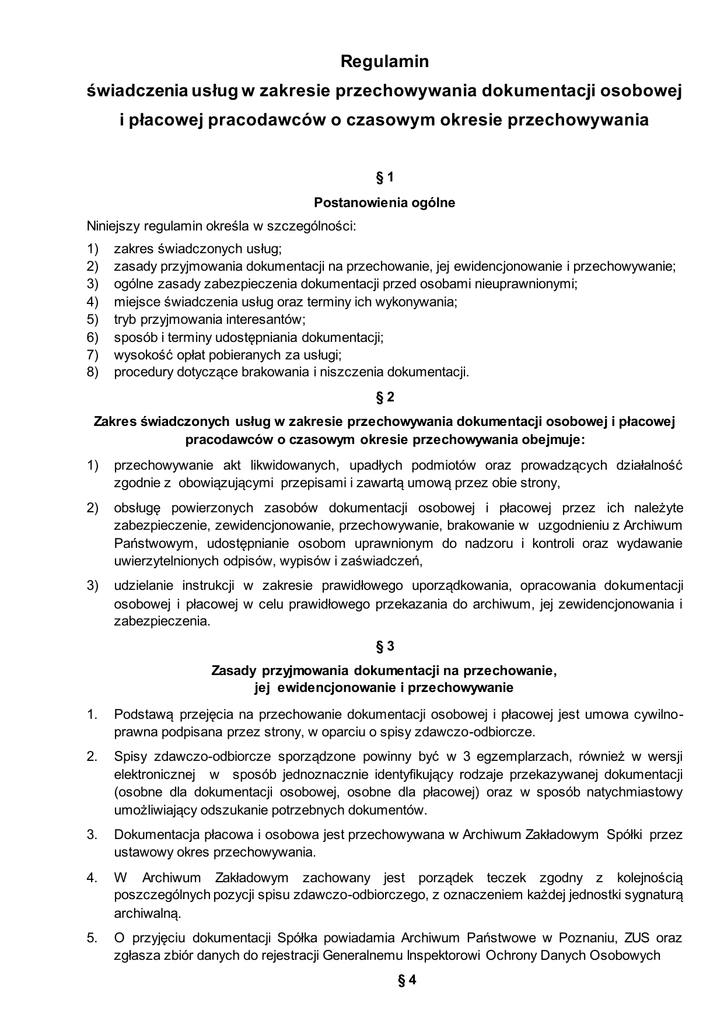 Regulamin świadczenia usług w zakresie przechowywania dokumentacji osobowej i płacowej pracodawców o czasowym okresie przechowywania §1 Postanowienia ogólne Niniejszy regulamin określa w szczególności: 1) 2) 3) 4) 5) 6) 7) 8) zakres świadczonych usług; zasady przyjmowania dokumentacji na przechowanie, jej ewidencjonowanie i przechowywanie; ogólne zasady zabezpieczenia dokumentacji przed osobami nieuprawnionymi; miejsce świadczenia usług oraz terminy ich wykonywania; tryb przyjmowania interesantów; sposób i terminy udostępniania dokumentacji; wysokość opłat pobieranych za usługi; procedury dotyczące brakowania i niszczenia dokumentacji. §2 Zakres świadczonych usług w zakresie przechowywania dokumentacji osobowej i płacowej pracodawców o czasowym okresie przechowywania obejmuje: 1) przechowywanie akt likwidowanych, upadłych podmiotów oraz prowadzących działalność zgodnie z obowiązującymi przepisami i zawartą umową przez obie strony, 2) obsługę powierzonych zasobów dokumentacji osobowej i płacowej przez ich należyte zabezpieczenie, zewidencjonowanie, przechowywanie, brakowanie w uzgodnieniu z Archiwum Państwowym, udostępnianie osobom uprawnionym do nadzoru i kontroli oraz wydawanie uwierzytelnionych odpisów, wypisów i zaświadczeń, 3) udzielanie instrukcji w zakresie prawidłowego uporządkowania, opracowania dokumentacji osobowej i płacowej w celu prawidłowego przekazania do archiwum, jej zewidencjonowania i zabezpieczenia. §3 Zasady przyjmowania dokumentacji na przechowanie, jej ewidencjonowanie i przechowywanie 1. Podstawą przejęcia na przechowanie dokumentacji osobowej i płacowej jest umowa cywilnoprawna podpisana przez strony, w oparciu o spisy zdawczo-odbiorcze. 2. Spisy zdawczo-odbiorcze sporządzone powinny być w 3 egzemplarzach, również w wersji elektronicznej w sposób jednoznacznie identyfikujący rodzaje przekazywanej dokumentacji (osobne dla dokumentacji osobowej, osobne dla płacowej) oraz w sposób natychmiastowy umożliwiający odszukanie potrzebnych dokumentów. 3. Dokumentacja płacowa i osobowa jest przechowywana w Archiwum Zakładowym Spółki przez ustawowy okres przechowywania. 4. W Archiwum Zakładowym zachowany jest porządek teczek zgodny z kolejnością poszczególnych pozycji spisu zdawczo-odbiorczego, z oznaczeniem każdej jednostki sygnaturą archiwalną. 5. O przyjęciu dokumentacji Spółka powiadamia Archiwum Państwowe w Poznaniu, ZUS oraz zgłasza zbiór danych do rejestracji Generalnemu Inspektorowi Ochrony Danych Osobowych §4 2 Ogólne zasady bezpieczeństwa dokumentacji przed osobami nieuprawnionymi 1. Archiwum posiada odpowiedniej jakości zabezpieczenia techniczne, gwarantujące pełne bezpieczeństwo przechowywania dokumentów. 2. Przy czynnościach polegających na gromadzeniu, ewidencjonowaniu, opracowaniu i zabezpieczeniu dokumentacji osobowej i płacowej zatrudnione są wyłącznie osoby posiadające odpowiednie specjalistyczne wykształcenie oraz doświadczenie zawodowe (zgodnie z rozporządzeniem Ministra Kultury z dnia 1 kwietnia 2005 r. w sprawie określenia rodzaju wykształcenia uznanego za specjalistyczne oraz dokumentów potwierdzających posiadanie praktyki zawodowej, wymaganych od osób wykonujących niektóre czynności związane z dokumentacją osobową i płacową pracodawców: Dz.U. Nr 68, poz. 596). 3. Dokumentacja jest zabezpieczona przed dostępem osób nieuprawnionych zgodnie z ustawą z dnia 29 sierpnia 1997 r. o ochronie danych osobowych (tekst jedn.: Dz.U. z 2014, poz. 1182 z póżn.zm.). 4. Budynki będące siedzibą Archiwum Zakładowego są własnością Spółki, zostały przystosowane do działalności archiwalnej, spełniają wszelkie wymagania w zakresie bezpiecznego przechowywania dokumentów i są wyposażone m.in. w: a) gaśnice, b) instalację ogrzewania, c) monitoring zakładu, d) sieć komputerową. 5. Budynki i pomieszczenia spełniają wszelkie wymogi nałożone rozporządzeniem Ministra Kultury z dnia 15 lutego 2005 r. w sprawie warunków przechowywania dokumentacji osobowej i płacowej pracodawców (Dz. U. Nr 32, poz. 284). §5 Miejsce świadczenia usług oraz terminy ich wykonywania 1. Miejscem świadczenia usług w zakresie przyjmowania interesantów, przechowalnictwa dokumentacji jest siedziba Spółki w Kleczewie ul. 600-lecia 9. 2. Przyjmowanie interesantów odbywa się codziennie w dni robocze. 3. Udzielenie informacji ,udostępnianie przechowywanej dokumentacji oraz wydawanie z niej odpisów, kopii odbywa się w pomieszczeniu biurowym Archiwum Zakładowego Spółki. 4. Dokumenty są udostępniane zarówno osobom fizycznym działającym we własnym imieniu jak i będącym upoważnionymi przedstawicielami podmiotów zainteresowanych. 5. Przechowywana dokumentacja może być również wypożyczona na zewnątrz podmiotom uprawnionym np. dla potrzeb sądu. §6 Tryb przyjmowania interesantów i terminy udostępniania dokumentacji 1. Dokumentację przechowywaną udostępnia się w pomieszczeniu biurowym Archiwum Zakładowego Spółki w godz. 8:00 do 14:00. 3 2. Korzystanie z dokumentacji następuje na wniosek (formularz wniosku stanowi załącznik nr 1 do regulaminu) osoby której dokumentacja dotyczy oraz innych uprawnionych podmiotów, a w szczególności Sądu i ZUS. 3. Osoba pragnąca uzyskać zezwolenie składa wniosek, w którym zobowiązana jest wykazać: a) interes prawny do korzystania z dokumentacji; b) cel wykorzystania dokumentacji; c) zakres potrzebnych materiałów. 4. W przypadku odmowy udostępnienia dokumentów zainteresowana osoba lub urząd otrzymuje powiadomienie z uzasadnieniem odmowy. 5. Celem uzyskania dokumentów z Archiwum Spółki drogą korespondencyjną należy skontaktować się z biurem Archiwum telefonicznie i podać adres pocztowy do korespondencji. Pracownik Archiwum prześle wnioskodawcy formularz wniosku niezwłocznie po zgłoszeniu zapotrzebowania. 6. Odpisy lub kopie z dokumentacji osobowej i płacowe należy odbiera