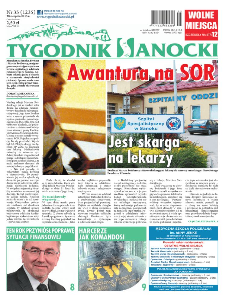 Nr 35 (1235) 28 sierpnia 2015 r. Cena detaliczna Dołącz do nas na facebook.com/tygodnik.sanocki www.tygodniksanocki.pl 2,50 zł w tym VAT 5% nr indeksu 338907 ISSN 1232-6534 PKWiU 58.14.11.0 Nakład 3500 egz. 12 Awantura na SOR Mieszkańcy Sanoka, Ewelina i Marcin Świdurscy, mają nagrania rejestrujące zajście na terenie szpitalnego oddziału ratunkowego w Sanoku. Kobieta oskarża jedną z lekarek o naruszenie nietykalności cielesnej. Sprawa może znaleźć swój epilog przed Temidą, gdyż została skierowana do sądu. DOROTA MĘ�RS� [email protected] Jest skarga na lekarzy ARCHIWUM PRYWATNE / ARCHIWUM TS Według relacji Marcina Świdurskiego już w zeszłym roku doszło na oddziale ratunkowym w Sanoku do bulwersującej sytuacji. Jego żona Ewelina wraz z ojcem przywiozła do szpitala pacjentkę potrzebującą pomocy. Pacjentka była pod wpływem alkoholu, ale podejrzeniem o nietrzeźwość obciążono również panią Ewelinę. Jak twierdzą Świdurscy, kobieta wraz z ojcem została wyrzucona z SOR. Pojechała na policję, by się przebadać. Wynik był 0,0. Złożyła skargę do dyrekcji SP ZOZ na pracującą tam lekarkę. Małżonkowie twierdzą, że wówczas dyr. Adam Siembab zbagatelizował skargę i udostępnił numer telefonu pani Eweliny lekarce, a ta miała rzekomo dzwonić do młodej kobiety z pogróżkami. – Nie jest prawdą, że oskarżyłam panią Ewelinę o nietrzeźwość. To pomówienie. Jej matka zgłosiła się do mnie po pomoc, nie zgadzając się na udzielenie informacji najbliższej rodzinie. W związku z tajemnicą lekarską musiałam uszanować jej decyzję. To był punkt zapalny całego zajścia. Rodzina miała do mnie o to żal i pretensje. Otrzymałam polecenie służbowe od dyrektora szpitala, by załatwić sprawę polubownie. W obecności ordynatora oddziału kardiologicznego wykonałam więc jeden telefon do tej kobiety – mówi pani doktor. Ewelina i Marcin Świdurscy skierowali skargę na lekarzy do starosty sanockiego i Narodowego Funduszu Zdrowia. Pech chciał, że chodzi o tę samą lekarkę, która według relacji Marcina Świdurskiego w dniu 21 lipca br. miała zaatakować jego żonę. By mieć dowody w sprawie… W tym dniu matka pana Marcina źle się poczuła i zemdlała. Jeszcze wtedy nikt nie wiedział, że ma w głowie tętniaka. Z domu zabrała ją karetka pogotowia. Syn wraz z żoną Eweliną pojechał do szpitala samochodem. – Jako osoby najbliższe poprosiliśmy lekarza o udzielenie nam informacji o stanie zdrowia mamy – relacjonuje mężczyzna. W tym czasie na oddział ratunkowy tra�ła też kobieta z problemami sercowymi. Stan pacjentki był poważny. Zajście na oddziale zbiegło się więc z akcją ratowania życia. Dyżur pełnił tam wówczas rezydent oddziału chirurgii. Konieczna była konsultacja z dyżurnym z oddziału kardiologii. – Badaliśmy pacjentkę na sali zabiegowej, na którą osoby postronne nie mają wstępu. Konsultant wykonywał echo serca, a ja poszedłem sprawdzić wyniki badań laboratoryjnych. Wychodząc, natknąłem się na młodego mężczyznę, który wskazując palcem na salę zabiegową, powiedział, że tam leży jego matka. Poprosił o udzielenie informacji o jej stanie zdrowia – do tego momentu relacja lekarza dyżurnego pokrywa TEN ROK PRZYNIÓSŁ POPRAWĘ HARCERZE SYTUACJI FINANSOWEJ JAK KOMANDOSI się z relacją Marcina Świdurskiego. Choć wydaje się to dziwne, Świdurski i jego żona Ewelina zaczęli wszystko nagrywać za pomocą telefonów komórkowych, zupełnie się z tym nie kryjąc. – Postanowiliśmy wszystko rejestrować, by w razie nieporozumień mieć dowody w sprawie. Konsultowaliśmy się ze znawcami prawa i w ich opinii rejestracja obrazu nie narusza niczyich praw, bo lekarz to osoba publiczna i rejestra- cja jego wizerunku jest dozwolona w miejscu pracy – Świdurski tłumaczy to bądź co bądź niecodzienne zachowanie. Okazało się jednak, że lekarz dyżurny, udzielając synowi informacji o stanie zdrowia matki, pomylił ją z chorą na serce kobietą i przekazał, że potrzebna jest konsultacja kardiologiczna oraz prawdopodobnie hospitalizacja wskazanej osoby. CIĄG DALSZY NA STR. 3 MEDYCZNA SZKOŁA POLICEALNA im. ANNY JENKE 38-500 Sanok ul. Konarskiego 3 Tel/Fax sekretariat: 13- 463-12-42 www.zsmsanok.pl Prowadzi nabór na kierunkach: OSTATNIE WOLNE MIEJSCA Technik Farmaceutyczny – (policealny – 2 lata) Technik Masażysta – (policealny – 2 lata) Technik Usług Kosmetycznych – (policealny – 2 lata) Technik Elektroniki i Informatyki Medycznej – (policealny – 2 lata) Opiekunka Dziecięca – (policealny – 2 lata) Asystent Osoby Niepełnosprawnej – (policealny – 1 rok) Terapeuta Zajęciowy – (policealny – 2 lata) POLICEALNA SZKOŁA MEDYCZNO-SPOŁECZNA DLA DOROSŁYCH 8 9 Opiekunka Środowiskowa – zaoczny (policealny – 1 rok) Opiekun w Domu Pomocy Społecznej – zaoczny (policealny – 2 lata) Opiekun Medyczny – zaoczny (policealny – 1 rok) Opiekun Osoby Starszej – zaoczny (policealny – 2 lata) Nauka co dwa tygodnie, praktyka bezpłatna, stypendia naukowe i socjalne dla ludzi w każdym wieku 2 Z TYGODNIA NA TYDZIEŃ Koalicja w komplecie, muzeum straciło 400 tys. zł Nie było niespodzianek. Na dzisiejszej sesji Rady Powiatu Sanockiego radni opowiedzieli się za ratowaniem �nansów powiatowych kosztem Muzeum Historycznego. Opozycja milczała, bo tak naprawdę ich głos byłby wołaniem na puszczy. Większość Polaków nie ma wyrobionego nawyku regularnego sprawdzania stanu swojego zdrowia. Dzieje się tak głównie z powodu konieczności długiego oczekiwania na wizytę u lekarza i ograniczonego dostępu do specjalistycznych badań. Aby każdy mógł sprawdzić, w jakiej jest kondycji, wydawca magazynu „Dbam o zdrowie” wraz z �rmą ALE postanowił zorganizować projekt „Mobilne Badania”. Dzięki niemu bezpłatnie i bez konieczności wcześniejszego rejestrowania się będzie można wykonać testy przesiewowe w r