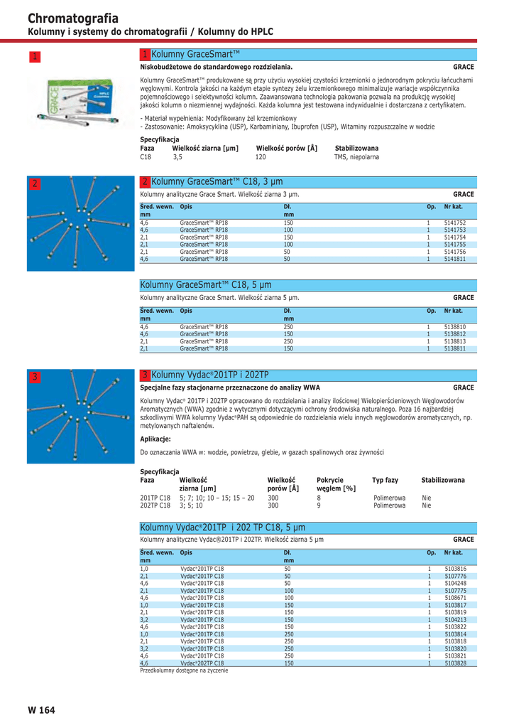 Chromatografia Kolumny i systemy do chromatografii / Kolumny do HPLC 1 1 Kolumny GraceSmart™ Niskobudżetowe do standardowego rozdzielania. GRACE Kolumny GraceSmart™ produkowane są przy użyciu wysokiej czystości krzemionki o jednorodnym pokryciu łańcuchami węglowymi. Kontrola jakości na każdym etapie syntezy żelu krzemionkowego minimalizuje wariacje współczynnika pojemnościowego i selektywności kolumn. Zaawansowana technologia pakowania pozwala na produkcję wysokiej jakości kolumn o niezmiennej wydajności. Każda kolumna jest testowana indywidualnie i dostarczana z certyfikatem. - Materiał wypełnienia: Modyfikowany żel krzemionkowy - Zastosowanie: Amoksycyklina (USP), Karbaminiany, Ibuprofen (USP), Witaminy rozpuszczalne w wodzie Specyfikacja Faza Wielkość ziarna [µm] C18 3,5 2 Wielkość porów [Å] 120 Stabilizowana TMS, niepolarna 2 Kolumny GraceSmart™ C18, 3 µm Kolumny analityczne Grace Smart. Wielkość ziarna 3 µm. Śred. wewn. mm 4,6 4,6 2,1 2,1 2,1 4,6 Opis GRACE Dł. mm 150 100 150 100 50 50 GraceSmart™ RP18 GraceSmart™ RP18 GraceSmart™ RP18 GraceSmart™ RP18 GraceSmart™ RP18 GraceSmart™ RP18 Op. Nr kat. 1 1 1 1 1 1 5141752 5141753 5141754 5141755 5141756 5141811 Kolumny GraceSmart™ C18, 5 µm Kolumny analityczne Grace Smart. Wielkość ziarna 5 µm. Śred. wewn. mm 4,6 4,6 2,1 2,1 3 Opis GRACE Dł. mm 250 150 250 150 GraceSmart™ RP18 GraceSmart™ RP18 GraceSmart™ RP18 GraceSmart™ RP18 Op. Nr kat. 1 1 1 1 5138810 5138812 5138813 5138811 3 Kolumny Vydac®201TP i 202TP Specjalne fazy stacjonarne przeznaczone do analizy WWA GRACE Kolumny Vydac® 201TP i 202TP opracowano do rozdzielania i analizy ilościowej Wielopierścieniowych Węglowodorów Aromatycznych (WWA) zgodnie z wytycznymi dotyczącymi ochrony środowiska naturalnego. Poza 16 najbardziej szkodliwymi WWA kolumny Vydac®PAH są odpowiednie do rozdzielania wielu innych węglowodorów aromatycznych, np. metylowanych naftalenów. Aplikacje: Do oznaczania WWA w: wodzie, powietrzu, glebie, w gazach spalinowych oraz żywności Specyfikacja Faza Wielkość ziarna [µm] 201TP C18 5; 7; 10; 10 – 15; 15 – 20 202TP C18 3; 5; 10 Wielkość porów [Å] 300 300 Pokrycie węglem [%] 8 9 Typ fazy Stabilizowana Polimerowa Polimerowa Nie Nie Kolumny Vydac®201TP i 202 TP C18, 5 µm GRACE Kolumny analityczne Vydac®201TP i 202TP. Wielkość ziarna 5 µm Śred. wewn. Opis mm 1,0 Vydac®201TP C18 2,1 Vydac®201TP C18 4,6 Vydac®201TP C18 2,1 Vydac®201TP C18 4,6 Vydac®201TP C18 1,0 Vydac®201TP C18 2,1 Vydac®201TP C18 3,2 Vydac®201TP C18 4,6 Vydac®201TP C18 1,0 Vydac®201TP C18 2,1 Vydac®201TP C18 3,2 Vydac®201TP C18 4,6 Vydac®201TP C18 4,6 Vydac®202TP C18 Przedkolumny dostępne na życzenie W 164 Dł. mm 50 50 50 100 100 150 150 150 150 250 250 250 250 150 Op. Nr kat. 1 1 1 1 1 1 1 1 1 1 1 1 1 1 5103816 5107776 5104248 5107775 5108671 5103817 5103819 5104213 5103822 5103814 5103818 5103820 5103821 5103828 Chromatografia Kolumny i systemy do chromatografii / Kolumny do HPLC 1 Kolumny Alltech® Alltima™ 1 Wysokiej jakości kolumny o uniwersalnym zastosowaniu. GRACE - Materiał wypełnienia: sferyczny żel krzemionkowy powierzchniowo modyfikowany - Odpowiednie w aplikacjach z użyciem kolumn mikroborowanych - Polimeryczne wiązania i podwójna dezaktywacja powierzchni wydłuża czas życia kolumny - Pozwala na analizę związków kwasowych, zasadowych i neutralnych podczas jednej analizy - Duża rozpiętość wymiarów kolumn od mikroborowanych po preparatywne - Zastosowanie: analiza farmaceutyków, nutraceutyków, witamin, analizy żywności, nukleozydów, fosfolipidów, węglowodorów aromatycznych, pestycydów, wielopierścieniowych węglowodorów aromatycznych, środków powierzchniowo czynnych, polimerów, biopaliwa, parafiny i innych - Wielkość porów 100 Å; typ fazy: polimerowa Specyfikacja Faza Wielkość ziarna [µm] C18 3; 5; 10 C18LL 5 C8 3; 5; 10 Phenyl 3; 5 Cyano 3; 5 Amino 3; 5 Silica 3; 5; 10 Pokrycie węglem [%] 16 9 9 7,5 - Stabilizowana Tak Tak Tak Tak Tak Nie - Kolumny Alltech® Alltima™, 3 µm Kolumny Alltech® Alltima™. Wielkość ziarna 3 µm. Śred. wewn. mm 4,6 4,6 4,6 4,6 4,6 4,6 4,6 4,6 4,6 4,6 4,6 4,6 Opis Alltima™ C18 Alltima™ C18 Alltima™ C8 Alltima™ C8 Alltima™ Phenyl Alltima™ Phenyl Alltima™ Cyano Alltima™ Cyano Alltima™ Amino Alltima™ Amino Alltima™ Silica Alltima™ Silica Dł. mm 100 150 100 150 100 150 100 150 100 150 100 150 GRACE Op. Nr kat. 1 1 1 1 1 1 1 1 1 1 1 1 5129306 5129308 5129310 5129312 5129256 5129262 5129257 5129263 5129258 5129265 5129314 5129316 Inne formaty kolumn dostępne na życzenie 2 Kolumny Alltech® Alltima™, 5 µm 2 Kolumny Alltech® Alltima™. Wielkość ziarna 5 µm. Śred. wewn. mm 4,6 4,6 4,6 4,6 4,6 4,6 4,6 4,6 4,6 4,6 4,6 4,6 4,6 4,6 Opis Alltima™ C18 Alltima™ C18 Alltima™ C18-LL Alltima™ C18-LL Alltima™ C8 Alltima™ C8 Alltima™ Phenyl Alltima™ Phenyl Alltima™ Cyano Alltima™ Cyano Alltima™ Amino Alltima™ Amino Alltima™ Silica Alltima™ Silica Dł. mm 150 250 150 250 150 250 150 250 150 250 150 250 150 250 GRACE Op. Nr kat. 1 1 1 1 1 1 1 1 1 1 1 1 1 1 5129675 5129678 5129683 5129695 5129684 5129686 5129690 5129692 5129712 5129715 5129718 5129720 5129697 5129707 Inne formaty kolumn dostępne na życzenie 3 Kolumny Alltech® Alltima™, 10 µm 3 Kolumny Alltech® Alltima™. Wielkość ziarna 10 µm. Śred. wewn. mm 4,6 4,6 4,6 Opis Alltima™ C18 Alltima™ C8 Alltima™ Silica Dł. mm 250 250 250 GRACE Op. Nr kat. 1 1 1 5129726 5129730 5129732 Inne formaty kolumn dostępne na życzenie W 165 Chromatografia Kolumny i systemy do chromatografii / Kolumny do HPLC 1 1 Kolumny Alltech® Alltima™ HP Stabilne, doskonale rozdzielające, o niskiej linii podstawowej. GRACE Wysoka stabilność, czystość, jakość oraz niemierzalny wypływ złoża dla wymagających aplikacji - Materiał wypełnienia: sferyczny żel krzemionkowy powierzchniowo modyfikowany - Wysoka symetr