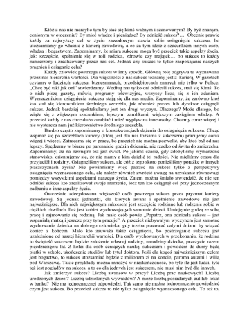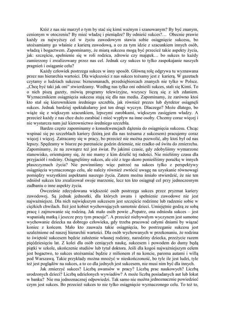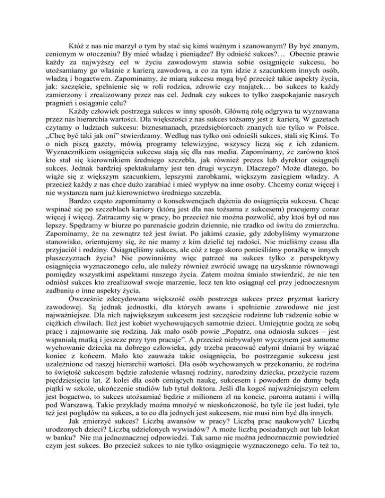 KtóŜ z nas nie marzył o tym by stać się kimś waŜnym i szanowanym? By być znanym, cenionym w otoczeniu? By mieć władzę i pieniądze? By odnieść sukces?… Obecnie prawie kaŜdy za najwyŜszy cel w Ŝyciu zawodowym stawia sobie osiągnięcie sukcesu, bo utoŜsamiamy go właśnie z karierą zawodową, a co za tym idzie z szacunkiem innych osób, władzą i bogactwem. Zapominamy, Ŝe miarą sukcesu mogą być przecieŜ takie aspekty Ŝycia, jak: szczęście, spełnienie się w roli rodzica, zdrowie czy majątek… bo sukces to kaŜdy zamierzony i zrealizowany przez nas cel. Jednak czy sukces to tylko zaspokajanie naszych pragnień i osiąganie celu? KaŜdy człowiek postrzega sukces w inny sposób. Główną rolę odgrywa tu wyznawana przez nas hierarchia wartości. Dla większości z nas sukces toŜsamy jest z karierą. W gazetach czytamy o ludziach sukcesu: biznesmanach, przedsiębiorcach znanych nie tylko w Polsce. „Chcę być taki jak oni” stwierdzamy. Według nas tylko oni odnieśli sukces, stali się Kimś. To o nich piszą gazety, mówią programy telewizyjne, wszyscy liczą się z ich zdaniem. Wyznacznikiem osiągnięcia sukcesu stają się dla nas media. Zapominamy, Ŝe zarówno ktoś kto stał się kierownikiem średniego szczebla, jak równieŜ prezes lub dyrektor osiągnęli sukces. Jednak bardziej spektakularny jest ten drugi wyczyn. Dlaczego? MoŜe dlatego, bo wiąŜe się z większym szacunkiem, lepszymi zarobkami, większym zasięgiem władzy. A przecieŜ kaŜdy z nas chce duŜo zarabiać i mieć wypływ na inne osoby. Chcemy coraz więcej i nie wystarcza nam juŜ kierownictwo średniego szczebla. Bardzo często zapominamy o konsekwencjach dąŜenia do osiągnięcia sukcesu. Chcąc wspinać się po szczeblach kariery (którą jest dla nas toŜsama z sukcesem) pracujemy coraz więcej i więcej. Zatracamy się w pracy, bo przecieŜ nie moŜna pozwolić, aby ktoś był od nas lepszy. Spędzamy w biurze po parenaście godzin dziennie, nie rzadko od świtu do zmierzchu. Zapominamy, Ŝe na zewnątrz teŜ jest świat. Po jakimś czasie, gdy zdobyliśmy wymarzone stanowisko, orientujemy się, Ŝe nie mamy z kim dzielić tej radości. Nie mieliśmy czasu dla przyjaciół i rodziny. Osiągnęliśmy sukces, ale cóŜ z tego skoro ponieśliśmy poraŜkę w innych płaszczyznach Ŝycia? Nie powinniśmy więc patrzeć na sukces tylko z perspektywy osiągnięcia wyznaczonego celu, ale naleŜy równieŜ zwrócić uwagę na uzyskanie równowagi pomiędzy wszystkimi aspektami naszego Ŝycia. Zatem moŜna śmiało stwierdzić, Ŝe nie ten odniósł sukces kto zrealizował swoje marzenie, lecz ten kto osiągnął cel przy jednoczesnym zadbaniu o inne aspekty Ŝycia. Ówcześnie zdecydowana większość osób postrzega sukces przez pryzmat kariery zawodowej. Są jednak jednostki, dla których awans i spełnienie zawodowe nie jest najwaŜniejsze. Dla nich największym sukcesem jest szczęście rodzinne lub radzenie sobie w cięŜkich chwilach. IleŜ jest kobiet wychowujących samotnie dzieci. Umiejętnie godzą ze sobą pracę i zajmowanie się rodziną. Jak mało osób powie „Popatrz, ona odniosła sukces – jest wspaniałą matką i jeszcze przy tym pracuje”. A przecieŜ niebywałym wyczynem jest samotne wychowanie dziecka na dobrego człowieka, gdy trzeba pracować całymi dniami by wiązać koniec z końcem. Mało kto zauwaŜa takie osiągnięcia, bo postrzeganie sukcesu jest uzaleŜnione od naszej hierarchii wartości. Dla osób wychowanych w przekonaniu, Ŝe rodzina to świętość sukcesem będzie załoŜenie własnej rodziny, narodziny dziecka, przeŜycie razem pięćdziesięciu lat. Z kolei dla osób ceniących naukę, sukcesem i powodem do dumy będą piątki w szkole, ukończenie studiów lub tytuł doktora. Jeśli dla kogoś najwaŜniejszym celem jest bogactwo, to sukces utoŜsamiać będzie z milionem zł na koncie, paroma autami i willą pod Warszawą. Takie przykłady moŜna mnoŜyć w nieskończoność, bo tyle ile jest ludzi, tyle teŜ jest poglądów na sukces, a to co dla jednych jest sukcesem, nie musi nim być dla innych. Jak zmierzyć sukces? Liczbą awansów w pracy? Liczbą prac naukowych? Liczbą urodzonych dzieci? Liczbą udzielonych wywiadów? A moŜe liczbą posiadanych aut lub lokat w banku? Nie ma jednoznacznej odpowiedzi. Tak samo nie moŜna jednoznacznie powiedzieć czym jest sukces. Bo przecieŜ sukces to nie tylko osiągnięcie wyznaczonego celu. To teŜ to, co niesie ze sobą zaspokojenie naszych pragnień. Osoba kierująca firmą, której Ŝycie rodzinne sprowadza się do corocznych odwiedzin u mamy, to z pewnością nie osoba odnosząca sukces, choć dla niektórych moŜe być postrzegana inaczej. Nie moŜna wiec jasno stwierdzić kto odniósł sukces, a kto nie. Wszystko zaleŜy od nas, czy sami czujemy, Ŝe jesteśmy ludźmi sukcesu. Jeśli jesteśmy dumni z tego, co osiągnęliśmy, jeśli nie musieliśmy zrezygnować z rzeczy, które są dla nas waŜne, jeśli śmiało mówimy, Ŝe nic w swym Ŝyciu byśmy nie zmienili – to śmiało moŜna powiedzieć, Ŝe osiągnęliśmy sukces.