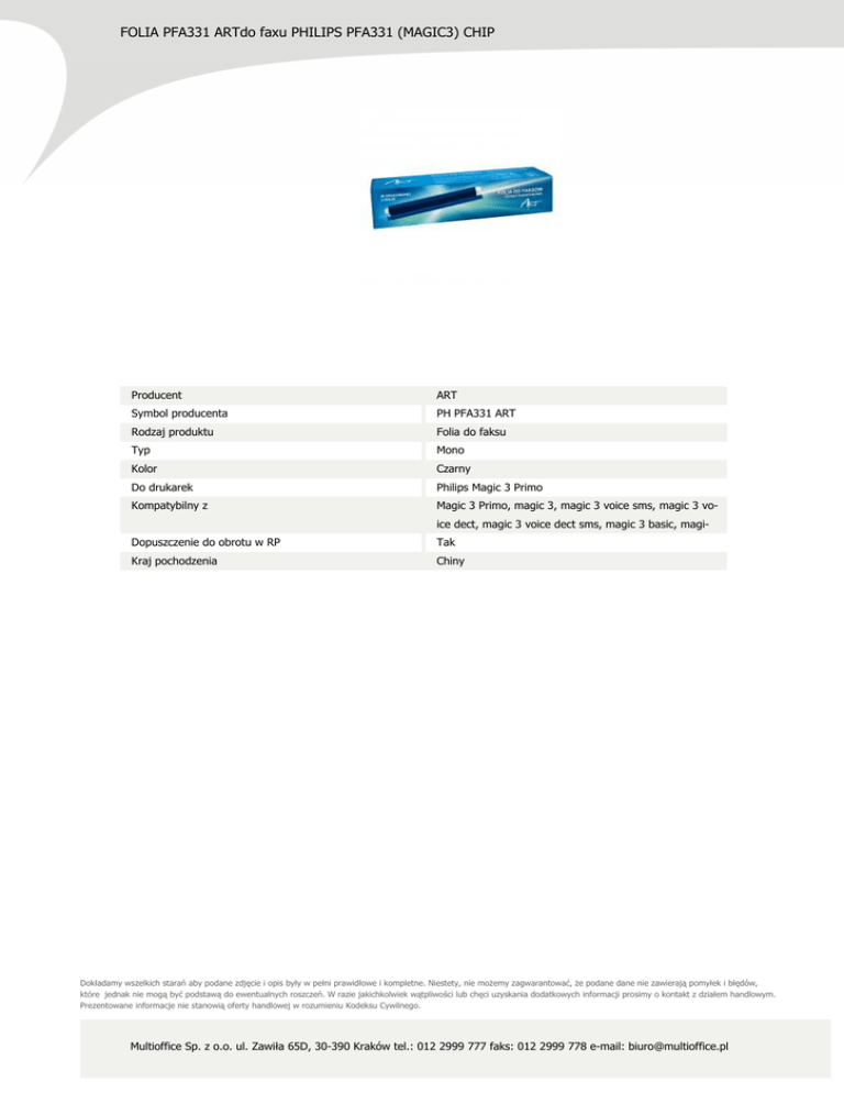 FOLIA PFA331 ARTdo faxu PHILIPS PFA331 (MAGIC3) CHIP Producent ART Symbol producenta PH PFA331 ART Rodzaj produktu Folia do faksu Typ Mono Kolor Czarny Do drukarek Philips Magic 3 Primo Kompatybilny z Magic 3 Primo, magic 3, magic 3 voice sms, magic 3 voice dect, magic 3 voice dect sms, magic 3 basic, magi- Dopuszczenie do obrotu w RP Tak Kraj pochodzenia Chiny Dokładamy wszelkich starań aby podane zdjęcie i opis były w pełni prawidłowe i kompletne. Niestety, nie możemy zagwarantować, że podane dane nie zawierają pomyłek i błędów, które jednak nie mogą być podstawą do ewentualnych roszczeń. W razie jakichkolwiek wątpliwości lub chęci uzyskania dodatkowych informacji prosimy o kontakt z działem handlowym. Prezentowane informacje nie stanowią oferty handlowej w rozumieniu Kodeksu Cywilnego. Multioffice Sp. z o.o. ul. Zawiła 65D, 30-390 Kraków tel.: 012 2999 777 faks: 012 2999 778 e-mail: [email protected]