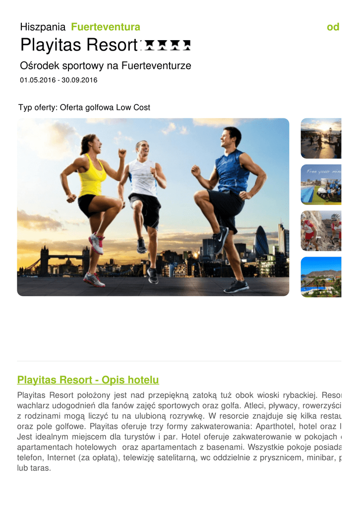 Hiszpania Fuerteventura od 335 Playitas Resort Ośrodek sportowy na Fuerteventurze 01.05.2016 - 30.09.2016 Typ oferty: Oferta golfowa Low Cost Playitas Resort - Opis hotelu Playitas Resort położony jest nad przepiękną zatoką tuż obok wioski rybackiej. Resort ofe wachlarz udogodnień dla fanów zajęć sportowych oraz golfa. Atleci, pływacy, rowerzyści, bieg z rodzinami mogą liczyć tu na ulubioną rozrywkę. W resorcie znajduje się kilka restauracji, oraz pole golfowe. Playitas oferuje trzy formy zakwaterowania: Aparthotel, hotel oraz luksus Jest idealnym miejscem dla turystów i par. Hotel oferuje zakwaterowanie w pokojach dwuo apartamentach hotelowych oraz apartamentach z basenami. Wszystkie pokoje posiadają kli telefon, Internet (za opłatą), telewizję satelitarną, wc oddzielnie z prysznicem, minibar, prywa lub taras. Aparthotel - dzięki ofercie studia i apartamentów polecany jest w szczególności dla rodzin oraz STRONA HOTELU Playitas Resort Playitas Resort położony jest nad przepiękną zatoką tuż obok wioski rybackiej. Resort oferuje wachlarz udogodnień dla fanów zajęć sportowych oraz golfa. Atleci, pływacy, rowerzyści, biega z rodzinami mogą liczyć tu na ulubioną rozrywkę. W resorcie znajduje się kilka restauracji, kids oraz pole golfowe. Playias oferuje trzy formy zakwaterowania: Aparthotel, hotel oraz luksusow Playitas Hotel - jest idealnym miejscem dla turystów i par. Hotel oferuje zakwaterowanie w po dwuosobowych, apartamentach hotelowych oraz apartamentach z basenami. Wszystkie poko posiadają klimatyzację, telefon, Internet (za opłatą), telewizję satelitarną, wc oddzielnie z prysz minibar, prywatny balkon lub taras. BOGATE ZAPLECZE SPORTOWE Resort proponuje całodzienne programy zajęć sportowo - rekreacyjnych: od biegania, po zaję power bike, koszykówkę, siatkówkę, sztuki walki, zumbę, taniec czy cross fit. Każdy bez wyjątk coś dla siebie. Pola w pakiecie PLAYITAS GOLF Mistrzowskie 18-dołkowe pole, par 67 ukształtowane przez naturalne wzniesienia i doliny kont otaczającymi pole wulkanicznymi wyspami. Pole posiada wiele zaskakujących gracza urozmai Najbardziej popisowym dołkiem jest piętnasty par 3. Fuerteventura To jedna z Wysp Hiszpańskich słynąca z rozległych, piaszczystych plaż i dziewiczej przyrody. wyspy to rozległe równiny kontrastujące z wulkanicznymi górami i ciągnącymi się aż po horyzo wydm. Fuertaventura jest popularnym kierunkiem turystycznym ale mimo wszystko udało jej s zachować klimat niezwykle spokojnego miejsca. Przy okazji pobytu na wyspie warto wybrać się na północ wyspy po jej malowniczych zakątkach, małych miasteczkach z zachowanymi z czas kolonialnych budynkami, portowych osad gdzie zjemy owoce morza wyłowione wprost z rybac Dla osób wierzących w magię polecamy odwiedzenie Montana Nagra (Świętej Góry), która dla jest miejscem o szczególnym znaczeniu. Oprócz aktywności sportowych jakie można tu upraw względu na wspaniałe plaże i piękne krajobrazy czyli sporty wodne, rowerowe, oraz wspinaczk Fuertaventura jest także doskonałym kierunkiem do urlopu z kijem golfowym w ręku! Na wysp się 5 pól golfowych: Costa Caleta, Salinas Golf Club, Jandia, Playitas Golf, La Oliva Golf. Udogodnienia hotelu Bar Centrum Fitness Internet Wi-Fi Klimatyzacja Mini Bar Restauracja Telewizja Playitas Resort 4* studio 4 os. DBL hotel 7 noclegów / BB / ceny w € od osoby 01.05 - 14.07.2016 / 24.08 - 30.09.2016 335.00 EUR 505.00 EUR 15.07 - 23.08.2016 399.00 EUR 650.00 EUR ceny dla non golfer: 335 € w pierwszym terminie oraz 480 € w drugim terminie, spore dla dzieci Oferta ważna przy 4 os. Oferta zawiera 7 noclegów w pokoju DBL lub SGL śniadania pakiet 5 GF na polu Playitas transfer lotniskowy ubezpieczenie KL NNW z OC golf podatek VAT Oferta nie zawiera przelotu na Fuerteventurę dopłaty do HB (105 €/tydzień w hotelu lub 185 €/tydzień w aparthotelu) dopłaty do junior suite i pokoi z widokiem na morze Katarzyna Bobińska tel: +48 600 88 55 44 e-mail: kbobinska@travel