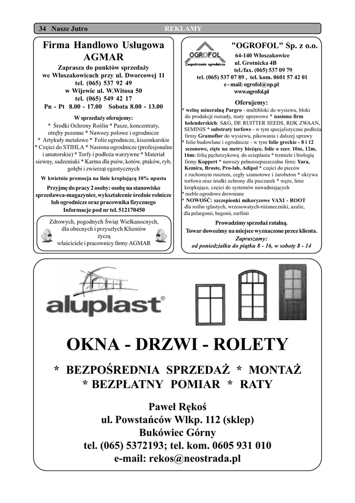 34 NaszeJutro Jutro 34 Nasze Z ¯YCIA SZKÓ£ REKLAMY Firma Handlowo Us³ugowa AGMAR Zaprasza do punktów sprzeda¿y we W³oszakowicach przy ul. Dworcowej 11 tel. (065) 537 92 49 w Wijewie ul. W.Witosa 50 tel. (065) 549 42 17 Pn - Pt 8.00 - 17.00 Sobota 8.00 - 13.00 W sprzeda¿y oferujemy: * rodki Ochrony Rolin * Pasze, koncentraty, otrêby pszenne * Nawozy polowe i ogrodnicze * Artyku³y metalowe * Folie ogrodnicze, kiszonkarskie * Czêci do STIHLA * Nasiona ogrodnicze (profesjonalne i amatorskie) * Torfy i pod³o¿a warzywne * Materia³ siewny, sadzeniaki * Karma dla psów, kotów, ptaków, ryb, go³êbi i zwierz¹t egzotycznych W kwietniu promocja na linie kropluj¹c¹ 10% upustu Przyjmê do pracy 2 osoby: osobê na stanowisko sprzedawca-magazynier, wykszta³cenie rednie rolnicze lub ogrodnicze oraz pracownika fizycznego Informacje pod nr tel. 512170450 Zdrowych, pogodnych wi¹t Wielkanocnych, dla obecnych i przysz³ych Klientów ¿ycz¹ w³aciciele i pracownicy firmy AGMAR "OGROFOL" Sp. z o.o. 64-140 W³oszakowice ul. Grotnicka 4B tel./fax. (065) 537 09 79 tel. (065) 537 07 89 , tel. kom. 0601 57 42 01 e - mail: [email protected] www.ogrofol.pl Oferujemy: * we³nê mineraln¹ Pargro - multibloki do wysiewu, bloki do produkcji rozsady, maty uprawowe * nasiona firm holenderskich: S&G, DE RUITTER SEEDS, RIJK ZWAAN, SEMINIS * substraty torfowe - w tym specjalistyczne pod³o¿a firmy Gramoflor do wysiewu, pikowania i dalszej uprawy * folie budowlane i ogrodnicze - w tym folie greckie - 8 i 12 sezonowe, ciête na metry bie¿¹ce, folie o szer. 10m, 12m, 16m: foliê pêcherzykow¹ do ocieplania * trzmiele i biologiê firmy Koppert * nawozy pe³norozpuszczalne firm: Yara, Kemira, Broste, Pro-lab, Adipol * czêci do pieców z ruchomym rusztem, ceg³y szamotowe i ¿arobeton * okrywa torfowa oraz rodki ochrony dla pieczarek * wê¿e, linie kropkuj¹ce, czêci do systemów nawadniaj¹cych * meble ogrodowe drewniane * NOWOÆ: szczepionki mikoryzowe VAXI - ROOT dla rolin iglastych, wrzosowatych-ró¿aneczniki, azalie, dla pelargonii, begonii, surfinii Prowadzimy sprzeda¿ rataln¹. Towar dowozimy na miejsce wyznaczone przez klienta. Zapraszamy: od poniedzia³ku do pi¹tku 8 - 16, w soboty 8 - 14 OKNA - DRZWI - ROLETY * BEZPOREDNIA SPRZEDA¯ * MONTA¯ * BEZP£ATNY POMIAR * RATY Pawe³ Rêko ul. Powstañców Wlkp. 112 (sklep) Bukówiec Górny tel. (065) 5372193; tel. kom. 0605 931 010 e-mail: [email protected]