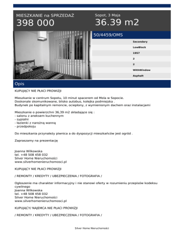 Sopot, 3 Maja MIESZKANIE na SPRZEDAŻ 36.39 m2 398 000 50/4459/OMS Secondary LowBlock 1957 2 2 WithWindow Asphalt Opis KUPUJĄCY NIE PŁACI PROWIZJI Mieszkanie w centrum Sopotu, 10 minut spacerem od Mola w Sopocie. Doskonale skomunikowane, blisko autobus, kolejka podmiejska . Budynek po kapitalnym remoncie, ocieplony, z wymienionym dachem oraz instalacjami Mieszkanie o powierzchni 36,39 m2 składające się : - salonu z aneksem kuchennym - sypialni - łazienki z narożną wanną - przedpokoju Do mieszkania przynależy piwnica a do dyspozycji mieszkańców jest ogród . Zapraszamy na prezentację Joanna Wilkowska tel. +48 508 458 032 Silver Home Nieruchomości www.silverhomenieruchomosci.pl KUPUJĄCY NIE PŁACI PROWIZJI / REMONTY / KREDYTY / UBEZPIECZENIA / FOTOGRAFIA / Ogłoszenie ma charakter informacyjny i nie stanowi oferty w rozumieniu przepisów kodeksu cywilnego Joanna Wilkowska tel. +48 508 458 032 Silver Home Nieruchomości www.silverhomenieruchomosci.pl KUPUJĄCY/ NAJEMCA NIE PŁACI PROWIZJI / REMONTY / KREDYTY / UBEZPIECZENIA / FOTOGRAFIA / Silver Home Nieruchomości Ogłoszenie ma charakter informacyjny i nie stanowi oferty w rozumieniu przepisów kodeksu cywilnego Silver Home Nieruchomości tel. 508 458 032; 508 458 022 email: [email protected] Silver Home Nieruchomości Powered by TCPDF (www.tcpdf.org)