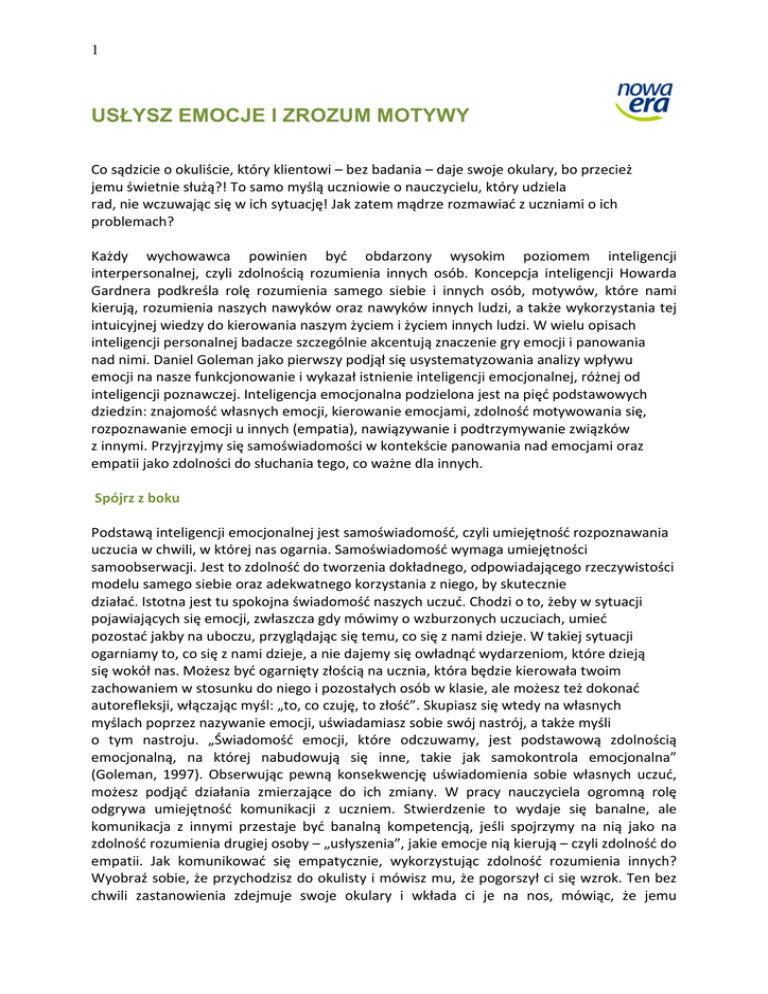 1 USŁYSZ EMOCJE I ZROZUM MOTYWY Co sądzicie o okuliście, który klientowi – bez badania – daje swoje okulary, bo przecież jemu świetnie służą?! To samo myślą uczniowie o nauczycielu, który udziela rad, nie wczuwając się w ich sytuację! Jak zatem mądrze rozmawiać z uczniami o ich problemach? Każdy wychowawca powinien być obdarzony wysokim poziomem inteligencji interpersonalnej, czyli zdolnością rozumienia innych osób. Koncepcja inteligencji Howarda Gardnera podkreśla rolę rozumienia samego siebie i innych osób, motywów, które nami kierują, rozumienia naszych nawyków oraz nawyków innych ludzi, a także wykorzystania tej intuicyjnej wiedzy do kierowania naszym życiem i życiem innych ludzi. W wielu opisach inteligencji personalnej badacze szczególnie akcentują znaczenie gry emocji i panowania nad nimi. Daniel Goleman jako pierwszy podjął się usystematyzowania analizy wpływu emocji na nasze funkcjonowanie i wykazał istnienie inteligencji emocjonalnej, różnej od inteligencji poznawczej. Inteligencja emocjonalna podzielona jest na pięć podstawowych dziedzin: znajomość własnych emocji, kierowanie emocjami, zdolność motywowania się, rozpoznawanie emocji u innych (empatia), nawiązywanie i podtrzymywanie związków z innymi. Przyjrzyjmy się samoświadomości w kontekście panowania nad emocjami oraz empatii jako zdolności do słuchania tego, co ważne dla innych. Spójrz z boku Podstawą inteligencji emocjonalnej jest samoświadomość, czyli umiejętność rozpoznawania uczucia w chwili, w której nas ogarnia. Samoświadomość wymaga umiejętności samoobserwacji. Jest to zdolność do tworzenia dokładnego, odpowiadającego rzeczywistości modelu samego siebie oraz adekwatnego korzystania z niego, by skutecznie działać. Istotna jest tu spokojna świadomość naszych uczuć. Chodzi o to, żeby w sytuacji pojawiających się emocji, zwłaszcza gdy mówimy o wzburzonych uczuciach, umieć pozostać jakby na uboczu, przyglądając się temu, co się z nami dzieje. W takiej sytuacji ogarniamy to, co się z nami dzieje, a nie dajemy się owładnąć wydarzeniom, które dzieją się wokół nas. Możesz być ogarnięty złością na ucznia, która będzie kierowała twoim zachowaniem w stosunku do niego i pozostałych osób w klasie, ale możesz też dokonać autorefleksji, włączając myśl: „to, co czuję, to złość”. Skupiasz się wtedy na własnych myślach poprzez nazywanie emocji, uświadamiasz sobie swój nastrój, a także myśli o tym nastroju. „Świadomość emocji, które odczuwamy, jest podstawową zdolnością emocjonalną, na której nabudowują się inne, takie jak samokontrola emocjonalna” (Goleman, 1997). Obserwując pewną konsekwencję uświadomienia sobie własnych uczuć, możesz podjąć działania zmierzające do ich zmiany. W pracy nauczyciela ogromną rolę odgrywa umiejętność komunikacji z uczniem. Stwierdzenie to wydaje się banalne, ale komunikacja z innymi przestaje być banalną kompetencją, jeśli spojrzymy na nią jako na zdolność rozumienia drugiej osoby – „usłyszenia”, jakie emocje nią kierują – czyli zdolność do empatii. Jak komunikować się empatycznie, wykorzystując zdolność rozumienia innych? Wyobraź sobie, że przychodzisz do okulisty i mówisz mu, że pogorszył ci się wzrok. Ten bez chwili zastanowienia zdejmuje swoje okulary i wkłada ci je na nos, mówiąc, że jemu 2 doskonale służą od kilku lat. Oczywiście, tobie widzenie nie poprawia się dzięki tym okularom, a nawet widzisz w nich gorzej. Okulista nie może wyjść ze zdziwienia – jak to, przecież jemu od lat doskonale poprawiają wzrok! Może powinieneś się bardziej postarać, żeby lepiej widzieć w tych okularach? Odkładając okulary na biurko, okazujesz się niewdzięcznikiem. Nie skorzystałeś z pomocy świetnego specjalisty, który na sobie wypróbował działanie proponowanych ci okularów. Czy kiedykolwiek jeszcze przyjdziesz do specjalisty, który zamiast postawić diagnozę i dowiedzieć się, jakie są twoje dolegliwości oraz potrzeby, od razu zaaplikował rozwiązanie? Rozwiązanie najlepsze dla niego, ale czy na pewno najlepsze dla ciebie? Spróbuj zrozumieć Czasami tak właśnie wygląda nasza komunikacja z innymi. Zamiast ich wysłuchać, zebrać informacje i na ich podstawie postawić diagnozę, od razu dajemy gotowe rozwiązania – przepisujemy leki bez rzetelnego rozpoznania. Kiedy przychodzi uczeń, jesteśmy gotowi do dania mu „dobrej rady” – zwykle takiej, która sprawdziła się w naszym życiu czy zadziałała w przypadku innych uczniów. Oznacza to, że spieszymy się z diagnozą. Na początku trzeba zrozumieć, o co tak naprawdę chodzi i jaki jest problem tego konkretnego ucznia. Według Stephena R. Coveya, autora 7 nawyków skutecznego działania, kluczem empatycznej komunikacji z innymi ludźmi jest zasada: „staraj się najpierw zrozumieć innych, potem być zrozumianym”. Jeśli chcesz skutecznie współdziałać ze swoimi uczniami i wpływać na nich, musisz ich najpierw zrozumieć. Wiele lat zajmuje nam nauka mówienia, pisania, czytania, ale kto z nas tak naprawdę trenuje sztukę słuchania innych? Taki trening należy zacząć od zbudowania dobrego kontaktu z samym sobą. Słuchanie empatyczne to nie tylko słuchanie aktywne, które wykorzystuje pewne techniki, ale również słuchanie z intencją zrozumienia. Chodzi o to, by starać się najpierw zrozumieć – przyjąć punkt widzenia drugiej osoby, zrozumieć świat tak, jak ona go aktualnie odbiera. Nie oznacza to, że musisz się ze swoim rozmówcą zgadzać czy okazywać mu sympatię. Słuchanie empatyczne oznacza, że kogoś głęboko i w pełni rozumiesz, zarówno intelektualnie, jak i emocjonalnie. Wymaga ono nie tylko usłyszenia i zarejestrowania słów drugiej osoby, ale także usłyszenia jej uczuć i myśli. Jak powiedział lis z Małego Księcia: „dobrze widzi się tylko sercem, najważniejsz