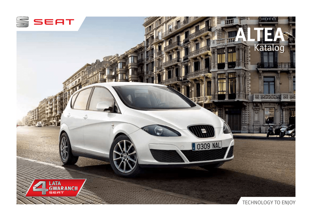 ALTEA Katalog TECHNOLOGY TO ENJOY TU ZACZYNA SIĘ PRZYGODA Przygoda ma wiele twarzy. Chciałbyś poszerzać horyzonty, a może planujesz powiększenie rodziny? Projektując Alteę, zadaliśmy sobie kilka ważnych pytań: czy samochód niezawodny może być ekscytujący, a praktyczny naprawdę przygodowy? Odpowiedź brzmi… Tak! Rodzina Altei to samochody doskonałe na bezdroża i na asfalt. Bezpieczne i wyśmienicie trzymające się drogi. Wystarczająco przestronne, by pomieścić coraz większą rodzinę. Łatwe do wsiadania i wysiadania, a także przygotowane na najtrudniejsze warunki drogowe. Nieważne, jakie masz plany – początek przygody nie musi oznaczać pożegnania ze stylem. Przywitaj się z nową Alteą! POMYŚL O WIELKOŚCI W formacie XL Rodzina się powiększa. Dzieci rosną. Liczba niezbędnych rzeczy nie ma końca, a na najkrótszy wypad szykujesz się jak na wielką wyprawę. Kiedy duży samochód przestaje być wystarczająco duży, czas pomyśleć o rozmiarze XL. Altea XL jest naprawdę XL. Przestronna, z sufitem wysoko ponad głowami pasażerów i podwyższonym siedzeniem kierowcy. Długa, a konkretnie o 18,76 cm dłuższa niż standardowy model, co oznacza dodatkowe 123 litry przestrzeni i bagażnik o całkowitej pojemności 532 litrów. Jednym słowem – ogromny. Choć z zewnątrz na to nie wygląda, jest to jeden z najbardziej przestronnych samochodów w swojej klasie. Efektowna, sportowa sylwetka samochodu i precyzyjne prowadzenie to charakterystyczne cechy SEAT-a. Altea XL jest doskonale wyważona i stabilna, co sprawia, że jazda jest prawdziwą przyjemnością. Odwiezienie dzieci do szkoły, zakupy czy wizyta u rodziny to dobry pretekst, by znów usiąść za kierownicą. Być szoferem rodziny to teraz prawdziwa frajda! WSZYSTKO NA MIEJSCU Dużo miejsca! Naprawdę Gdyby istniała międzynarodowa norma dotycząca schowków i skrytek, Altea na pewno byłaby najlepsza w swojej klasie. Ma ich ponad 30! Znajdziesz je pod sufitem, pod siedzeniami i w podłokietnikach. Nie są to zwyczajne zakamarki – każdy z nich został starannie przemyślany i zaprojektowany. Na przykład schowki w przednich drzwiach mogą pomieścić butelkę o pojemności 1,5 litra. Jednak najważniejsza rzecz to bagażnik o pojemności 409 litrów w Altei i 532 litrów w Altei XL i Freetrack. I to jeszcze nie koniec! Można przesunąć i złożyć każde z trzech tylnych siedzeń, aby w razie potrzeby uzyskać więcej przestrzeni. Doceniając pakowność Altei, nie zapomnij też o możliwości przechowywania danych cyfrowych! Doskonale zaprojektowane, funkcjonalne wnętrze zawiera, opcjonalnie, system SEAT Media System 2.2 obejmujący: ekran dotykowy, cyfrowe radio DAB (z możliwością zaprogramowania ulubionych stacji), nawigację (zapisującą informacje o trasie), a także Bluetooth® i gniazdo karty SD (większa pamięć!). ALTEA I-TECH Pionierzy w dziedzinie komfortu i łączności Technologię I-TECH cechuje komfort i nowoczesna technologia. Odkryj wyjątkowe funkcje, w tym wbudowany w sufit ekran TFT LCD, spryskiwacze reflektorów, przedni i tylny czujnik parkowania, sterowane elektrycznie SPRYSKIWACZE REFLEKTORÓW. Spryskiwacze reflektorów zapewniają, że dojedziesz bezpiecznie do domu, nawet gdy Twoja Altea jest brudna. i podgrzewane zewnętrzne lusterka oraz wbudowany Bluetooth, połączony z ekranem dotykowym Media System. Podróż samochodem SEAT Altea zapewnia szczęście i bezpieczeństwo, a technologia I-TECH dostarcza wszystko, czego możesz potrzebować w trakcie najprzyjemniejszej przejażdżki. SCHOWEK W SUFICIE + EKRAN TFT. Wbudowany ekran TFT zmienia twoją Alteę w prywatne kino. Zawiera również schowek na drobne przedmioty. EKRAN DOTYKOWY SEAT MEDIA SYSTEM 2.2 Bądź w ciągłym kontakcie dzięki radiu DAB, nawigacji oraz technologii Bluetooth. BOHATEROWIE DRÓG WIELKA MOC A z nią – wielka odpowiedzialność Silniki Altei nie bez powodu są potężne. To oni dbają o Twoje bezpieczeństwo! Zaprojektowano je tak, aby były w stanie sprostać wszystkim Twoim planom. Altea i Altea XL oferują wybór spośród dwóch SYSTEM START/STOP. Ten system pozwala Ci oszczędzać paliwo i ograniczać emisję CO2. najwyższej klasy silników benzynowych. ZATRZYMAJ AUTO Pierwszy z nich to 1.2 TSI o mocy 105 KM USTAW BIEG W POZYCJI NEUTRALNEJ AFS. ABS. TCS. ESC. EBA. Do tej pory te niesamowite, ratujące życie technologie były jedynie tajemniczymi skrótowcami. Czas je docenić! To dzięki nim, sześciu poduszkom powietrznym w standardzie i systemowi mocowania fotelików dziecięcych iSOFIX Altea z systemem Start/Stop, ze zmniejszoną do poziomu 132 g/km emisją CO2. Drugi to 1.4 TSI o mocy uzyskała maksymalną liczbę pięciu gwiazdek w testach 125 KM – obecnie jeden z najmocniejszych silników organizacji Euro NCAP*. Poznaj system adaptacji przednich świateł AFS i biksenonowe reflektory przednie oświetlające drogę w swojej klasie, który pozwala na rozwinięcie prędkości nawet do 194 km/h. w kierunku, w którym zmierza pojazd. Świetna sprawa. OFF Przedstawiamy również ABS i TCS, czyli system zapobiegania blokowaniu kół podczas hamowania i system wspomagający Możesz również wybierać spośród silników diesla :&,Ă1,-635=þ*á2 :5=8ü3,(5:6=<%,(* z wtryskiem Common Rail. Jednym z nich jest mocny Nie można również zapomnieć o ESC i EBA. Elektroniczny Program stałych DPF. Najniższy poziom (jedynie 119 g/km) Stabilizujący toru jazdy i system wspomagania hamowania emisji CO2 zapewnia silnik 1.6 TDI CR 105 KM awaryjnego, dostępne w wyposażeniu standardowym, ON zapewniają pewne prowadzenie pojazdu i skuteczne hamowanie. wersji Altea XL i Freetrack jest silnik diesla 2.0 TDI CR 140 KM z imponującym napędem na cztery koła. utrzymanie właściwego toru jazdy, zapewniające maksymalną kontrolę i niedopuszczające do niebezpiecznego poślizgu kół. silnik 2.0 TDI 140 KM, wyposażony w filtr cząstek Ecomotive. Silnikiem dostępnym wyłącznie dla 