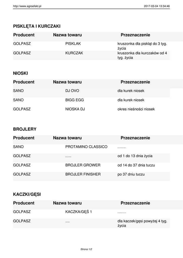 http://www.agroefekt.pl 2017-03-04 13:34:46 PISKLĘTA I KURCZAKI Producent Nazwa towaru GOLPASZ PISKLAK GOLPASZ KURCZAK Przeznaczenie kruszonka dla piskląt do 3 tyg. życia kruszonka dla kurczaków od 4 tyg. życia NIOSKI Producent Nazwa towaru Przeznaczenie SANO DJ OVO dla kurek niosek SANO BIGG EGG dla kurek niosek GOLPASZ NIOSKA DJ okres nieśności niosek BROJLERY Producent SANO GOLPASZ Nazwa towaru PROTAMINO CLASSICO Przeznaczenie premiks 25-30% dla brojlerów od 1 do 13 dnia życia BROJLER STARTER GOLPASZ BROJLER GROWER od 14 do 37 dnia tuczu GOLPASZ BROJLER FINISHER po 37 dniu tuczu KACZKI/GĘSI Producent GOLPASZ GOLPASZ Nazwa towaru KACZKA/GĘŚ 1 Przeznaczenie dla kaczek/gęsi do 3 tyg. życia dla kaczek/gęsi powyżej 4 tyg. życia KACZKA/GĘŚ 2 Strona 1/2 http://www.agroefekt.pl 2017-03-04 13:34:46 Strona 2/2