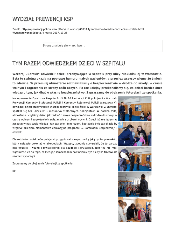 WYDZIAŁ PREWENCJI KSP Źródło: http://wprewencji.policja.waw.pl/wp/aktualnosci/46033,Tym-razem-odwiedzilem-dzieci-w-szpitalu.html Wygenerowano: Sobota, 4 marca 2017, 13:26 Strona znajduje się w archiwum. TYM RAZEM ODWIEDZIŁEM DZIECI W SZPITALU Wczoraj „Borsuk” odwiedził dzieci przebywające w szpitalu przy ulicy Niekłańskiej w Warszawie. Była to świetna okazja na poprawę humoru małych pacjentów, a przecież wszyscy wiemy że śmiech to zdrowie. W przemiłej atmosferze rozmawialiśmy o bezpieczeństwie w drodze do szkoły, w czasie wolnym i zagrożeniu ze strony osób obcych. Po raz kolejny przekonaliśmy się, że dzieci bardzo dużo wiedzą o tym, jak dbać o własne bezpieczeństwo. Zapraszamy do obejrzenia fotorelacji ze spotkania. Na zaproszenie Dyrektora Zespołu Szkół Nr 86 Pani Alicji Kott policjanci z Wydziału Prewencji Komendy Stołecznej Policji i Komendy Rejonowej Policji Warszawa VII odwiedzili dzieci przebywające w szpitalu przy ul. Niekłańskiej w Warszawie. Z uczniami spotkał się też „Borsuk” – maskotka stołecznych policjantów. W bardzo miłej atmosferze uczyliśmy dzieci jak zadbać o swoje bezpieczeństwo w drodze do szkoły, w czasie wolnym i zagrożeniach związanych z osobami obcymi. Dzieci już nie jeden raz zaskoczyły nas swoją wiedzą i tak też było i tym razem. Spotkanie było też okazją by wręczyć dzieciom elementarze edukacyjne programu „Z Borsukiem Bezpieczniej” i odblaski. Dla rodziców i opiekunów policjanci przygotowali niespodziankę jaką był tor przeszkód, który należało pokonać w alkogoglach. Wszyscy zgodnie stwierdzili, że to bardzo interesujące i ważne doświadczenie dla każdego kierującego. Nikt też nie miał wątpliwości co do tego, że kierując samochodem powinniśmy być nie tylko trzeźwi ale również wypoczęci. Zapraszamy do obejrzenia fotorelacji ze spotkania. pp Ocena: 0/5 (0) Tweetnij