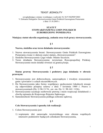 TEKST JEDNOLITY uwzględniający zmiany wynikające z uchwały Nr 36/V/SGPEP/2003 V Zebrania Delegatów Stowarzyszenia Gmin Polskich Euroregionu Pomerania z dnia 15.10.2003 r. STATUT STOWARZYSZENIA GMIN POLSKICH EUROREGIONU POMERANIA Niniejszy statut określa organizację, zadania oraz tryb pracy stowarzyszenia. §1 Nazwa, siedziba oraz teren działania stowarzyszenia: 1. Nazwa stowarzyszenia brzmi: Stowarzyszenie Gmin Polskich Euroregionu Pomerania zwane w dalszej części statutu „Stowarzyszeniem”. 2. Siedziba Stowarzyszenia i jego władz: Miasto Szczecin. 3. Teren działania Stowarzyszenia: terytorium Rzeczpospolitej Polskiej. Stowarzyszenie może działać również za granicą kraju. §2 Status prawny Stowarzyszenia i podstawy jego działania w obrocie prawnym: 1. Stowarzyszenie jest dobrowolnym, samorządnym i trwałym zrzeszeniem gmin i powiatów o celach niezarobkowych. 2. Do Stowarzyszenia jako formy współpracy społeczności lokalnych stosuje się odpowiednio przepisy ustawy z dnia 7 kwietnia 1989 r. Prawo o stowarzyszeniach (Dz. U.96.13.74., ost. zm. Dz. U. 98.162. 1126). 3. Stowarzyszenie uzyskuje osobowość prawną i może rozpocząć działalność z chwilą wpisania do Krajowego Rejestru Sądowego. 4. Samodzielność Stowarzyszenia podlega ochronie sądowej. §3 Cele Stowarzyszenia i sposoby ich realizacji: 1. Celem Stowarzyszenia jest: 1) wspieranie idei samorządu terytorialnego oraz obrona wspólnych interesów podmiotów będących członkami Stowarzyszenia, 1 2) inicjowanie przygotowanie i realizacja na terytorium zrzeszonych w Stowarzyszeniu gmin i powiatów wspólnych przedsięwzięć służących rozwojowi współpracy samorządów, 3) informowanie społeczności lokalnych o idei integracji europejskiej oraz o strukturze i funkcjonowaniu Unii Europejskiej, 4) koordynowanie i wspieranie współpracy przygranicznej w regionie, 5) pozyskiwanie i wykorzystywanie środków pomocowych Unii Europejskiej oraz innych krajowych i międzynarodowych instytucji finansowych dla realizacji celów Stowarzyszenia, 6) wykonywanie zadań określonych w podpisywanych przez Stowarzyszenie umowach i porozumieniach, 7) realizacja innych przedsięwzięć promujących ideę samorządności i integracji europejskiej. 2. Stowarzyszenie realizuje cele poprzez: 1) reprezentowanie interesów samorządów na forum ogólnopaństwowym i międzynarodowym, 2) podejmowanie inicjatyw, promowanie oraz aktywne popieranie wszelkich działań mających na celu rozwój przedsiębiorczości samorządów w oparciu o środki pomocowe Unii Europejskiej oraz innych krajowych i międzynarodowych instytucji finansowych, 3) inspirowanie i podejmowanie wspólnych inicjatyw służących społecznogospodarczemu rozwojowi gmin i powiatów, nawiązywanie kontaktów zagranicznych na poziomie Euroregionu, 4) prowadzenie pracy informacyjnej, konsultacyjnej i programowej mającej na celu wspólne rozwiązywanie problemów w zakresie poszczególnych dziedzin działalności samorządu terytorialnego, 5) prowadzenie działalności wydawniczej, szkoleniowej i promocyjnej dotyczącej problematyki Stowarzyszenia i jego członków, 6) organizację szkoleń, konferencji, seminariów, wystaw, wyjazdów studyjnych oraz prezentacji, 7) upublicznianie przedsięwzięć Stowarzyszenia w prasie, radiu i telewizji, 8) zarządzanie funduszami Unii Europejskiej. §4 Nabycie członkostwa Stowarzyszenia: 1. Członkowie Stowarzyszenia dzielą się na: a/ zwyczajnych, b/ wspierających, c/ honorowych. 2 2. Członkami zwyczajnym mogą być gminy i powiaty. 3. Członkiem wspierającym i honorowym może być: osoba prawna, pełnoletnia osoba fizyczna mająca pełną zdolność do czynności prawnych, bądź inny podmiot lub jednostka organizacyjna nie posiadająca osobowości prawnej. 4. Członkowie nabywają członkostwo Stowarzyszenia w wyniku przyjęcia kandydatury przez Zebranie Delegatów w drodze uchwały podejmowanej zwykłą większością głosów. Członkostwo honorowe może być nadane w uznaniu zasług dla realizacji celów i zadań Stowarzyszenia. Członek honorowy zwolniony jest z obowiązku opłacania składek członkowskich. 5. Członkowie założyciele stowarzyszenia - gminy tworzące Komunalny Związek Celowy Gmin Pomorza Zachodniego „Pomerania”, które w drodze uchwały Rady Gminy wyrażą wolę założenia stowarzyszenia – uzyskują członkostwo automatycznie z chwilą uzyskania przez Stowarzyszenie podmiotowości prawnej. 6. Członkowie zwyczajni uczestniczą w Stowarzyszeniu poprzez wybranego przez siebie – na okres równy kadencji jednostek samorządu terytorialnego – Delegata (Delegatów). Liczba przedstawicieli danej jednostki samorządu terytorialnego zależy od liczby mieszkańców i tak: 1) 1 delegat z gmin o liczbie mieszkańców do 10.000, 2) 2 delegatów z gmin o liczbie mieszkańców do 50.000, 3) 3 delegatów z gmin o liczbie mieszkańców do 100.000 oraz po jednym delegacie na każde dalsze rozpoczęte 100.000 mieszkańców (powyżej 100.000), 4) 1 delegat z powiatów o liczbie mieszkańców do 100.000 oraz po jednym delegacie na każde dalsze rozpoczęte 100.000 mieszkańców. Zasada, o której mowa w pkt 4 nie dotyczy miast na prawach powiatu. 7. Członkowie wspierający i honorowi mają prawo wytypowania po jednym Przedstawicielu. §5 Utrata członkostwa Stowarzyszenia nastąpić może na skutek: 1. Dobrowolnego wystąpienia członka. 2. Usunięcia członka w drodze uchwały Zebrania Delegatów, na skutek uporczywego naruszania statutu, w szczególności zalegania przez co najmniej 3 miesiące, w regulowaniu świadczeń finansowych na rzecz Stowarzyszenia i nie reagowania na pisemne upomnienia. 3. Zgonu, ubezwłasnowolnienia osoby fizycznej, rozwiązania jednostki organizacyjnej lub utraty podmiotowości prawnej. 4. Utrata członkostwa, w przypadkach opisanych w ust. ust. 1 i 3 niniejszego par. następuje automatycznie bez potrzeby podejmowania uchwały. 3 5. Wykreślenie z listy członków ma 