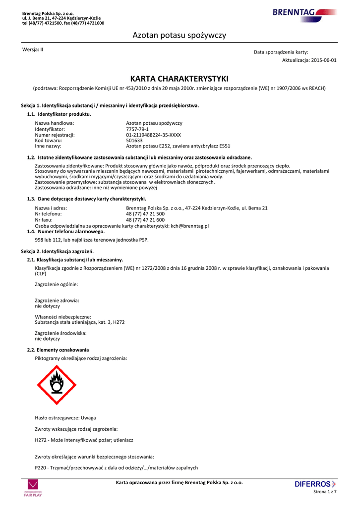 Brenntag Polska Sp. z o.o. ul. J. Bema 21, 47-224 Kędzierzyn-Koźle tel (48/77) 4721500, fax (48/77) 4721600 Azotan potasu spożywczy Wersja: II Data sporządzenia karty: __________ Aktualizacja: 2015-06-01 KARTA CHARAKTERYSTYKI (podstawa: Rozporządzenie Komisji UE nr 453/2010 z dnia 20 maja 2010r. zmieniające rozporządzenie (WE) nr 1907/2006 ws REACH) Sekcja 1. Identyfikacja substancji / mieszaniny i identyfikacja przedsiębiorstwa. 1.1. Identyfikator produktu. Nazwa handlowa: Identyfikator: Numer rejestracji: Kod towaru: Inne nazwy: Azotan potasu spożywczy 7757-79-1 01-2119488224-35-XXXX 501633 Azotan potasu E252, zawiera antyzbrylacz E551 1.2. Istotne zidentyfikowane zastosowania substancji lub mieszaniny oraz zastosowania odradzane. Zastosowania zidentyfikowane: Produkt stosowany głównie jako nawóz, półprodukt oraz środek przenoszący ciepło. Stosowany do wytwarzania mieszanin będących nawozami, materiałami pirotechnicznymi, fajerwerkami, odmrażaczami, materiałami wybuchowymi, środkami myjącymi/czyszczącymi oraz środkami do uzdatniania wody. Zastosowanie przemysłowe: substancja stosowana w elektrowniach słonecznych. Zastosowania odradzane: inne niż wymienione powyżej 1.3. Dane dotyczące dostawcy karty charakterystyki. Nazwa i adres: Brenntag Polska Sp. z o.o., 47-224 Kedzierzyn-Koźle, ul. Bema 21 Nr telefonu: 48 (77) 47 21 500 Nr faxu: 48 (77) 47 21 600 Osoba odpowiedzialna za opracowanie karty charakterystyki: [email protected] 1.4. Numer telefonu alarmowego. 998 lub 112, lub najbliższa terenowa jednostka PSP. Sekcja 2. Identyfikacja zagrożeń. 2.1. Klasyfikacja substancji lub mieszaniny. Klasyfikacja zgodnie z Rozporządzeniem (WE) nr 1272/2008 z dnia 16 grudnia 2008 r. w sprawie klasyfikacji, oznakowania i pakowania (CLP) Zagrożenie ogólnie: Zagrożenie zdrowia: nie dotyczy Własności niebezpieczne: Substancja stała utleniająca, kat. 3, H272 Zagrożenie środowiska: nie dotyczy 2.2. Elementy oznakowania Piktogramy określające rodzaj zagrożenia: Hasło ostrzegawcze: Uwaga Zwroty wskazujące rodzaj zagrożenia: H272 - Może intensyfikować pożar; utleniacz Zwroty określające warunki bezpiecznego stosowania: P220 - Trzymać/przechowywać z dala od odzieży/…/materiałów zapalnych Karta opracowana przez firmę Brenntag Polska Sp. z o.o. Strona 1 z 7 Brenntag Polska Sp. z o.o. ul. J. Bema 21, 47-224 Kędzierzyn-Koźle tel (48/77) 4721500, fax (48/77) 4721600 Azotan potasu spożywczy P370+P378 - W przypadku pożaru: Użyć … do gaszenia. P280 - Stosować rękawice ochronne/odzież ochronną/ochronę oczu/ochronę twarzy. P501 - Zawartość/pojemnik usuwać do upoważnionego odbiorcy odpadów P210 - Przechowywać z dala od źródeł ciepła/iskrzenia/ otwartego ognia/gorących powierzchni. – Palenie wzbronione. 2.3. Inne zagrożenia. Substancja nie spełnia kryteriów PBT lub vPvB zgodnie z załącznikiem XIII Rozporządzenia REACH Sekcja 3. Skład / informacja o składnikach. Skład wg Rozporządzenia 1272/2008. Azotan potasowy >99,5% Nr CAS: 7757-79-1 Nr indeksowy: nie dotyczy Nr WE: 231-818-8 Sekcja 4. Środki pierwszej pomocy. 4.1. Opis środków pierwszej pomocy. Wdychanie: W razie narażenia drogą oddechową zapewnić poszkodowanemu dostęp świeżego powietrza. Kontakt ze skórą: W razie skażenia skóry/odzieży, zdjąć odzież, skażoną skórę zmyć dużą ilością wody. Kontakt z oczami: W razie kontaktu z oczami płukać dużą ilością wody przy szeroko otwartych powiekach. Wezwać pomoc medyczną. Spożycie: W razie spożycia dać poszkodowanemu do picia dużą ilość wody, wywołać wymioty i zapewnić pomoc lekarską. 4.2. Najważniejsze ostre i opóźnione objawy oraz skutki narażenia. Skutki narażenia ostrego: W przypadku narażenia przez drogi oddechowe produkt może powodować podrażnienia układu oddechowego. Objawy mogą obejmować: kaszel, skrócony oddech. W wyniku narażenia przez skórę produkt może działać drażniąco i powodować zaczerwienienie, swędzenie i ból. Zanieczyszczenie oczu powoduje poważne podrażnienia oczu z objawami takimi jak zaczerwienienie i ból. Po połknięciu mogą wystąpić: ból brzucha, zsinienie ust lub paznokci, sina skóra, zawroty głowy i ciężki oddech. Skutki narażenia przewlekłego: U niektórych osób w wyniku przemiany w żołądku azotanu w azotyn może wystąpić methemoglobinemia z objawami tj.: mdłości, wymioty, zawroty głowy, przyspieszone bicie serca, nieregularny oddech, drgawki, śpiączka, śmierć. Długotrwałe narażenie na azotyny może powodować anemię oraz uszkodzenia nerek. 4.3. Wskazania dotyczące wszelkiej natychmiastowej pomocy lekarskiej i szczególnego postępowania z poszkodowanym. Objawy mogą być opóźnione w czasie. Zaleca się obserwację pod nadzorem lekarskim. Sekcja 5. Postępowanie w przypadku pożaru. 5.1. Środki gaśnicze. Odpowiednie środki gaśnicze: Woda, aby zminimalizować moSliwość intensyfikacji poSaru oraz wydzielania się produktów rozkładu azotanu potasu. Niewłaściwe środki gaśnicze: Nie są znane 5.2. Szczególne zagrożenia związane z substancją lub mieszaniną. Azotan potasu wykazuje właściwości utleniające, moSe intensyfikować poSar 5.3. Informacje dla straży pożarnej. Nosić kompletną odzieS ochronną oraz środki ochrony dróg oddechowych z uwagi na ryzyko intensywnego poSaru i produkty rozkładu. Produkt jest utleniający i moSe zwiększać właściwości palne innych łatwopalnych materiałów znajdujących się w pobliSu. Sekcja 6. Postępowanie w przypadku niezamierzonego uwolnienia do środowiska. 6.1. Indywidualne środki ostrożności, wyposażenie ochronne i procedury w sytuacjach awaryjnych. -odzież ochronna, -rękawice ochronne, -okulary ochronne. 6.2. Środki ostrożności w zakresie ochrony środowiska. Karta opracowana przez firmę Brenntag Polska Sp. z o.o. Strona 2 z 7 Brenntag Polska Sp. z o.o. ul. J. Bema 21, 47-224 Kędzierzyn-Koźle tel (48/77) 4721500, fax (48/77) 