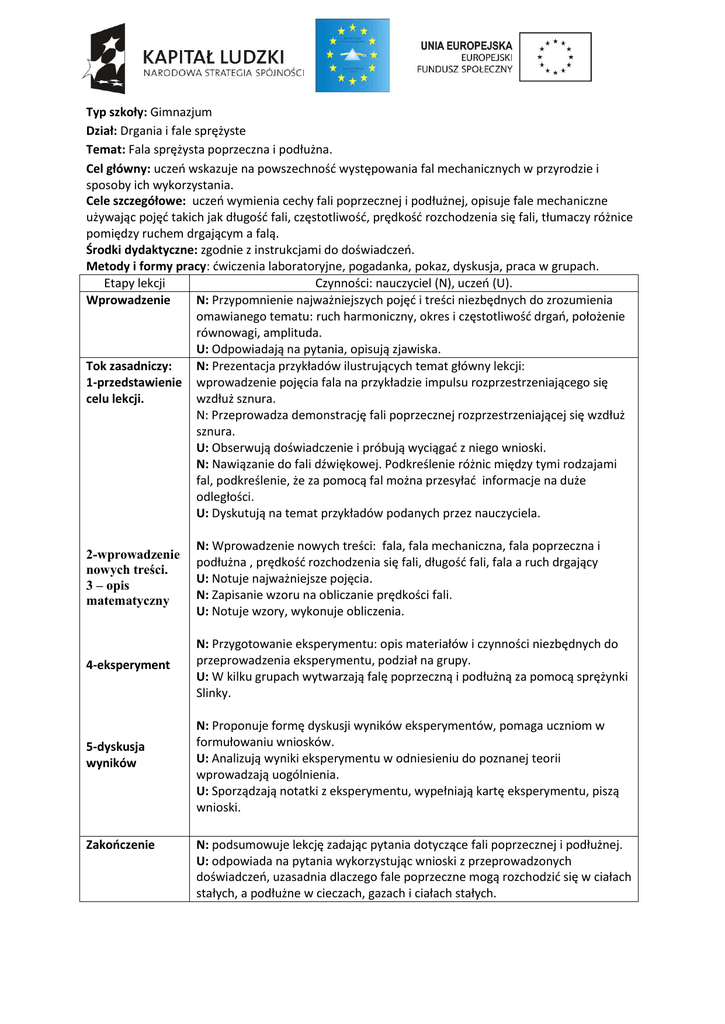 [Wpisz tekst] Typ szkoły: Gimnazjum Dział: Drgania i fale sprężyste Temat: Fala sprężysta poprzeczna i podłużna. Cel główny: uczeń wskazuje na powszechność występowania fal mechanicznych w przyrodzie i sposoby ich wykorzystania. Cele szczegółowe: uczeń wymienia cechy fali poprzecznej i podłużnej, opisuje fale mechaniczne używając pojęć takich jak długość fali, częstotliwość, prędkość rozchodzenia się fali, tłumaczy różnice pomiędzy ruchem drgającym a falą. Środki dydaktyczne: zgodnie z instrukcjami do doświadczeń. Metody i formy pracy: ćwiczenia laboratoryjne, pogadanka, pokaz, dyskusja, praca w grupach. Etapy lekcji Czynności: nauczyciel (N), uczeń (U). Wprowadzenie N: Przypomnienie najważniejszych pojęć i treści niezbędnych do zrozumienia omawianego tematu: ruch harmoniczny, okres i częstotliwość drgań, położenie równowagi, amplituda. U: Odpowiadają na pytania, opisują zjawiska. Tok zasadniczy: N: Prezentacja przykładów ilustrujących temat główny lekcji: 1-przedstawienie wprowadzenie pojęcia fala na przykładzie impulsu rozprzestrzeniającego się celu lekcji. wzdłuż sznura. N: Przeprowadza demonstrację fali poprzecznej rozprzestrzeniającej się wzdłuż sznura. U: Obserwują doświadczenie i próbują wyciągać z niego wnioski. N: Nawiązanie do fali dźwiękowej. Podkreślenie różnic między tymi rodzajami fal, podkreślenie, że za pomocą fal można przesyłać informacje na duże odległości. U: Dyskutują na temat przykładów podanych przez nauczyciela. 2-wprowadzenie nowych treści. 3 – opis matematyczny N: Wprowadzenie nowych treści: fala, fala mechaniczna, fala poprzeczna i podłużna , prędkość rozchodzenia się fali, długość fali, fala a ruch drgający U: Notuje najważniejsze pojęcia. N: Zapisanie wzoru na obliczanie prędkości fali. U: Notuje wzory, wykonuje obliczenia. 4-eksperyment N: Przygotowanie eksperymentu: opis materiałów i czynności niezbędnych do przeprowadzenia eksperymentu, podział na grupy. U: W kilku grupach wytwarzają falę poprzeczną i podłużną za pomocą sprężynki Slinky. 5-dyskusja wyników Zakończenie N: Proponuje formę dyskusji wyników eksperymentów, pomaga uczniom w formułowaniu wniosków. U: Analizują wyniki eksperymentu w odniesieniu do poznanej teorii wprowadzają uogólnienia. U: Sporządzają notatki z eksperymentu, wypełniają kartę eksperymentu, piszą wnioski. N: podsumowuje lekcję zadając pytania dotyczące fali poprzecznej i podłużnej. U: odpowiada na pytania wykorzystując wnioski z przeprowadzonych doświadczeń, uzasadnia dlaczego fale poprzeczne mogą rozchodzić się w ciałach stałych, a podłużne w cieczach, gazach i ciałach stałych. [Wpisz tekst] Karta eksperymentu 1 Temat eksperymentu Instrukcja wykonania Obserwacje (opisujemy w punktach przebieg eksperymentu: przyczyna skutek) Wnioski (odniesienie do teorii) Rozprzestrzenianie się fali poprzecznej wzdłuż sznura. Sporządzić zestaw doświadczalny zgodnie z instrukcją (materiały str…). Uczniowie łapią za końce 3 metrowego sznura i oddalają się od siebie, jednak nie za daleko, tak aby sznur nie był napięty. Jedna osoba stara się trzymać koniec sznura nieruchomo, a druga jedną ręką trzyma za koniec sznura (ciągle w tym samym miejscu) a drugą ręką szarpie za sznur w górę i w dół. Opiszcie co dzieje się ze sznurem i z trzymającymi go osobami. [Wpisz tekst] Karta eksperymentu 2 Temat eksperymentu Instrukcja wykonania Obserwacje (opisujemy w punktach przebieg eksperymentu: przyczyna skutek) Wnioski (odniesienie do teorii) Sprężynka „Slinky”. Sporządzić zestaw doświadczalny zgodnie z instrukcją (materiały str…). Za pomocą sprężynki „slinky” wytwarzamy falę podłużną i poprzeczną. Porównujemy oba rodzaje fal. W jakim kierunku (pionowym, poziomym) rozchodzi się fala poprzeczna i podłużna, a w jakim kierunku odbywają się drgania cząsteczek biorących udział w ruchu falowym.