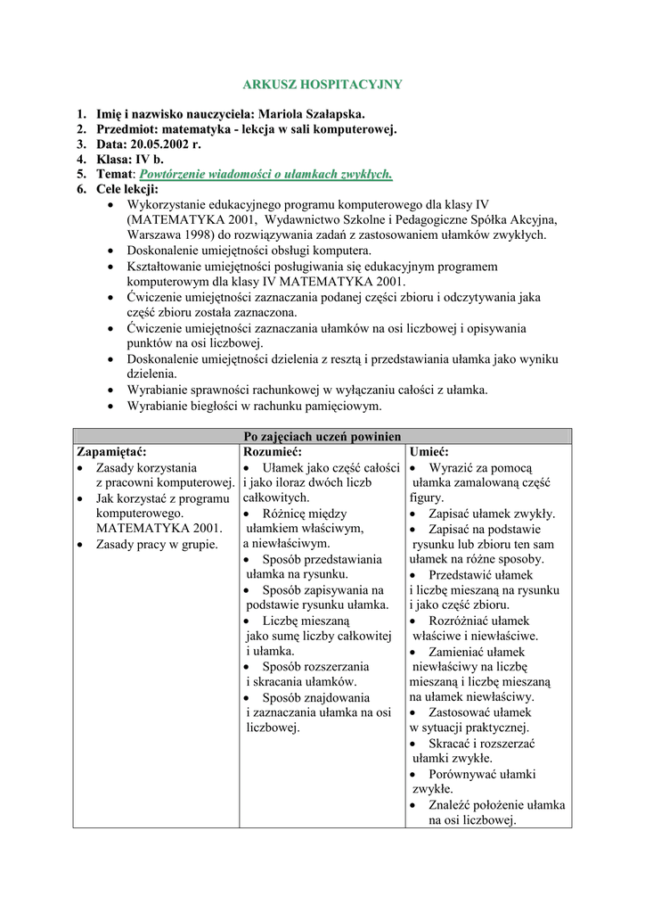 ARKUSZ HOSPITACYJNY 1. 2. 3. 4. 5. 6. Imię i nazwisko nauczyciela: Mariola Szałapska. Przedmiot: matematyka - lekcja w sali komputerowej. Data: 20.05.2002 r. Klasa: IV b. Temat: Powtórzenie wiadomości o ułamkach zwykłych. Cele lekcji: • Wykorzystanie edukacyjnego programu komputerowego dla klasy IV (MATEMATYKA 2001, Wydawnictwo Szkolne i Pedagogiczne Spółka Akcyjna, Warszawa 1998) do rozwiązywania zadań z zastosowaniem ułamków zwykłych. • Doskonalenie umiejętności obsługi komputera. • Kształtowanie umiejętności posługiwania się edukacyjnym programem komputerowym dla klasy IV MATEMATYKA 2001. • Ćwiczenie umiejętności zaznaczania podanej części zbioru i odczytywania jaka część zbioru została zaznaczona. • Ćwiczenie umiejętności zaznaczania ułamków na osi liczbowej i opisywania punktów na osi liczbowej. • Doskonalenie umiejętności dzielenia z resztą i przedstawiania ułamka jako wyniku dzielenia. • Wyrabianie sprawności rachunkowej w wyłączaniu całości z ułamka. • Wyrabianie biegłości w rachunku pamięciowym. Po zajęciach uczeń powinien Rozumieć: Zapamiętać: • Ułamek jako część całości • Zasady korzystania z pracowni komputerowej. i jako iloraz dwóch liczb • Jak korzystać z programu całkowitych. komputerowego. • RóŜnicę między ułamkiem właściwym, MATEMATYKA 2001. a niewłaściwym. • Zasady pracy w grupie. • Sposób przedstawiania ułamka na rysunku. • Sposób zapisywania na podstawie rysunku ułamka. • Liczbę mieszaną jako sumę liczby całkowitej i ułamka. • Sposób rozszerzania i skracania ułamków. • Sposób znajdowania i zaznaczania ułamka na osi liczbowej. Umieć: • Wyrazić za pomocą ułamka zamalowaną część figury. • Zapisać ułamek zwykły. • Zapisać na podstawie rysunku lub zbioru ten sam ułamek na róŜne sposoby. • Przedstawić ułamek i liczbę mieszaną na rysunku i jako część zbioru. • RozróŜniać ułamek właściwe i niewłaściwe. • Zamieniać ułamek niewłaściwy na liczbę mieszaną i liczbę mieszaną na ułamek niewłaściwy. • Zastosować ułamek w sytuacji praktycznej. • Skracać i rozszerzać ułamki zwykłe. • Porównywać ułamki zwykłe. • Znaleźć połoŜenie ułamka na osi liczbowej. 7. Plan zajęć: Etap Planowane czynności 1. Zapoznanie uczniów z zasadami korzystania z pracowni komputerowej. /Uczniowie nie mieli zajęć w pracowni komputerowej, informatyka jako przedmiot w programie nauczania zaplanowana jest w klasie V/. Rozdanie kart z informacją jak obsługiwać się z programem ZADANIA i zapoznanie się z nim. Postać graficzna ułamka zwykłego: Zadaniem ucznia jest odczytywanie, jaka część zbioru lub figury została zaznaczona lub zamalowana oraz zamalowywanie podanej części figury lub zaznaczanie podanej części zbioru. Opisywanie punktów na osi liczbowej. Na ekranie przedstawiona jest oś, powyŜej unoszą się baloniki lub latawce przymocowane do osi liczbowej. Zadaniem ucznia jest wpisanie w okienko balonika współrzędnej ułamkowej, która znajduje się w miejscu połączenia balonika z osią liczbową. Zaznaczanie miejsca na osi liczbowej dla podanych ułamków właściwych i niewłaściwych: Na ekranie przedstawiona jest oś, powyŜej unoszą się baloniki lub latawce z napisanymi ułamkami. Zadaniem ucznia jest przymocowanie baloników we właściwe miejsce na osi. Ćwiczenia w dzieleniu z resztą oraz w zamianie ułamka na liczbę mieszaną lub liczbę naturalną. Zawody między uczniami siedzącymi przy jednym komputerze w rachunku pamięciowym. Refleksja – Co podobało mi się na dzisiejszej lekcji, a co nie ? 2. 3. 4. 5. 6. 7. Uwagi metodyczne Forma: • Praca z całą klasą. • Praca w grupach. • Praca indywidualna. Czas trwania 45 min Metoda: • Praca z komputerem. Pomoce: • Komputer - jedno stanowisko dla dwóch uczniów. • Edukacyjny program komputerowy MATEMATYKA 2001. • Kartki z informacją jak posługiwać się z programem ZADANIA i jak je sprawdzać korzystając z pomocy komentatorów. Opracowanie: Mariola Szałapska